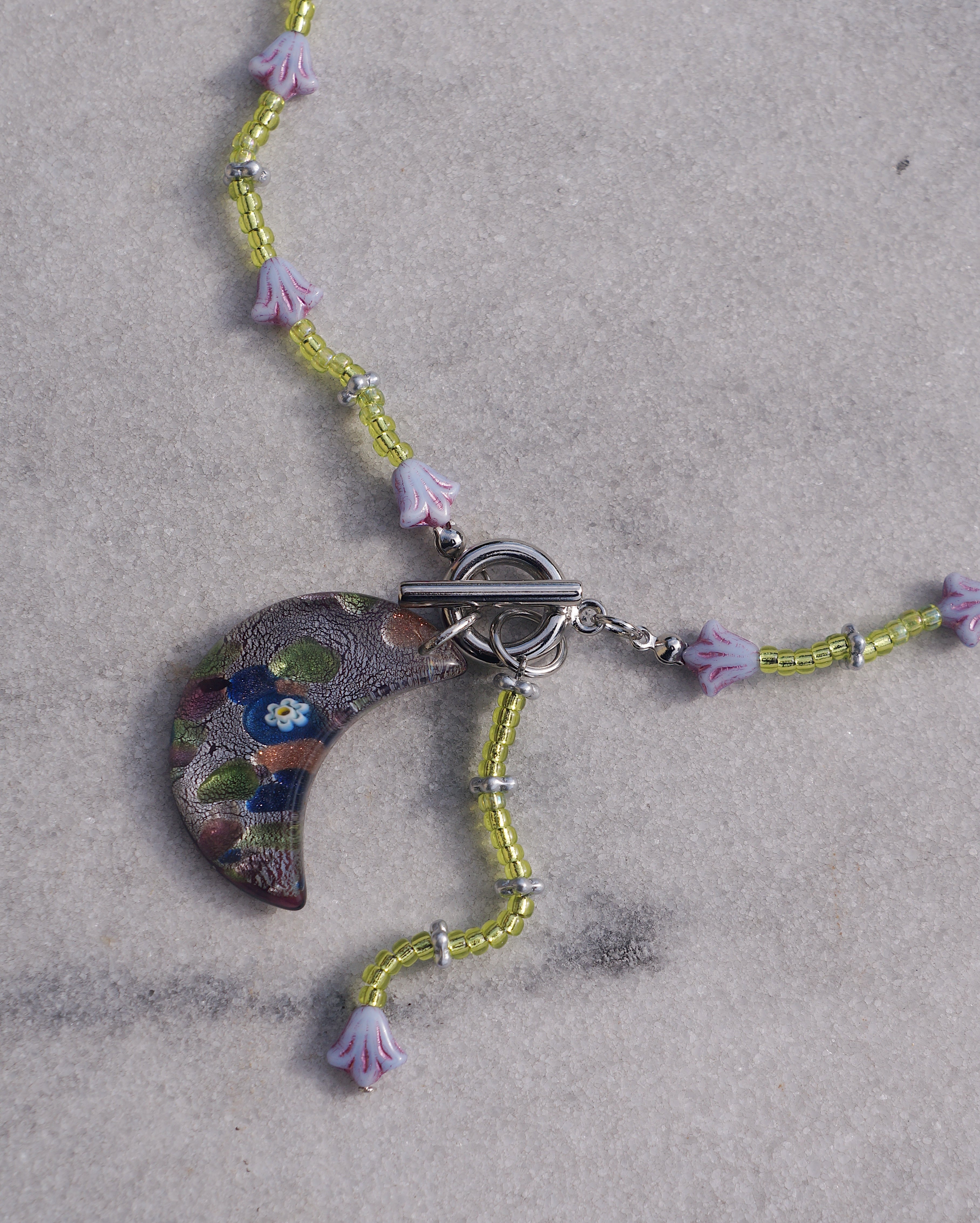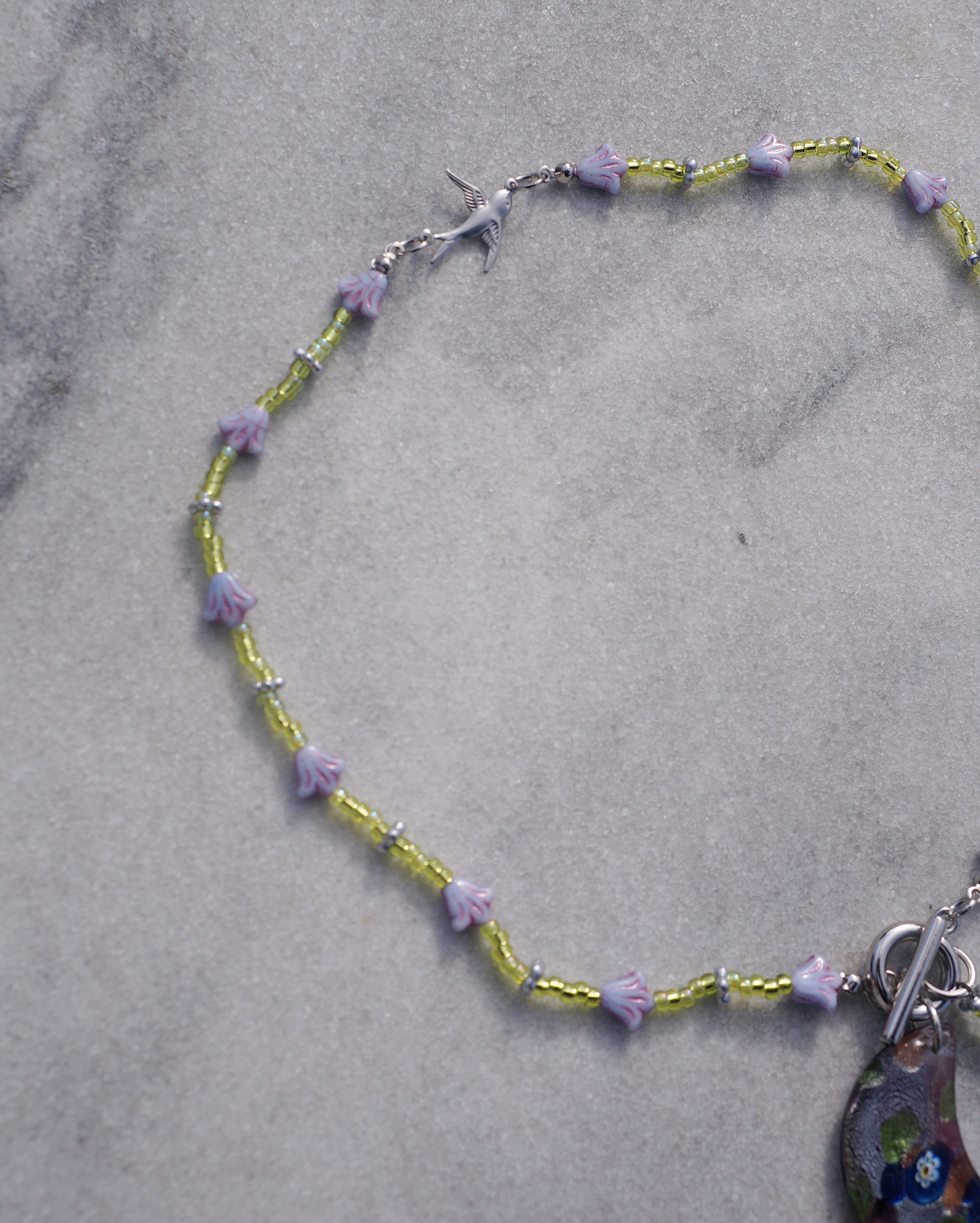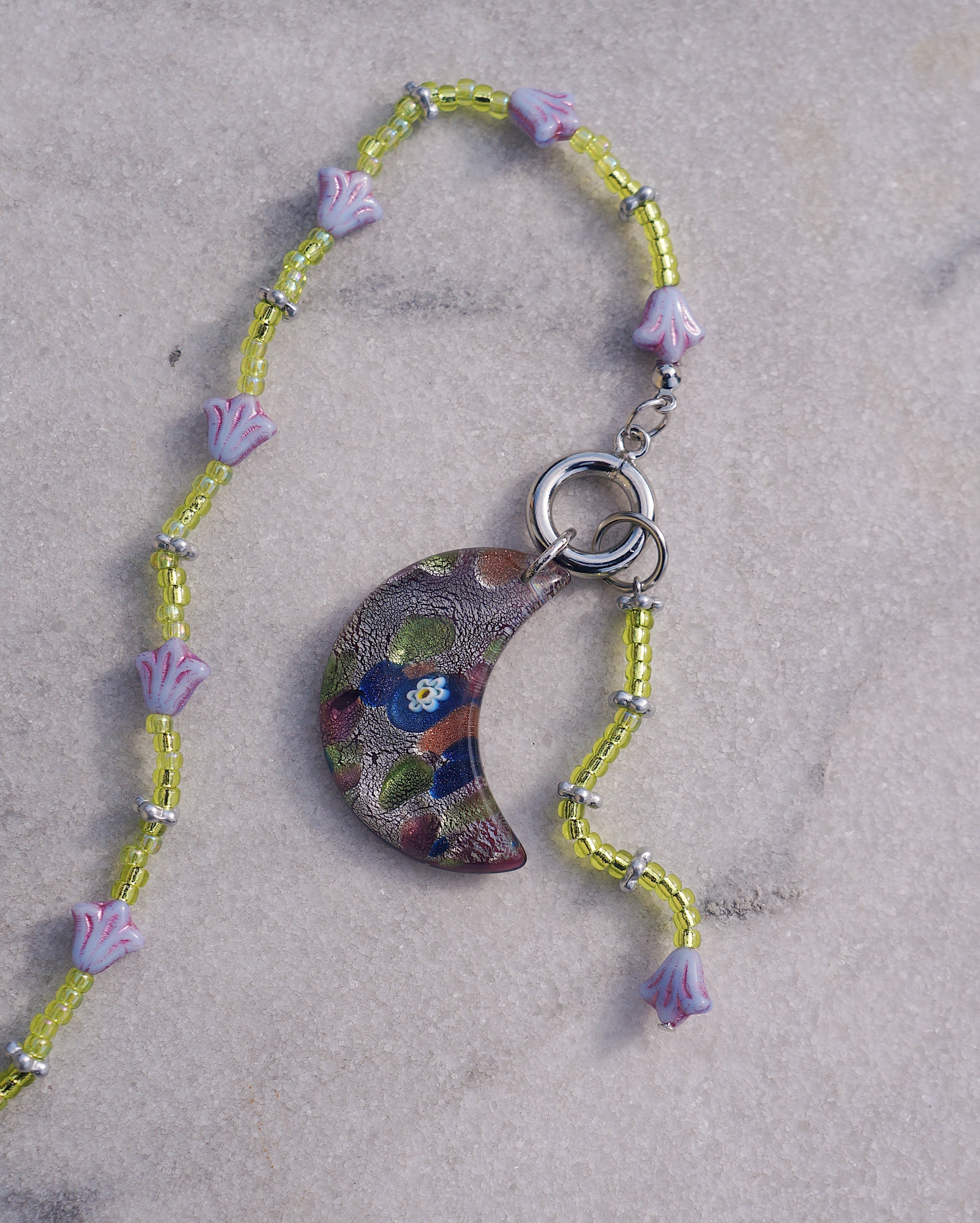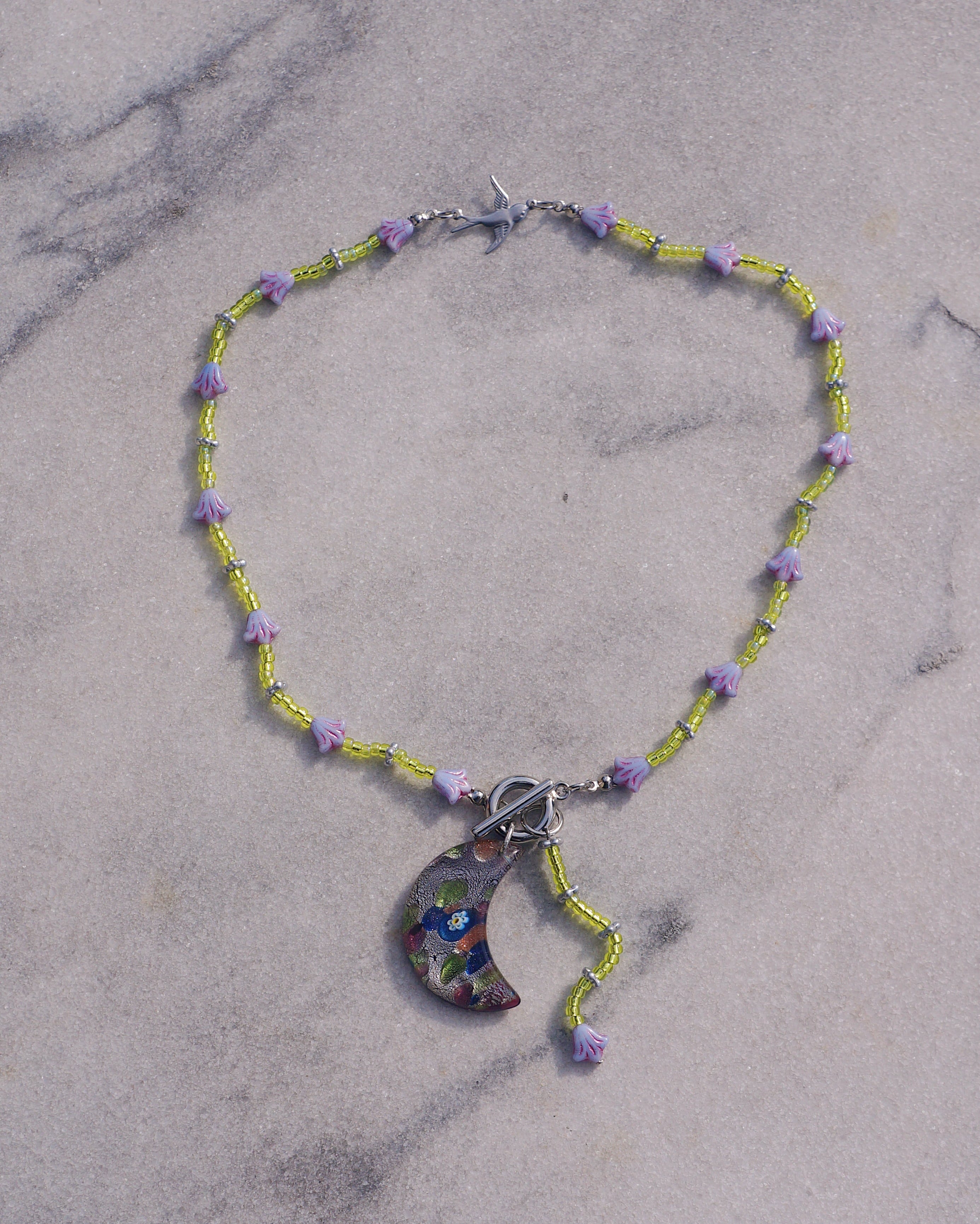 マンテルについているチャームを前に垂らしても、背中に垂らしてもいい2WAYで楽しんでもらえるネックレスです。マンテルには大きめの月のモチーフのガラスチャーム、首周りにはチェコビーズのお花、中央にはつばめのチャームがついています。紫とグリーンのカラーコンビネーションが美しく、ユニークなデザインでありながらどんなスタイリングにも合わせやすい一点です。