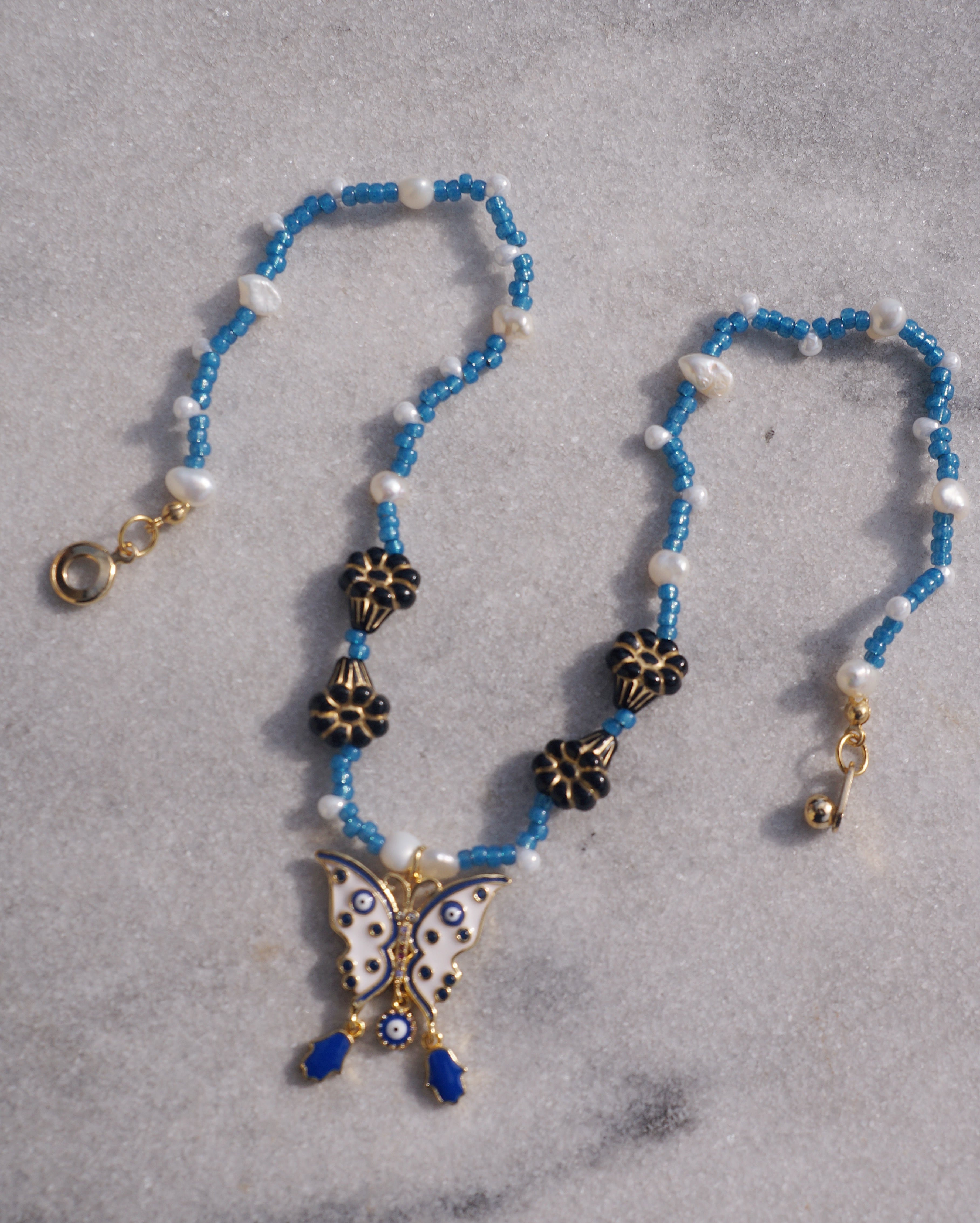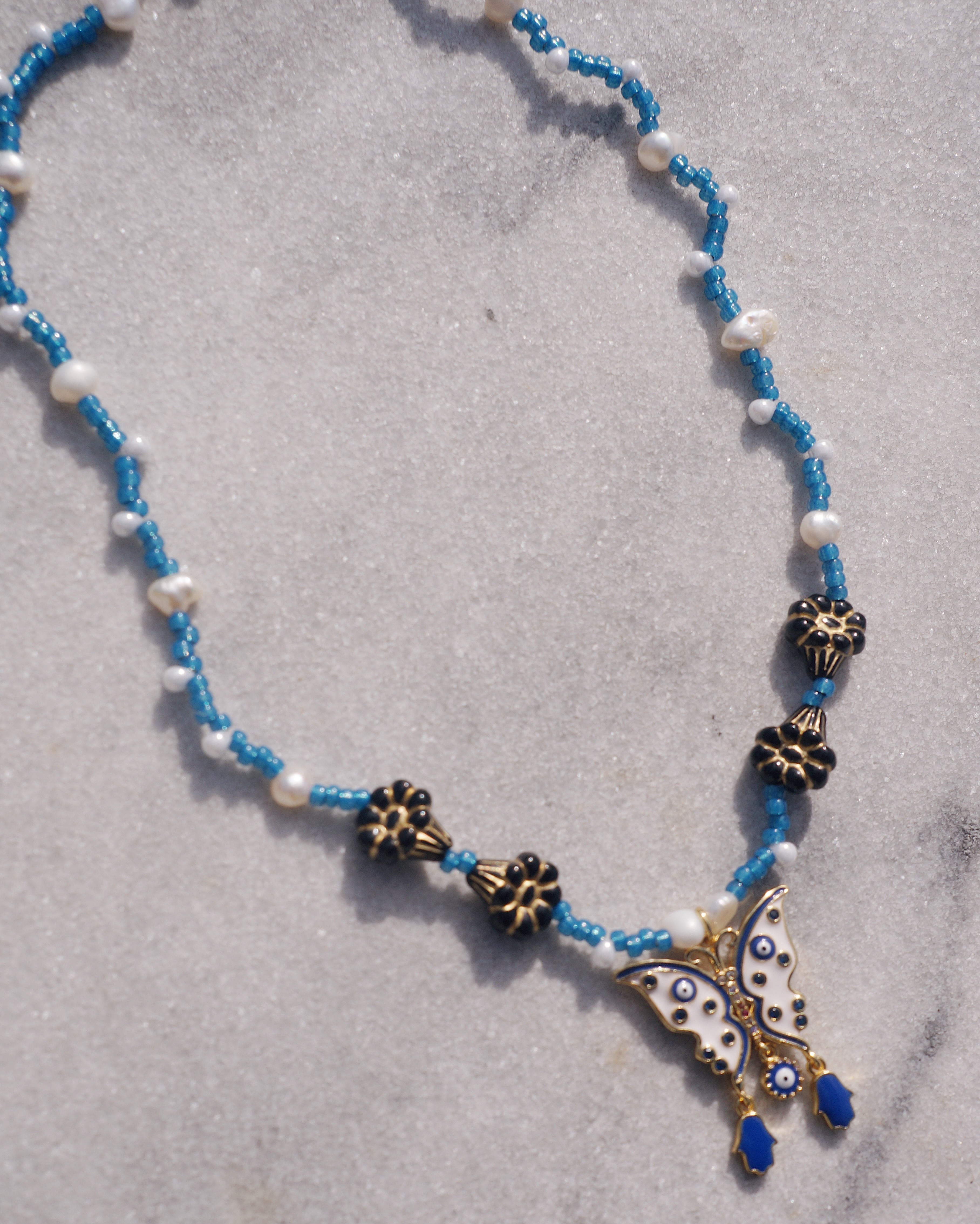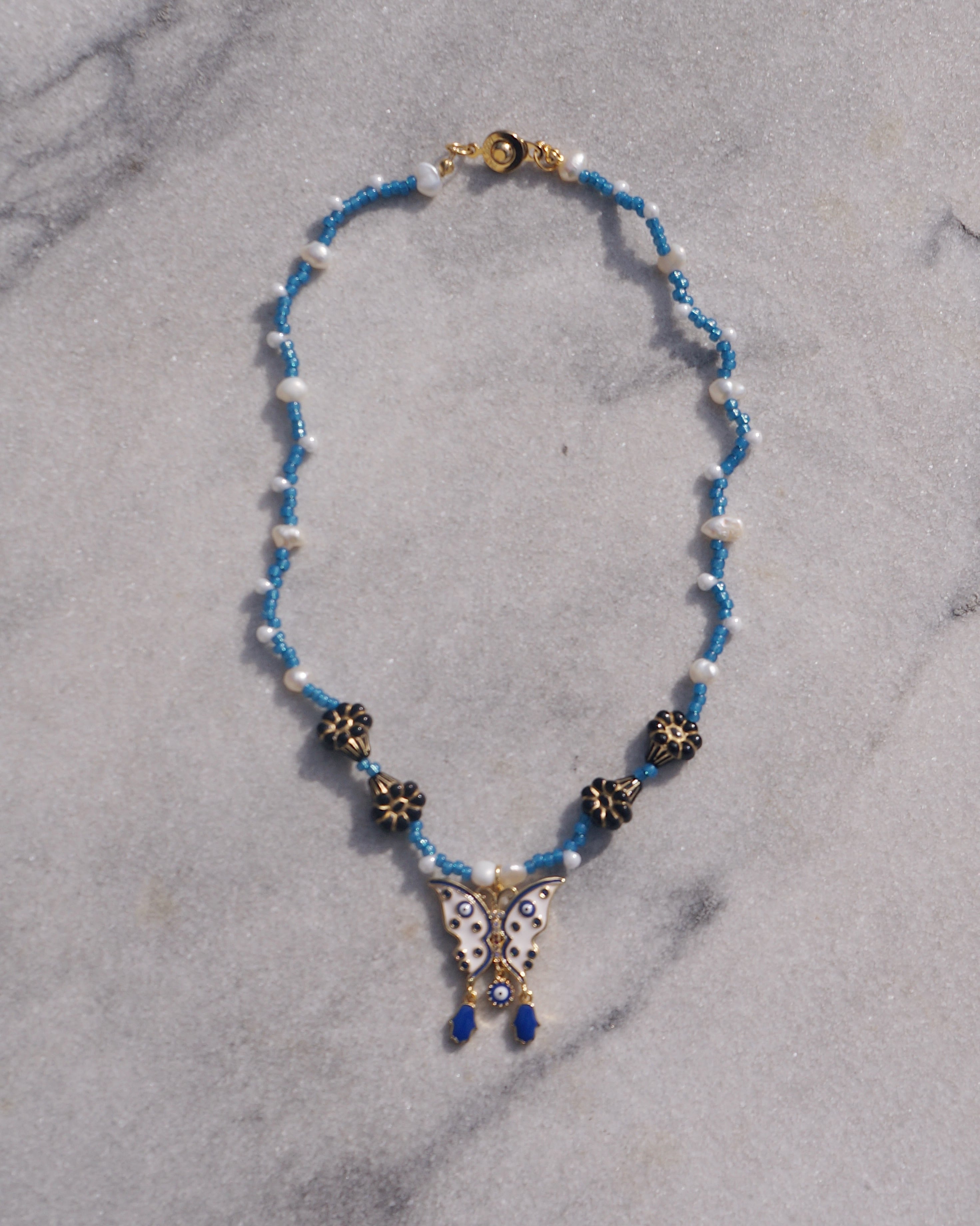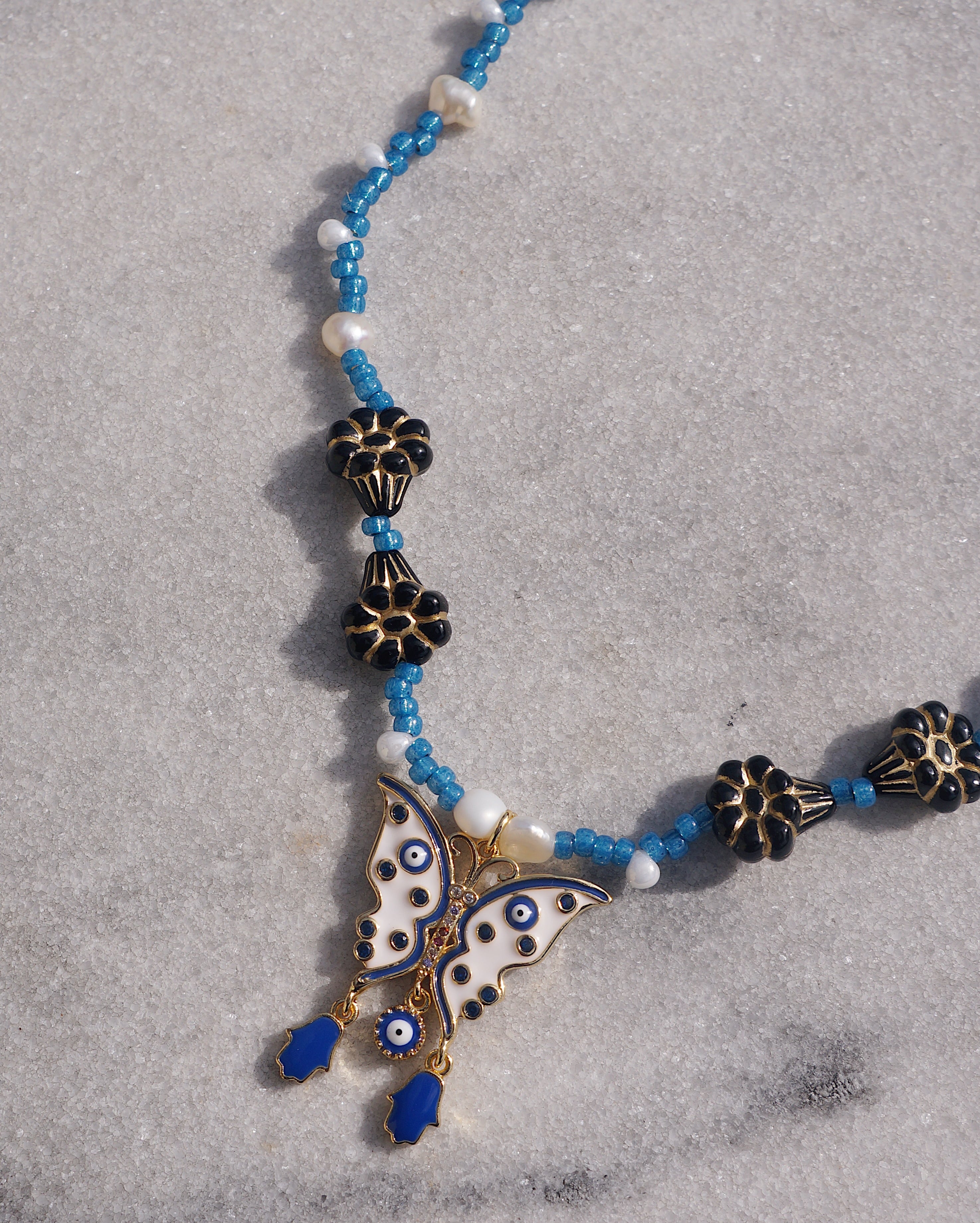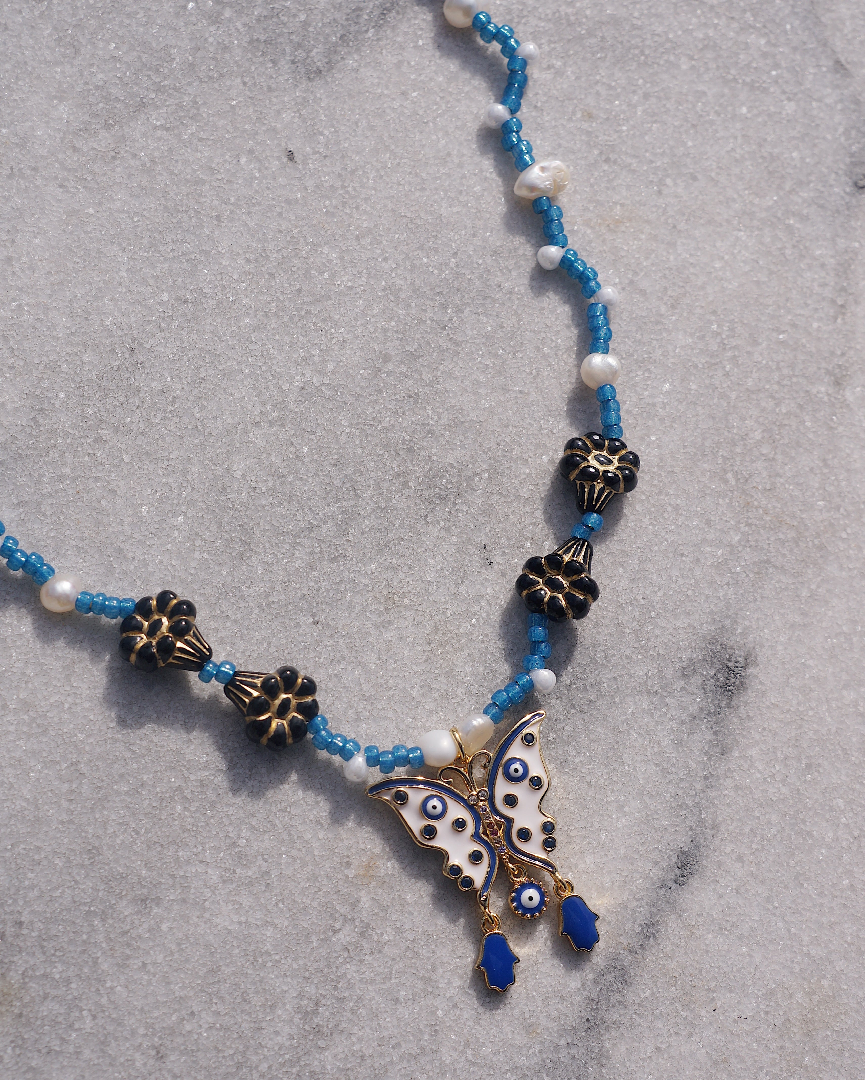 蝶に目玉と手(ハムサ)のついた個性的なチャームをデザインのメインにしました。ハムサとは邪視から身を守るためのお守りとも言われています。チャームに合わせ首周りには鮮やかなブルーのビーズと淡水パール、美しいお花のチェコビーズをあしらい妖艶なデザインの一点です。