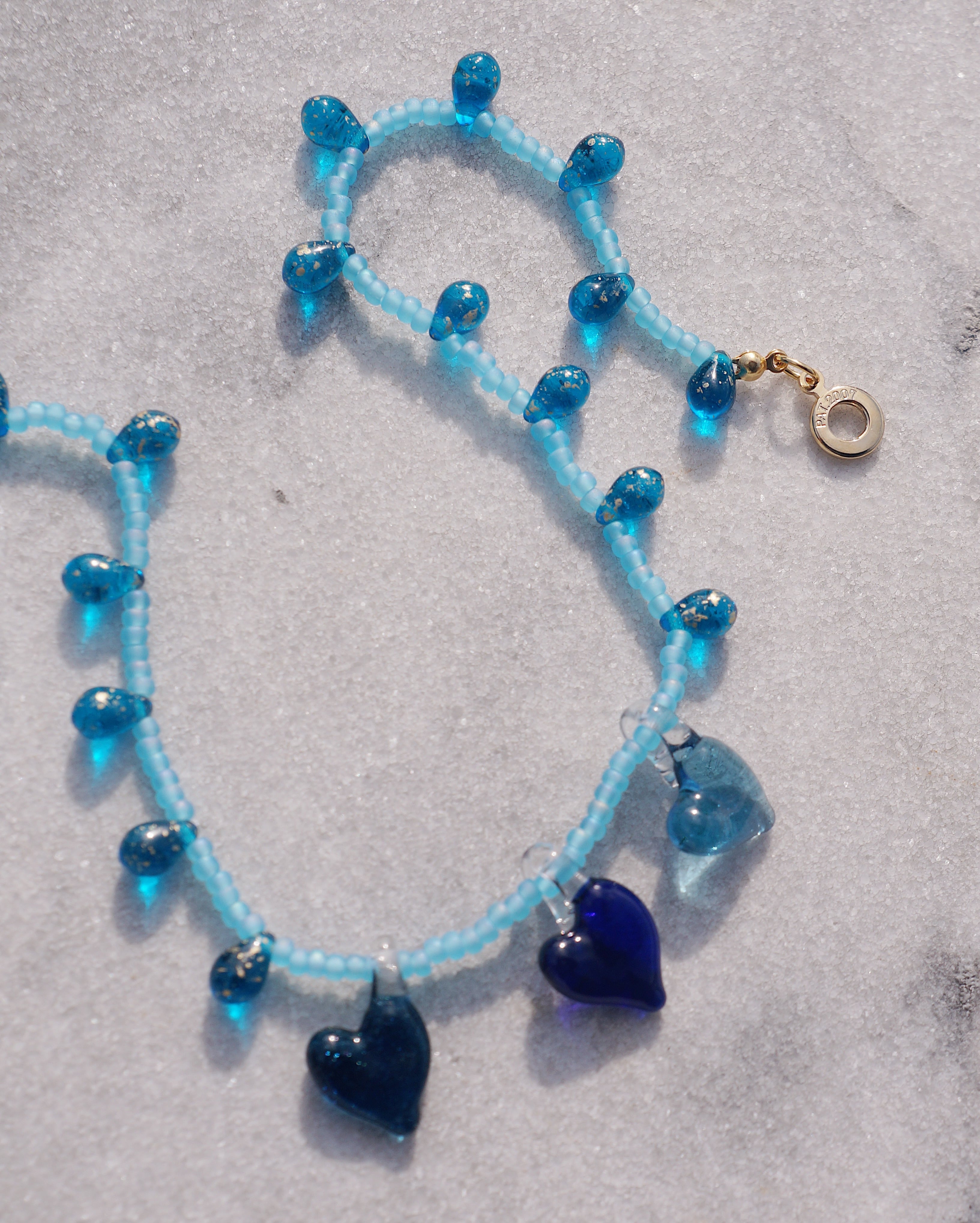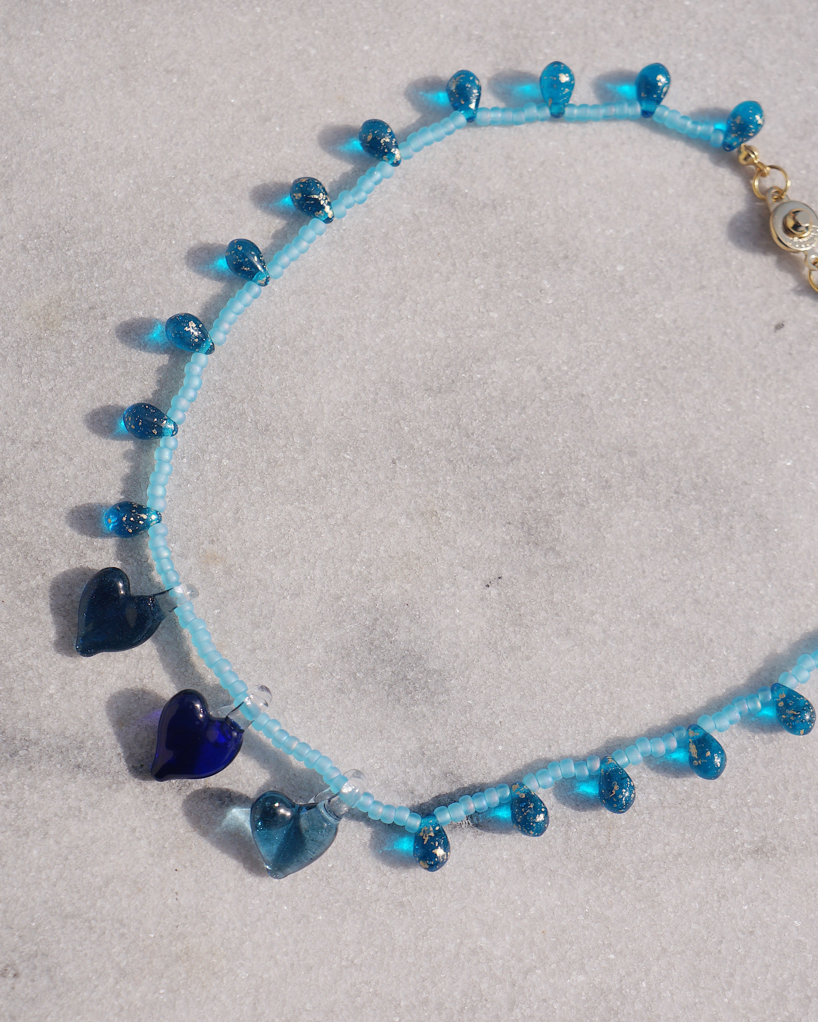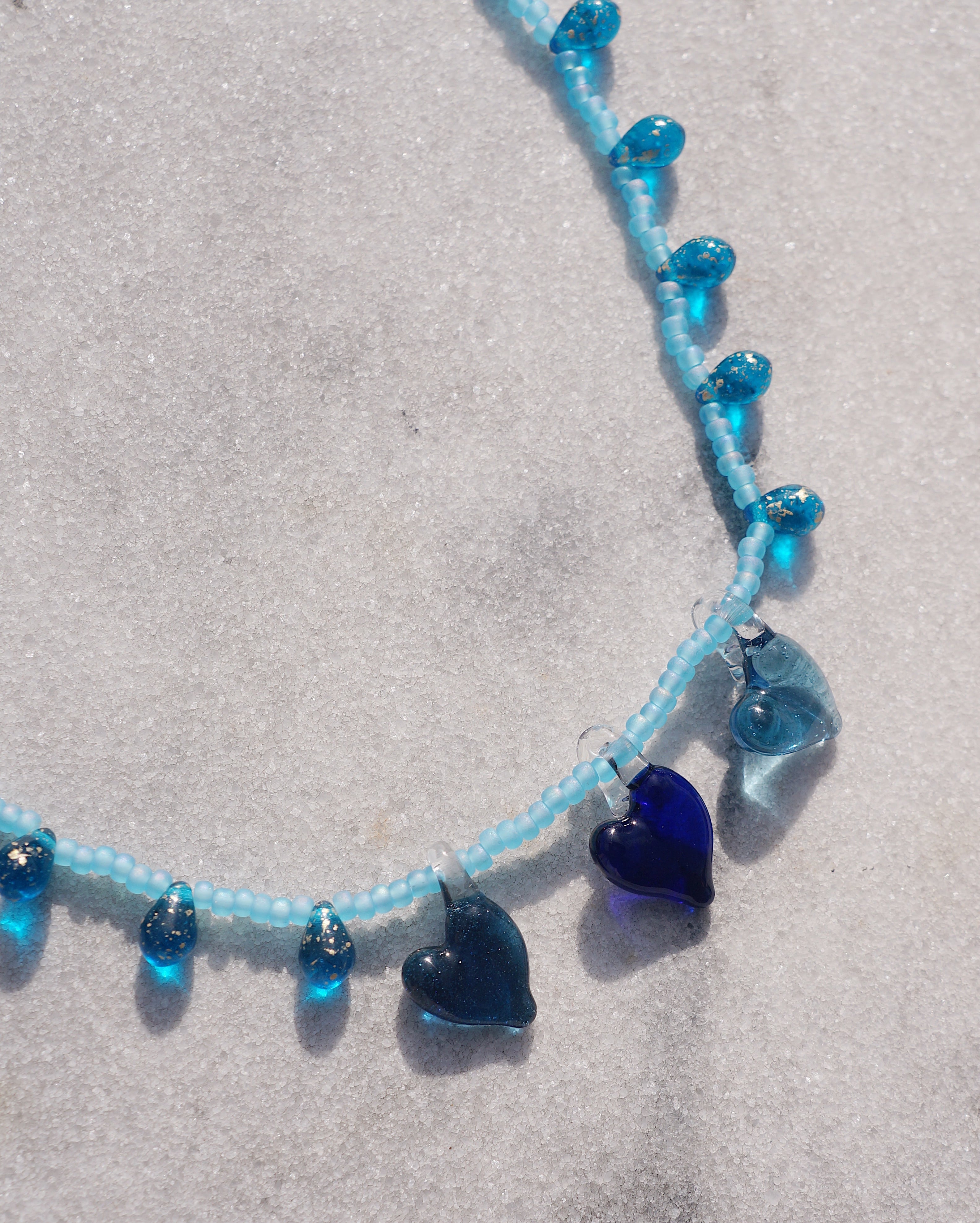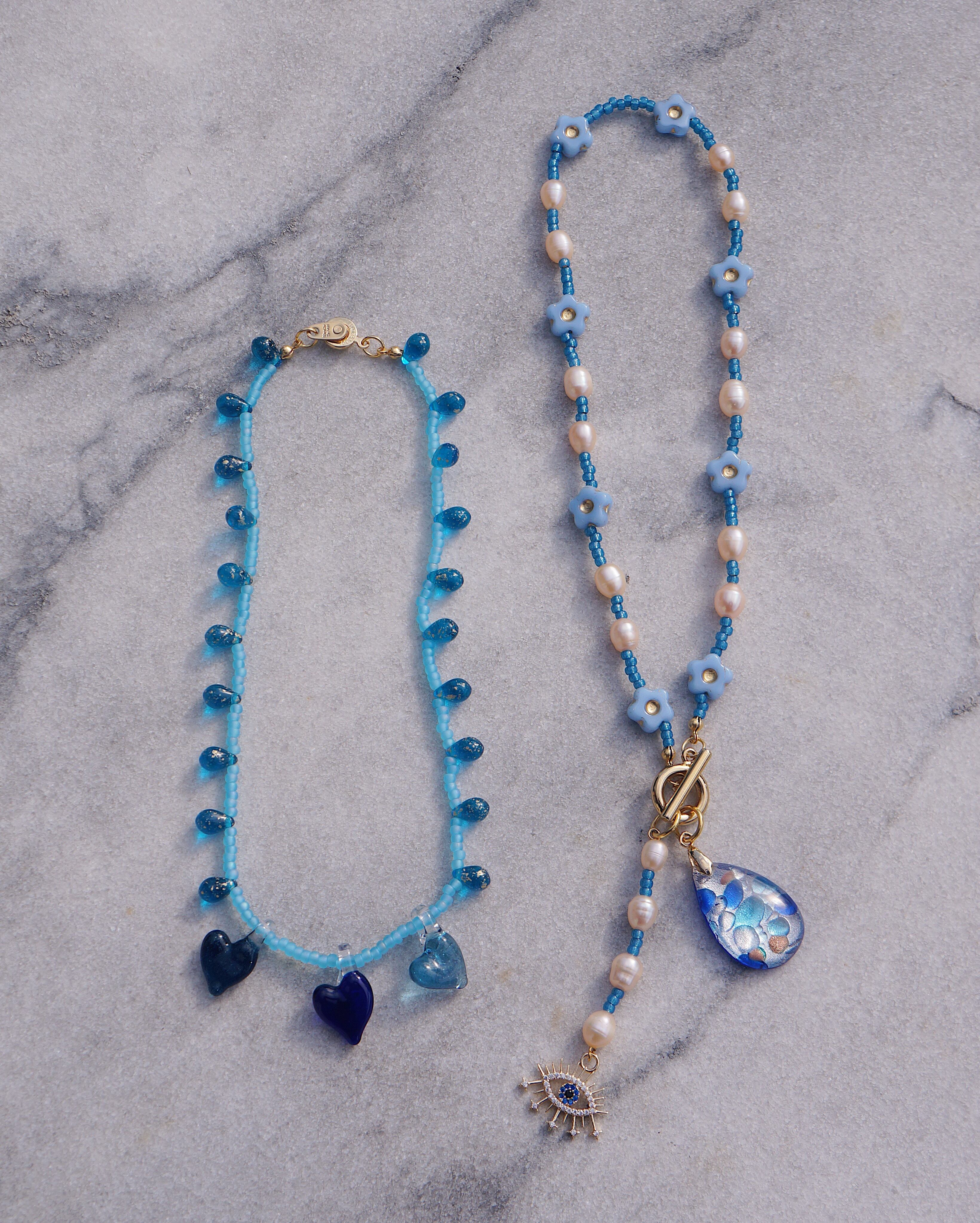 3つのハートのガラスチャームとつぶつぶしたドロップビーズがキュートなネックレスです。存在感があるデザインですが、ブルーでまとまっているためどんなスタイリングにも合わせやすい一点です。
