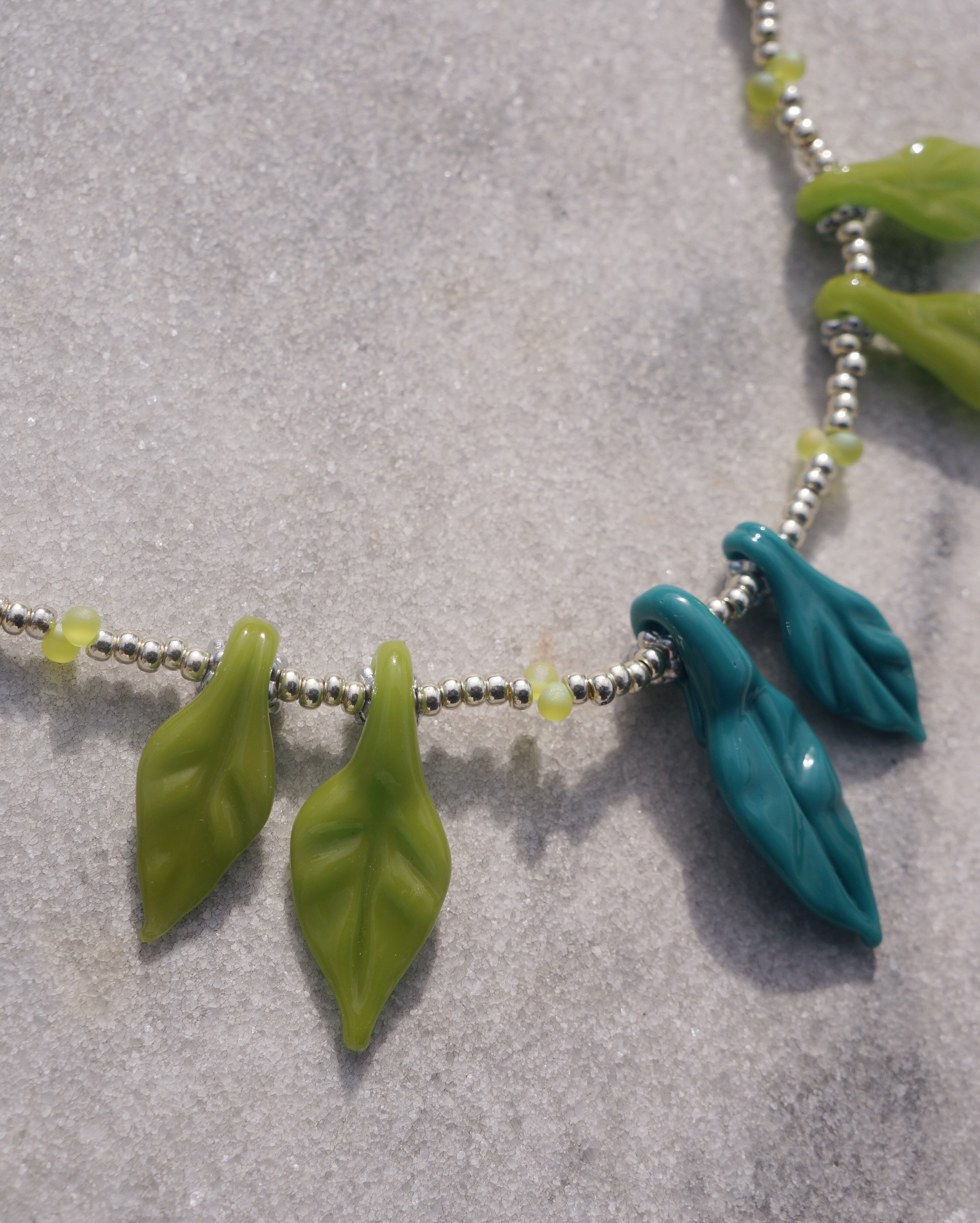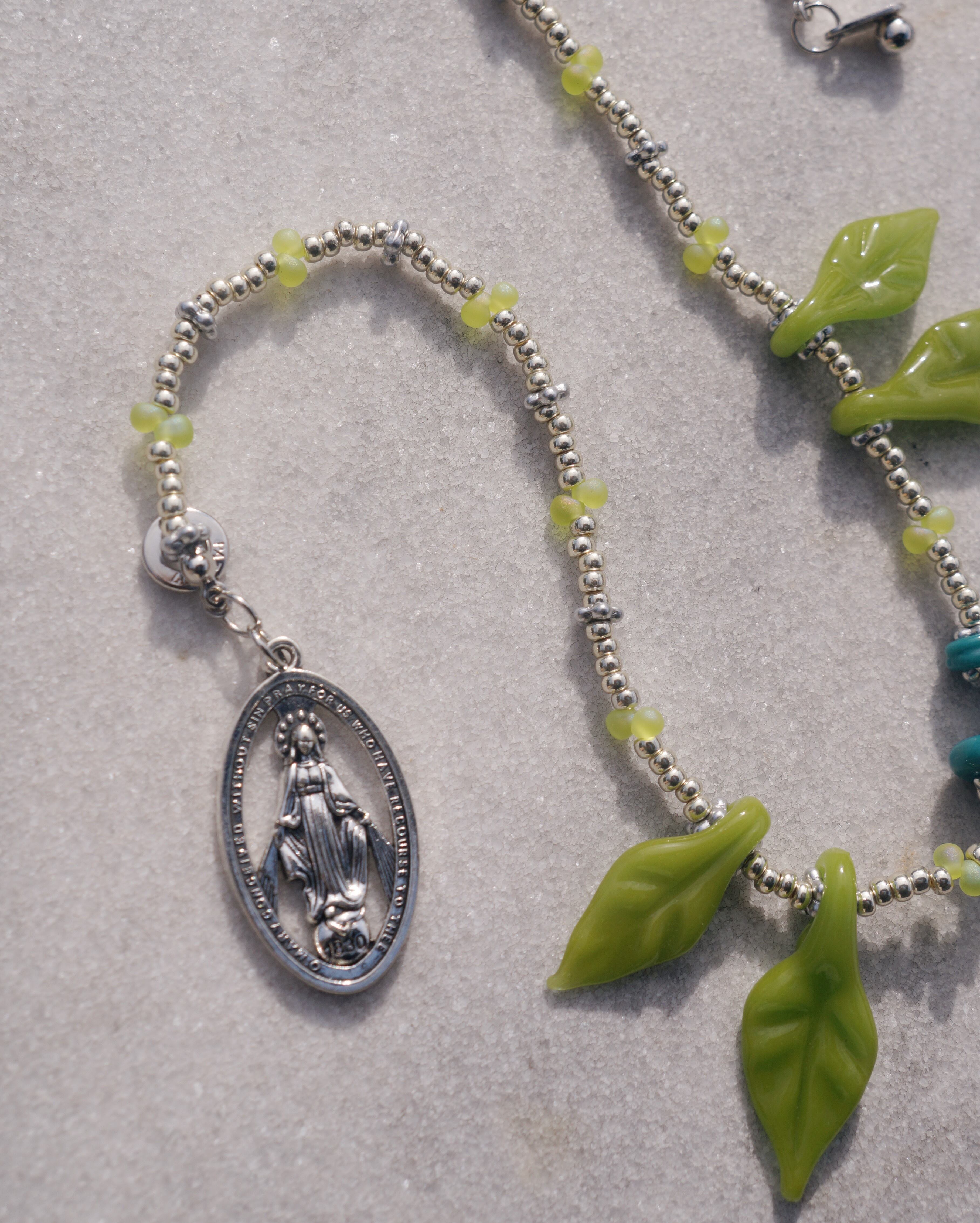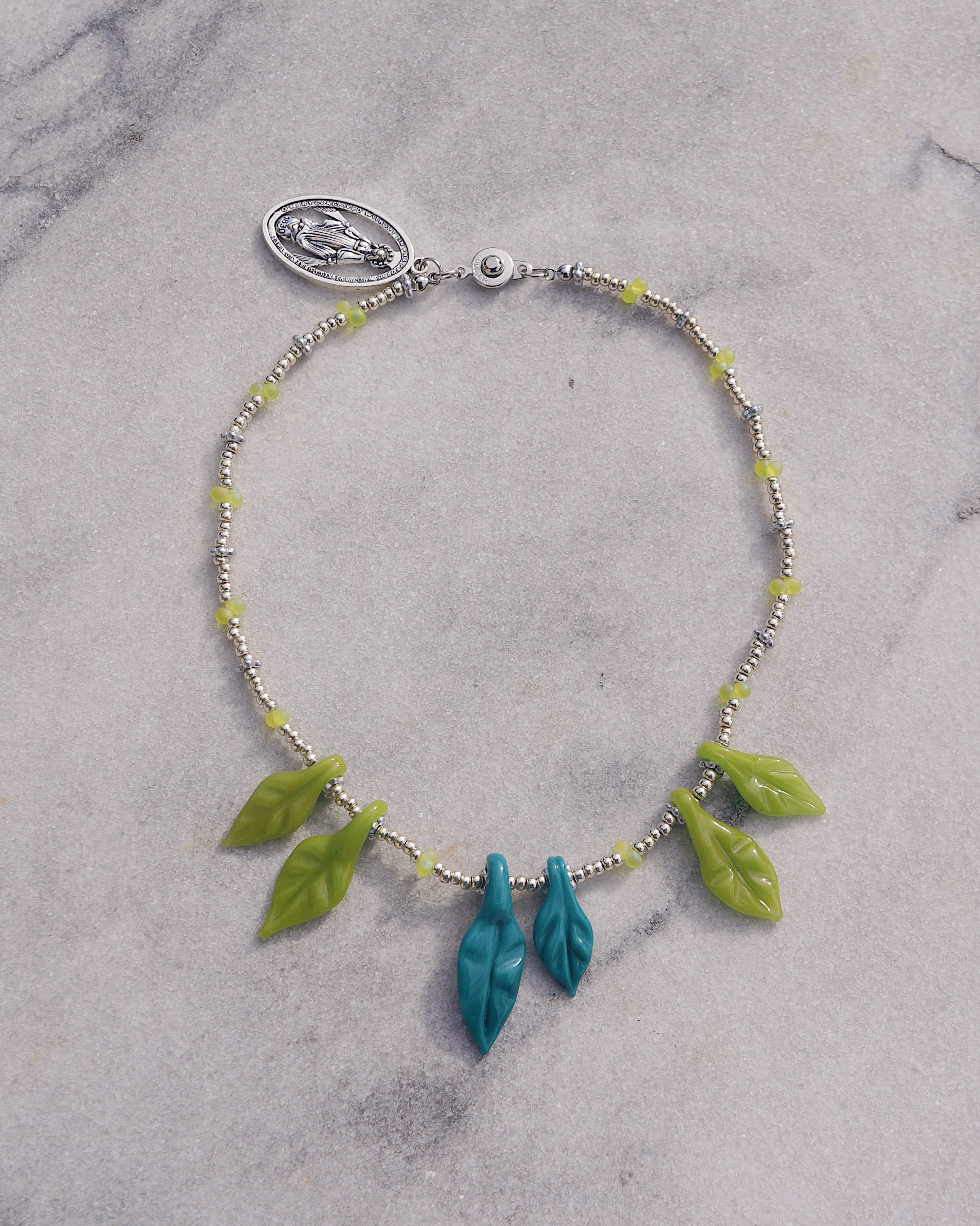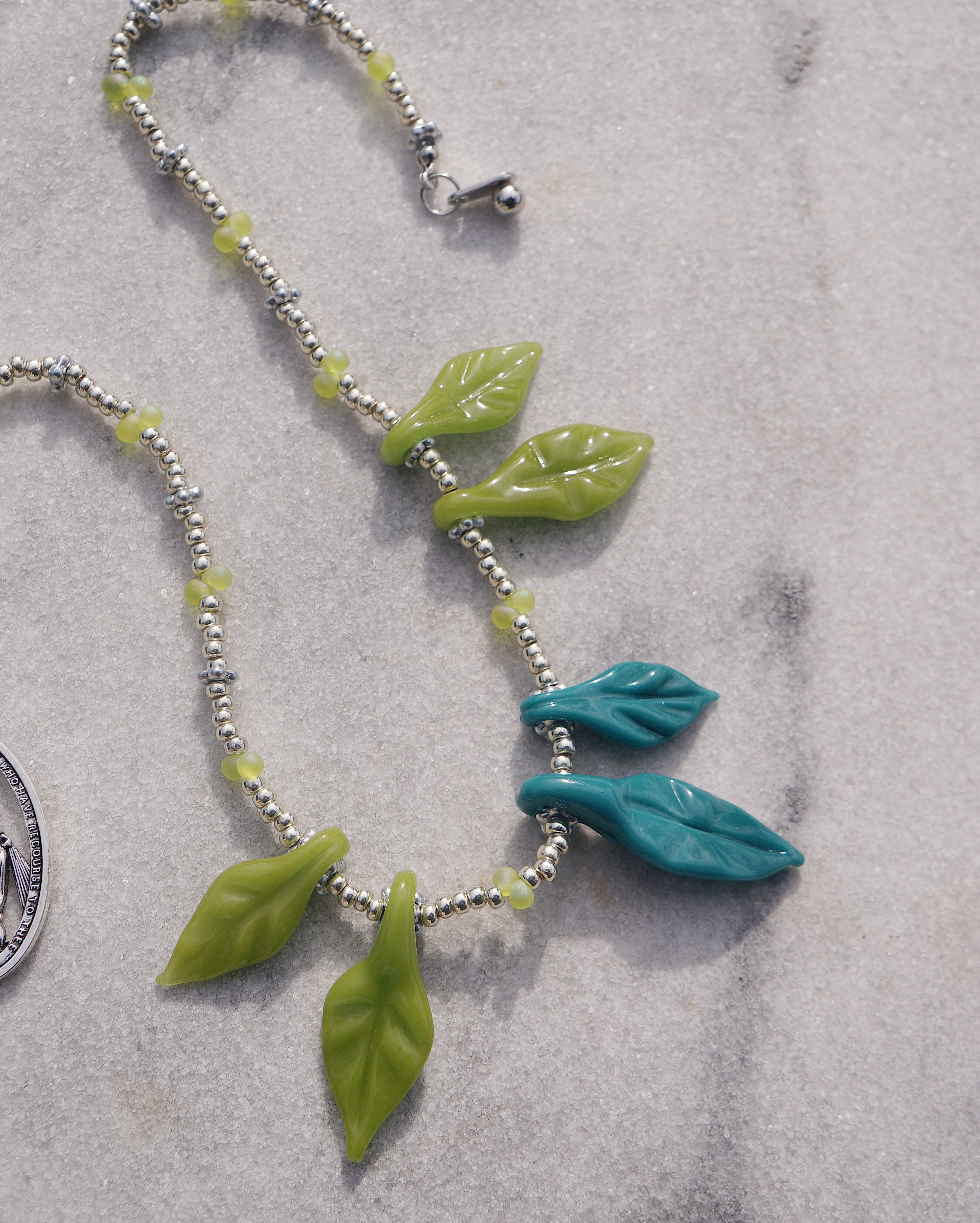 葉っぱのガラスチャームがユニークで美しいネックレスです。首周りがとっても華やかにしてくれる一点です。シンプルなお洋服に合わせるだけで一気にオシャレ感が出ますし、お花柄のお洋服に合わせても素敵なこと間違いなしです。後ろには大きめのメダイチャームがついており後ろから見てもキュートなデザインにこだわりました。