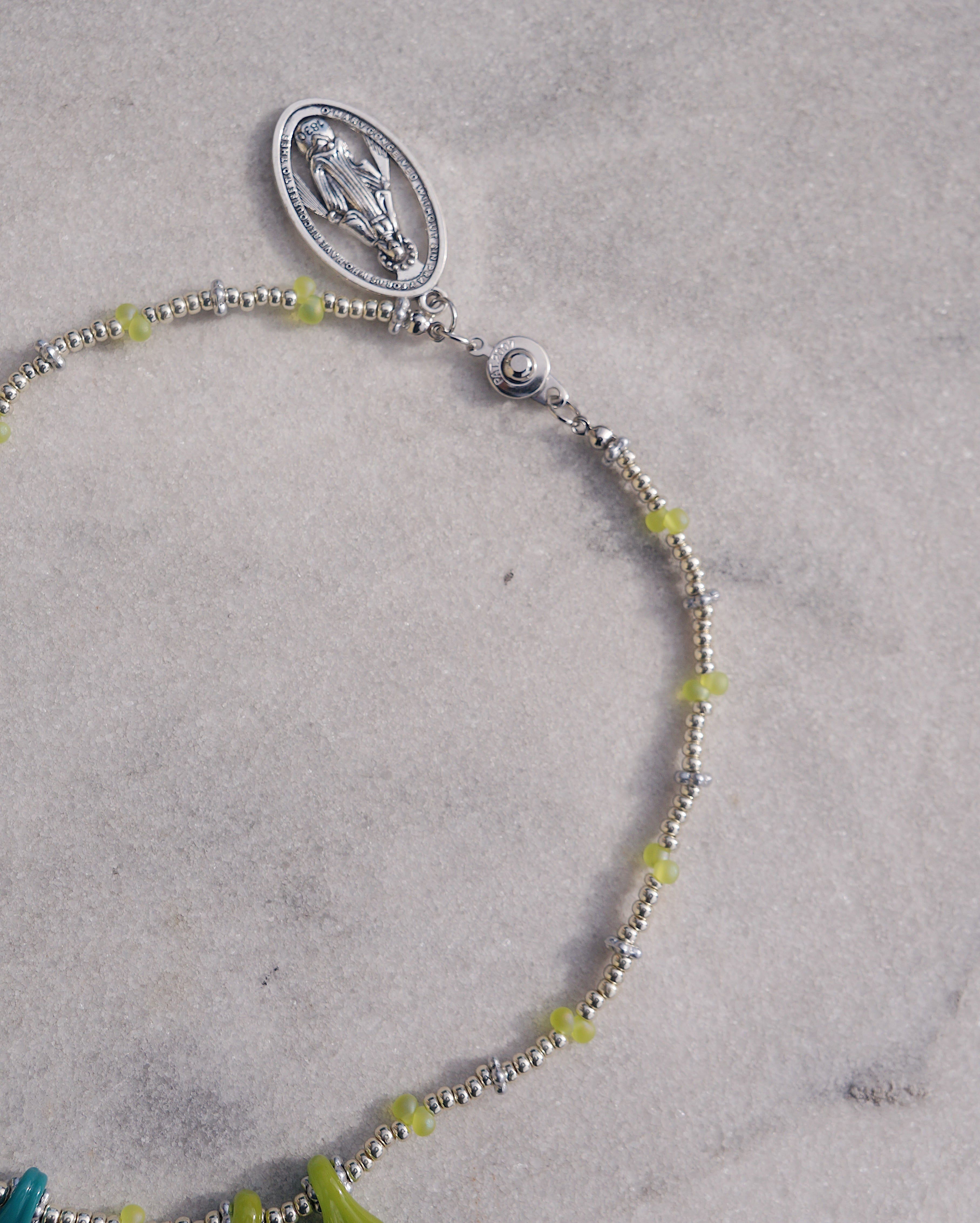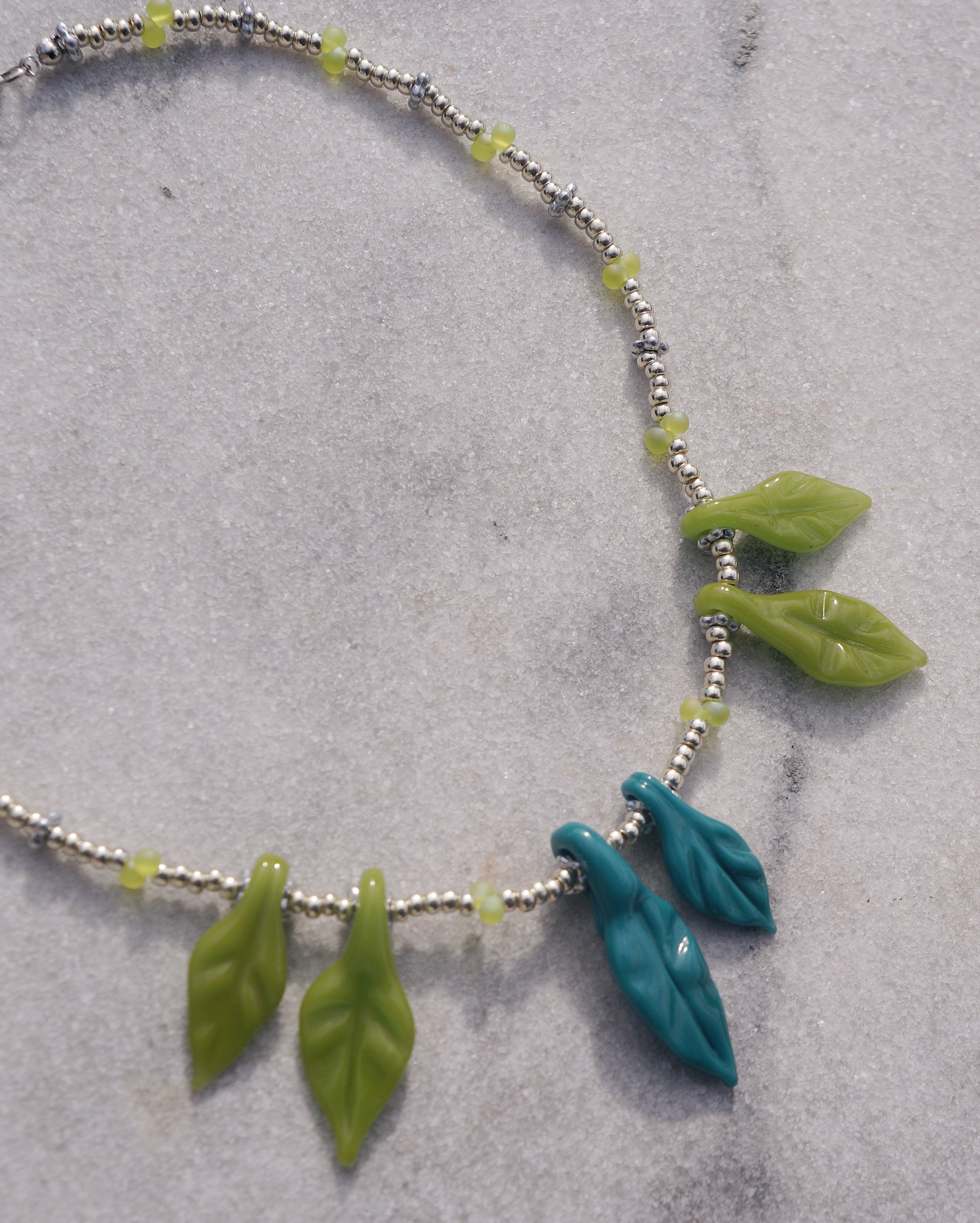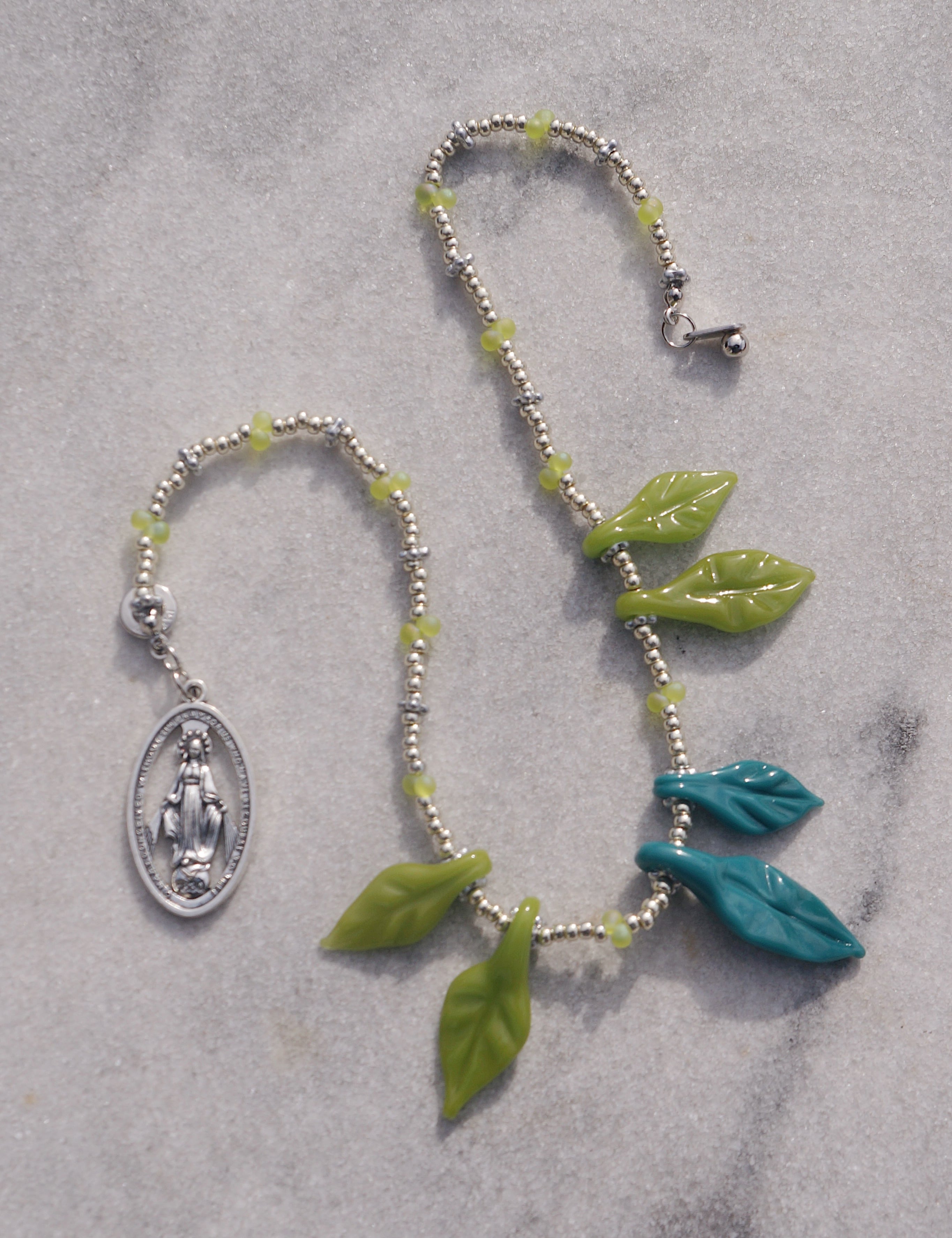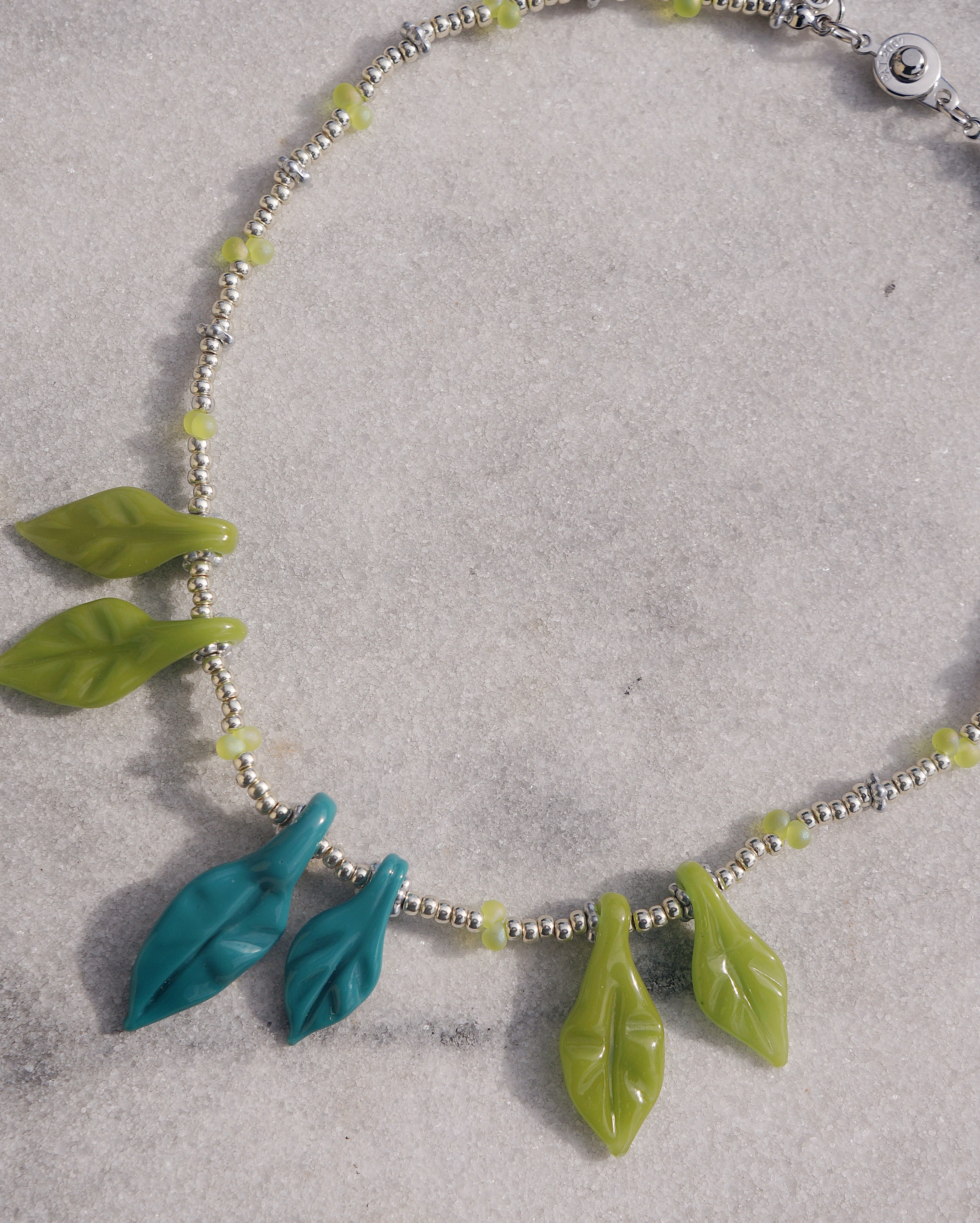 葉っぱのガラスチャームがユニークで美しいネックレスです。首周りがとっても華やかにしてくれる一点です。シンプルなお洋服に合わせるだけで一気にオシャレ感が出ますし、お花柄のお洋服に合わせても素敵なこと間違いなしです。後ろには大きめのメダイチャームがついており後ろから見てもキュートなデザインにこだわりました。