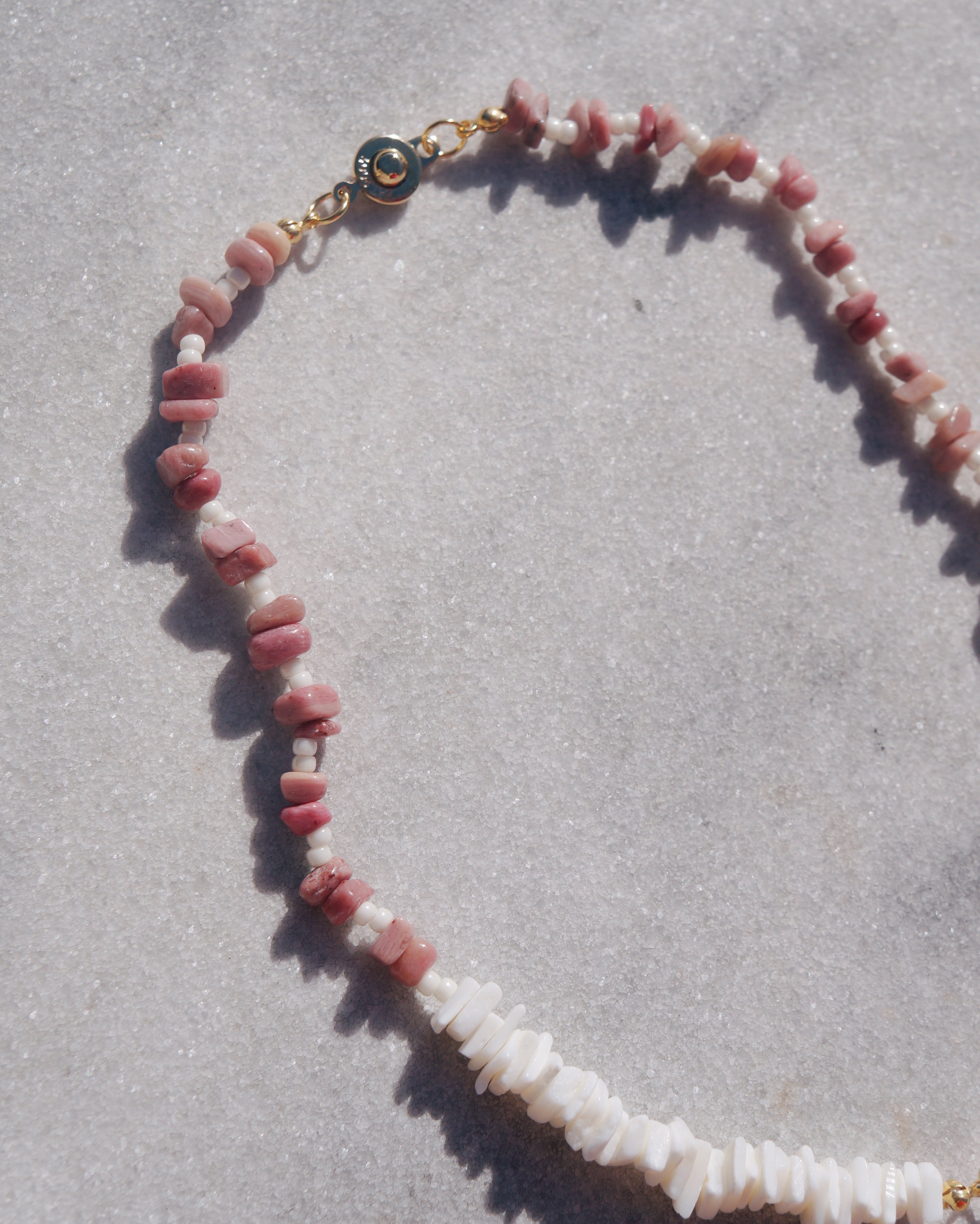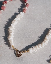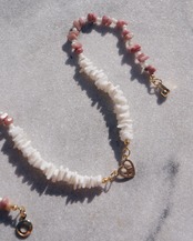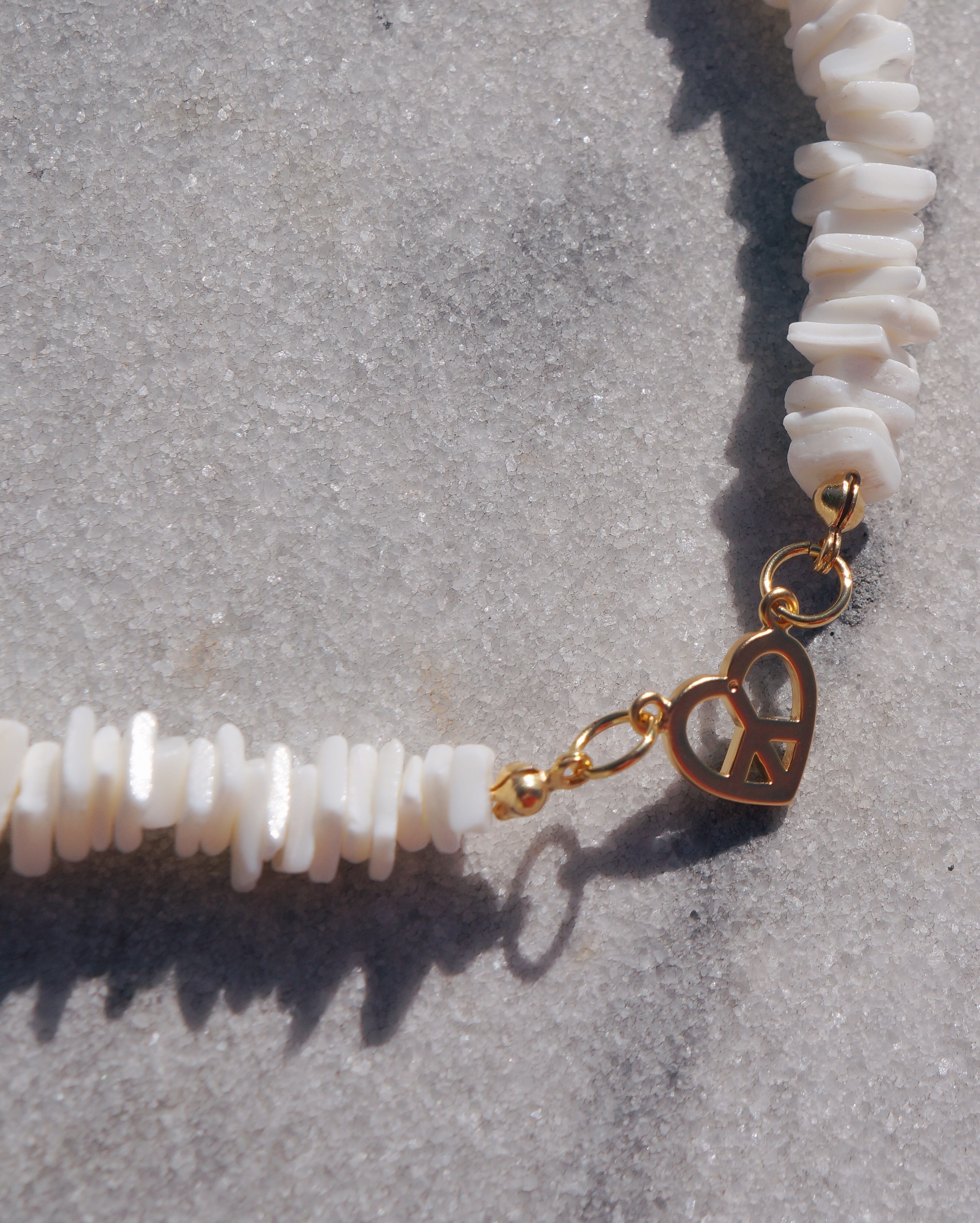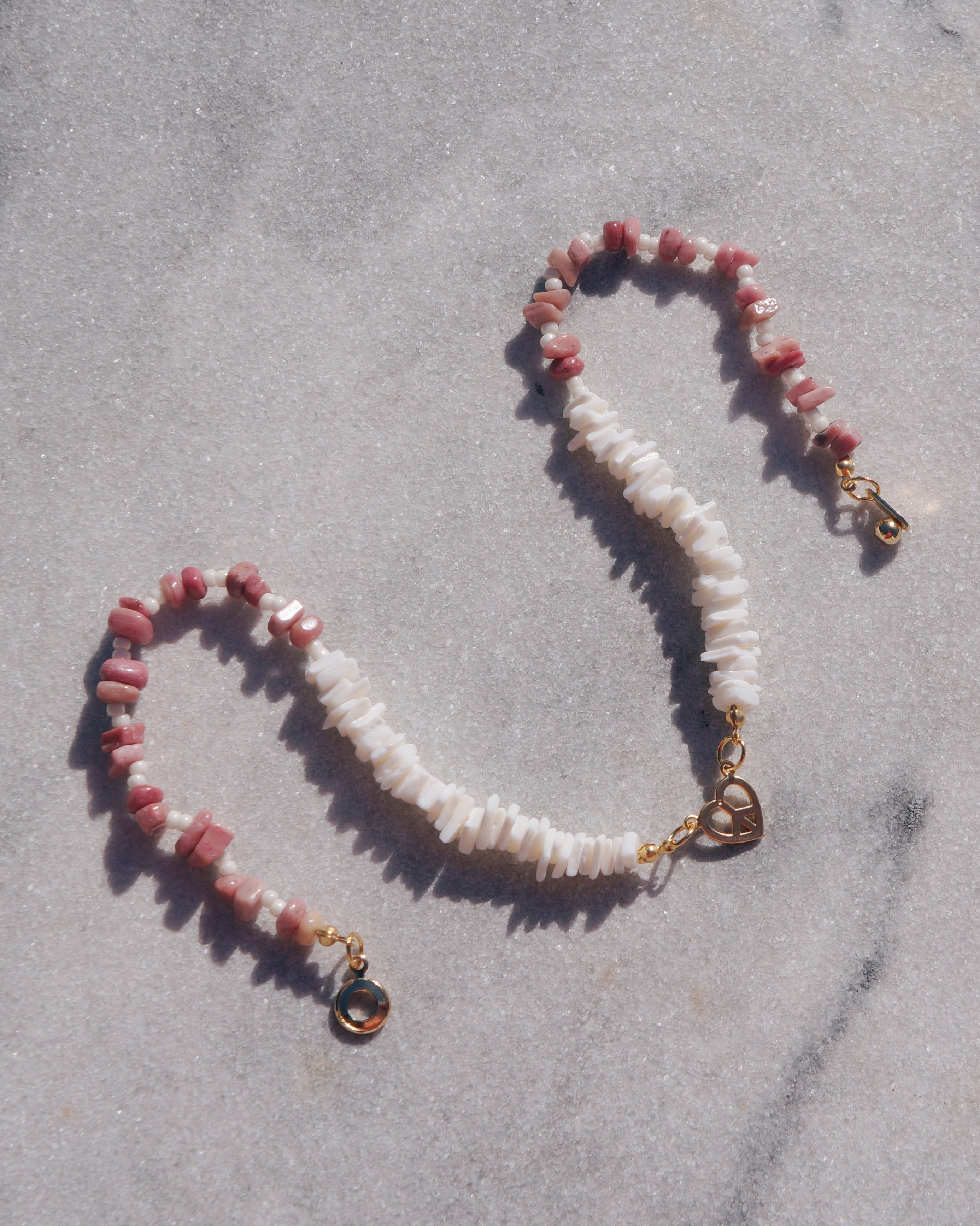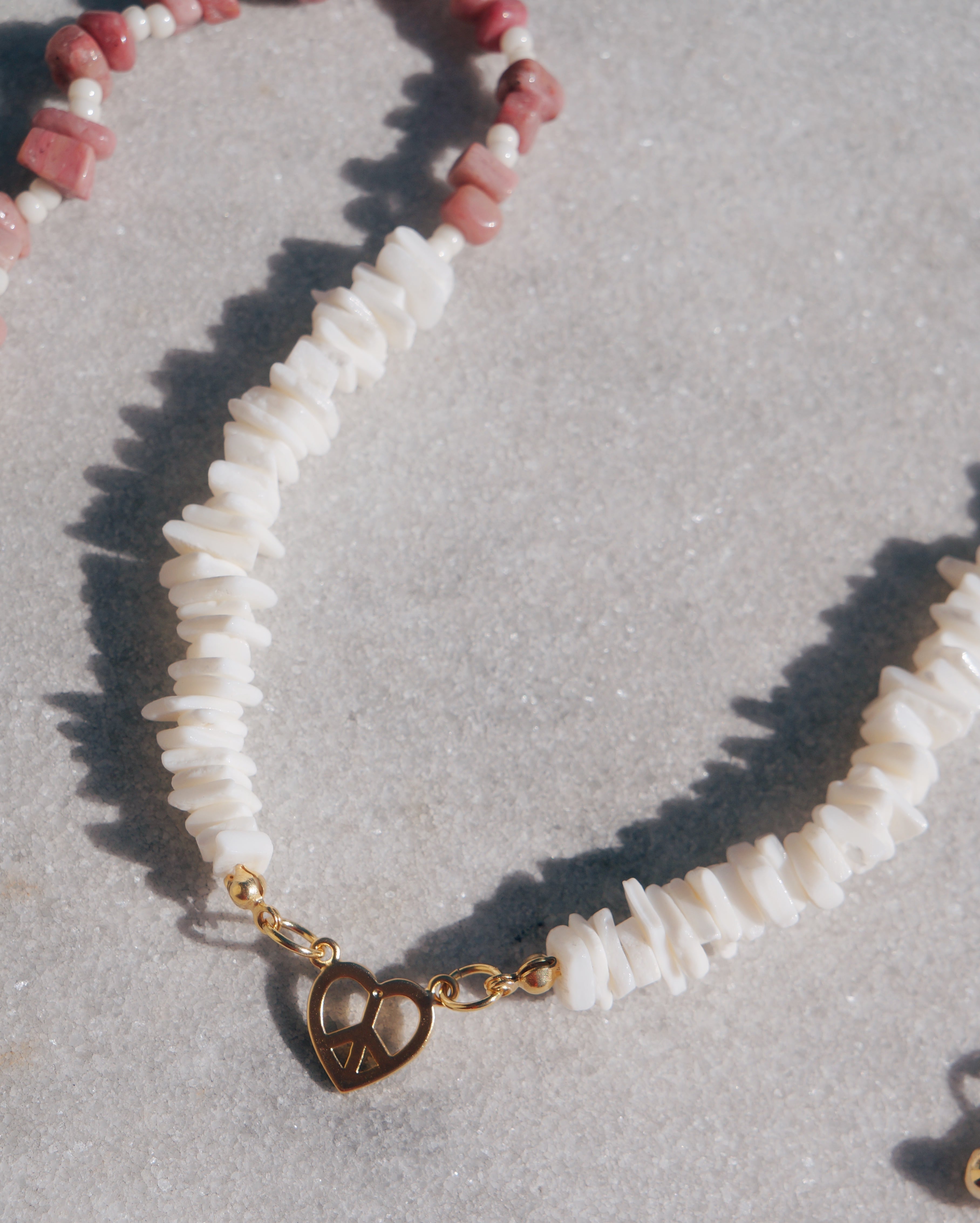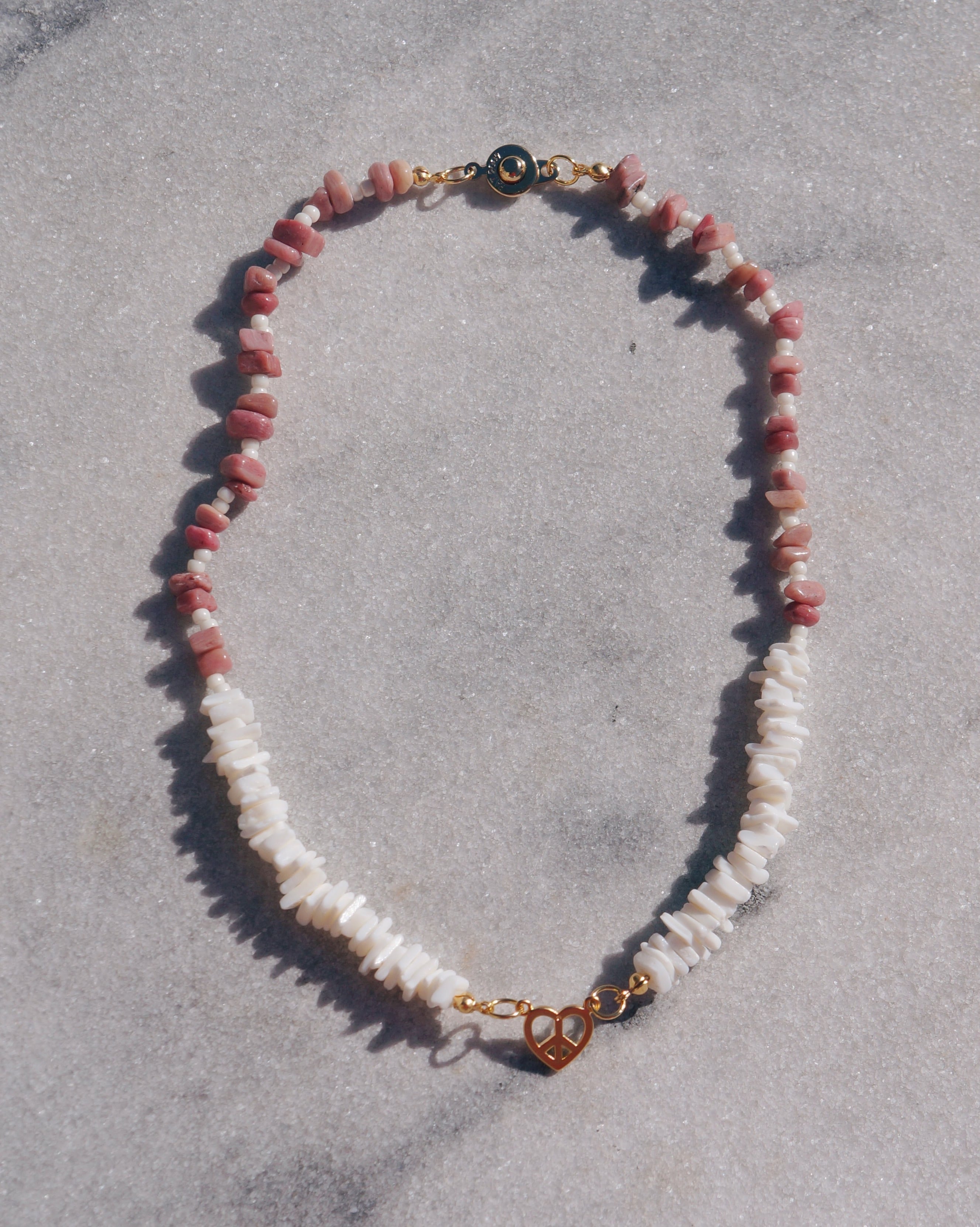 ハートのピースマークを中央に持ってきたどんなスタイリングにも合わせやすいネックレスです。シェルビーズと天然石のロードナイトを使って繊細で美しいデザインにしました。