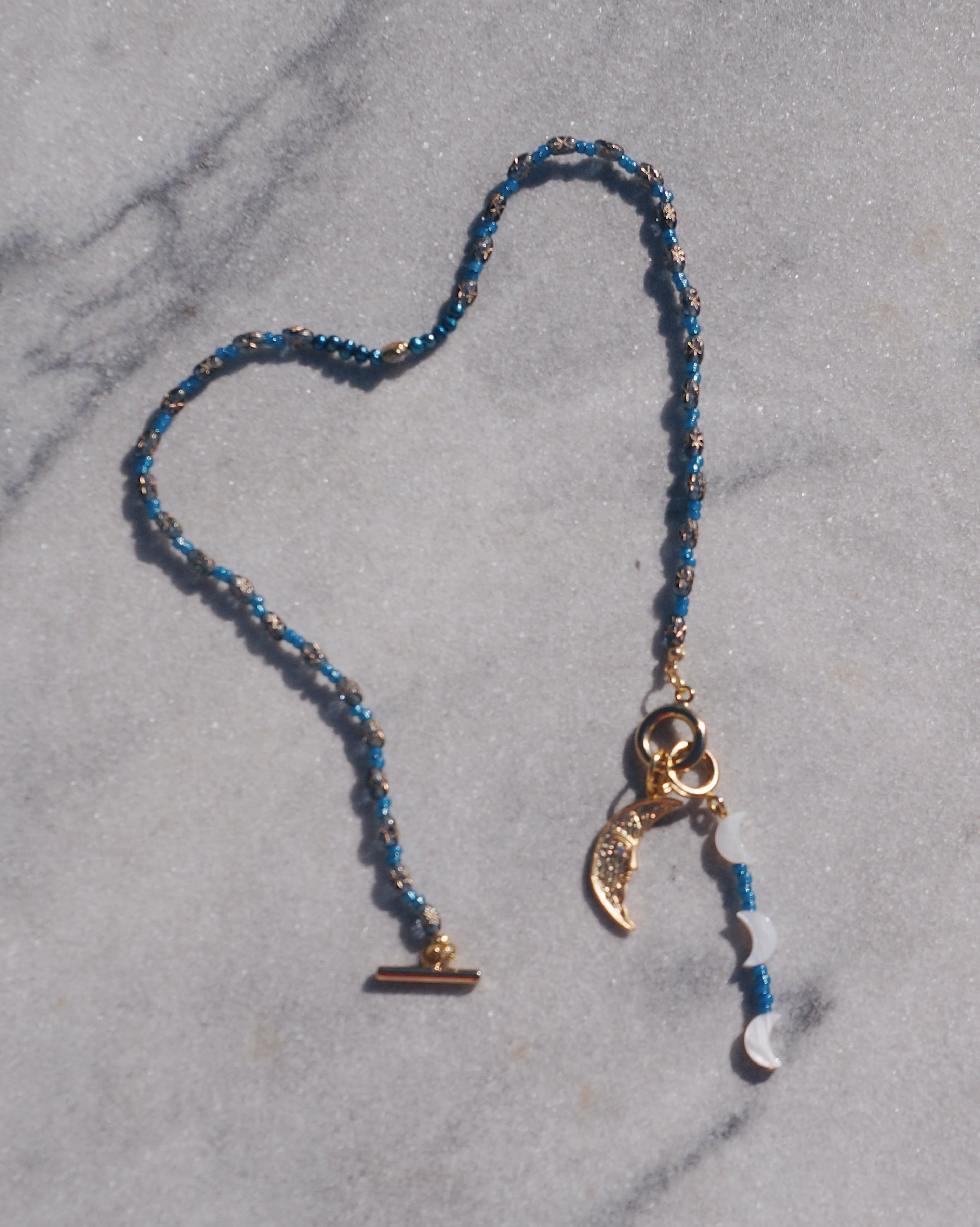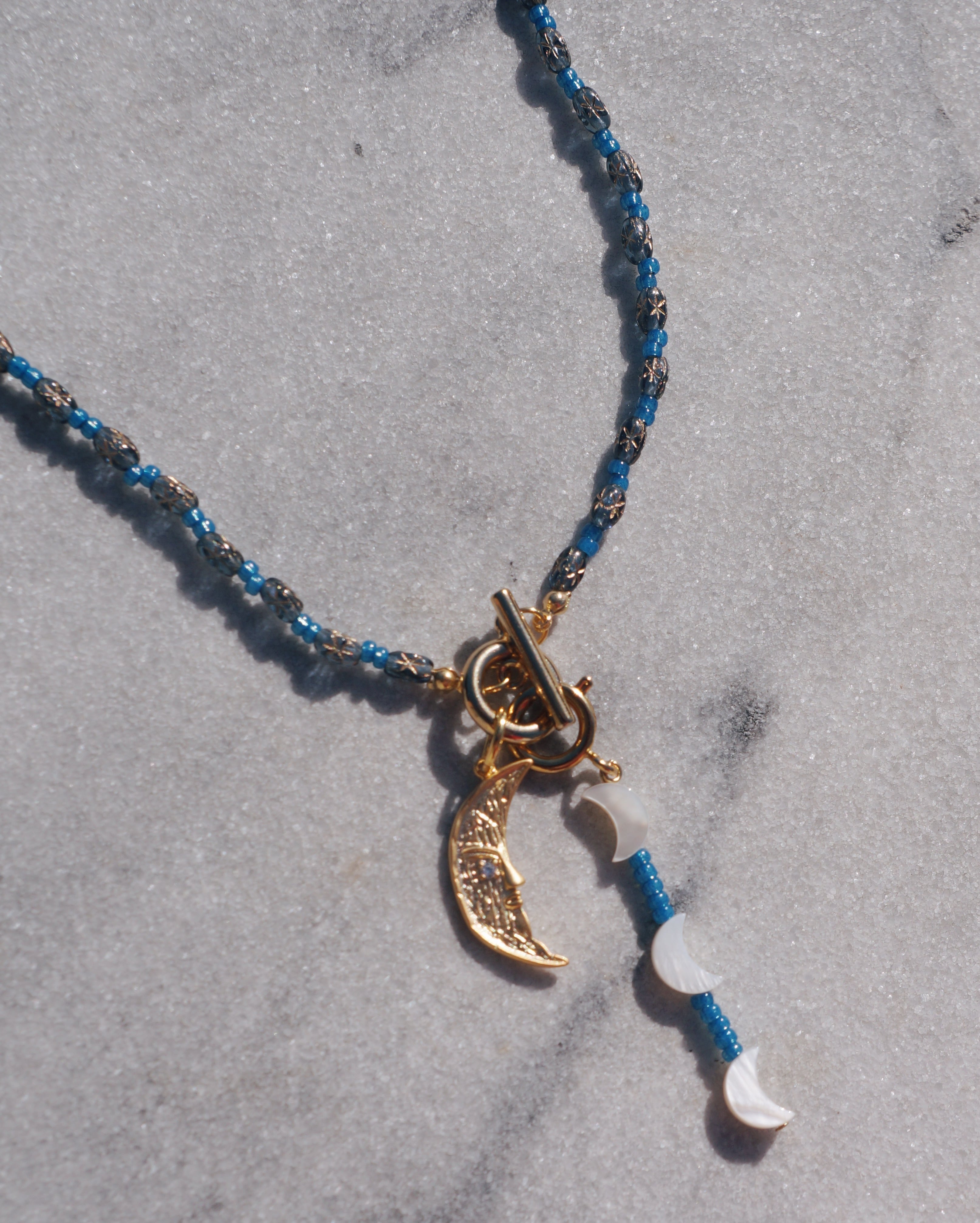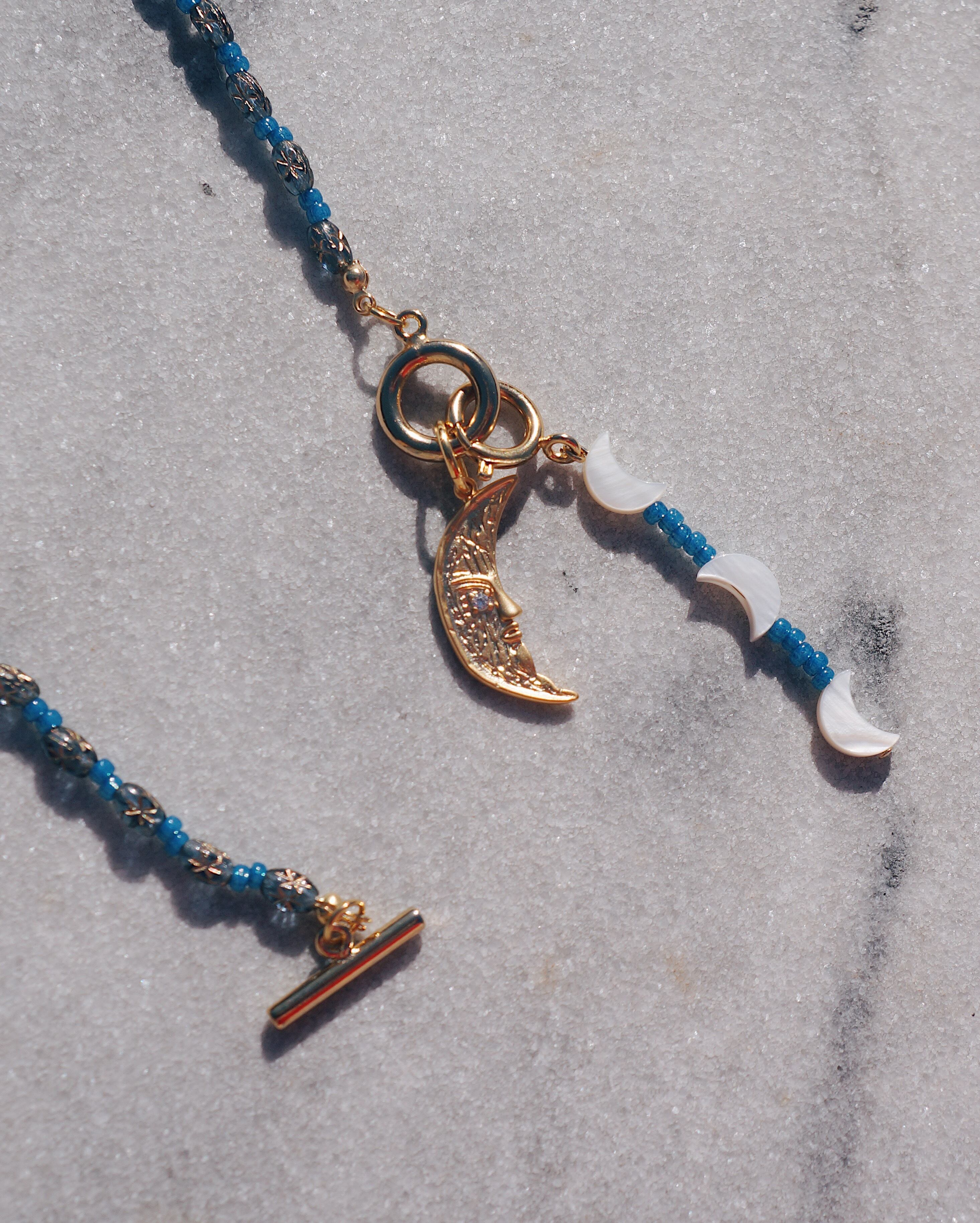 マンテルを前にもってきても、後ろのもってきても使える2WAYで楽しんでもらえるネックレスです。またマンテルについているビーズのチャームも取り外し可能なため、その日の気分で使い方を楽しんでもらえるデザインにしました。チェコビーズと大ぶりな月のチャームがキュートです。星や月が光り輝く夜空をイメージした一点です。