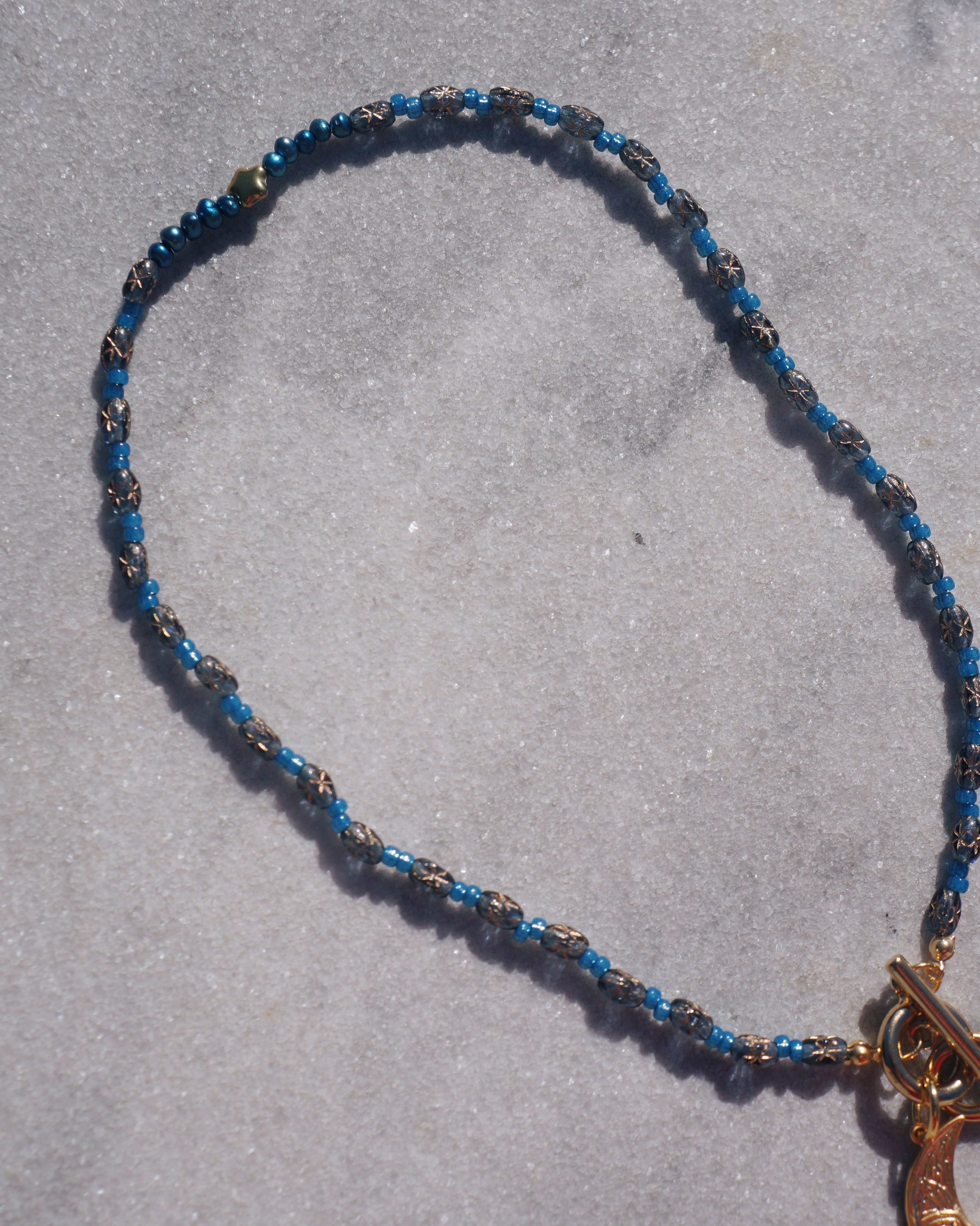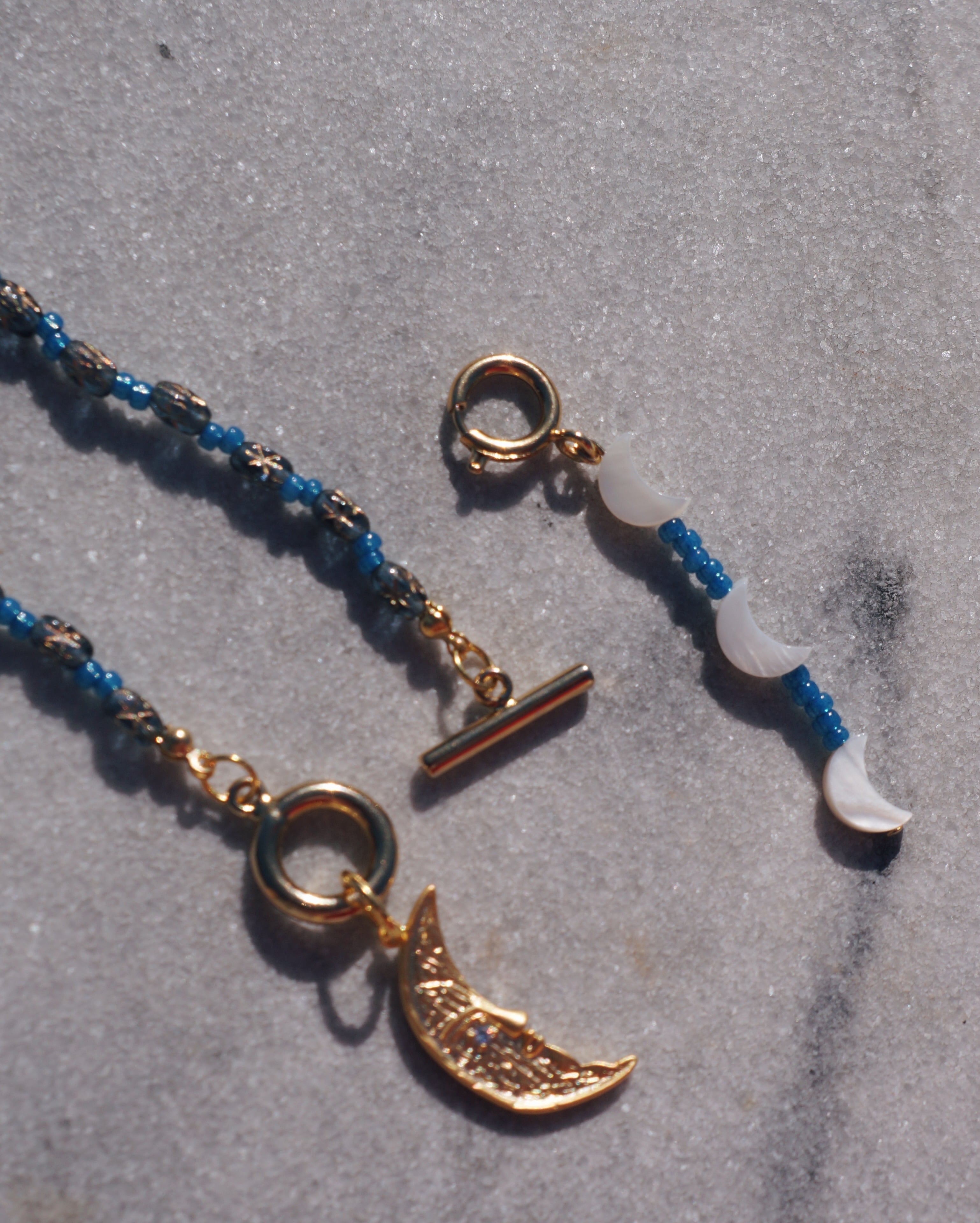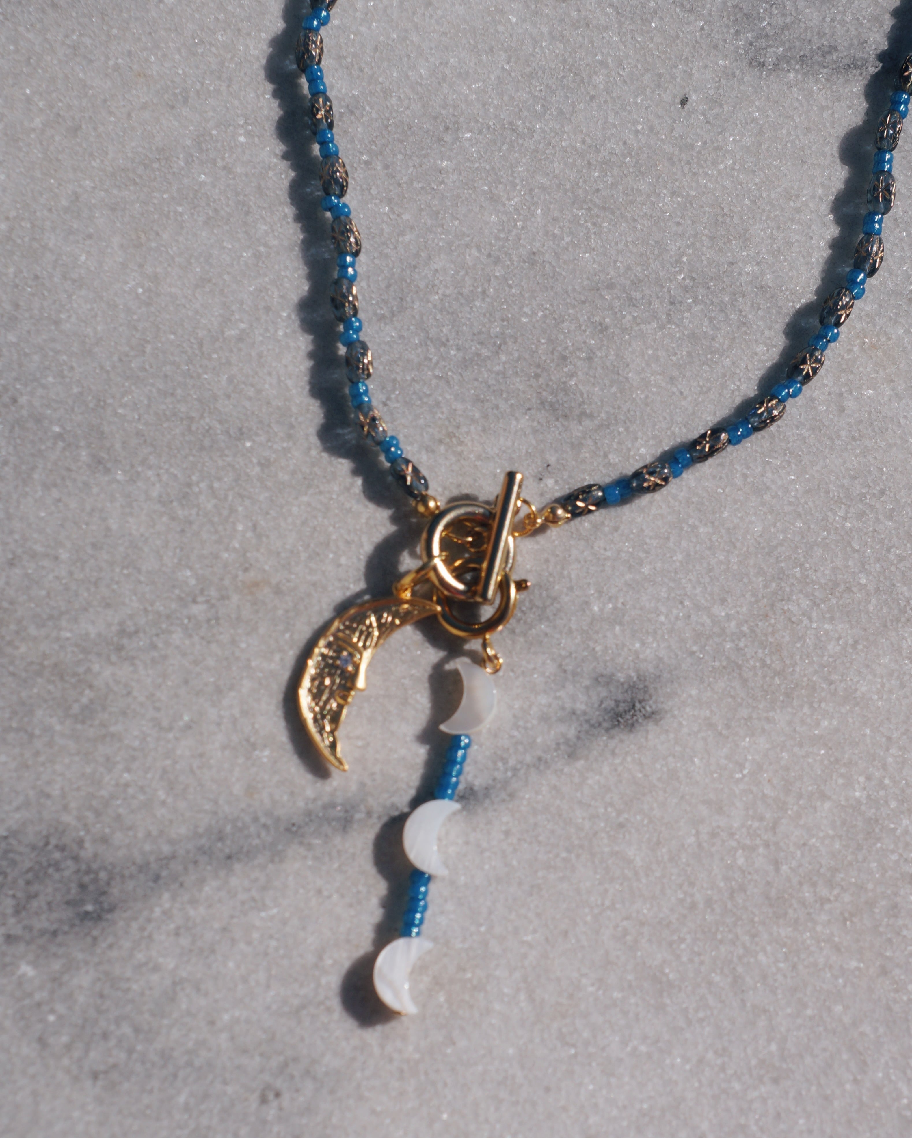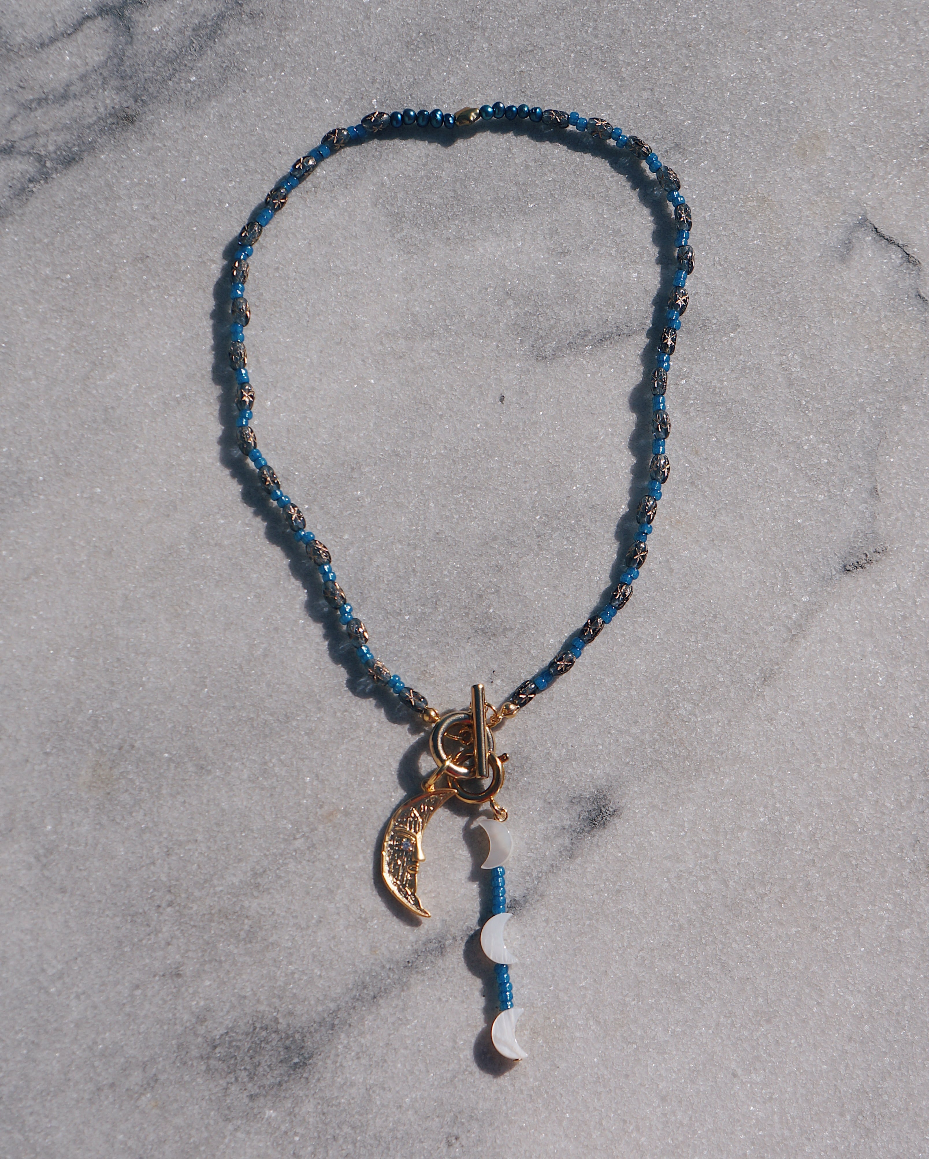 マンテルを前にもってきても、後ろのもってきても使える2WAYで楽しんでもらえるネックレスです。またマンテルについているビーズのチャームも取り外し可能なため、その日の気分で使い方を楽しんでもらえるデザインにしました。チェコビーズと大ぶりな月のチャームがキュートです。星や月が光り輝く夜空をイメージした一点です。