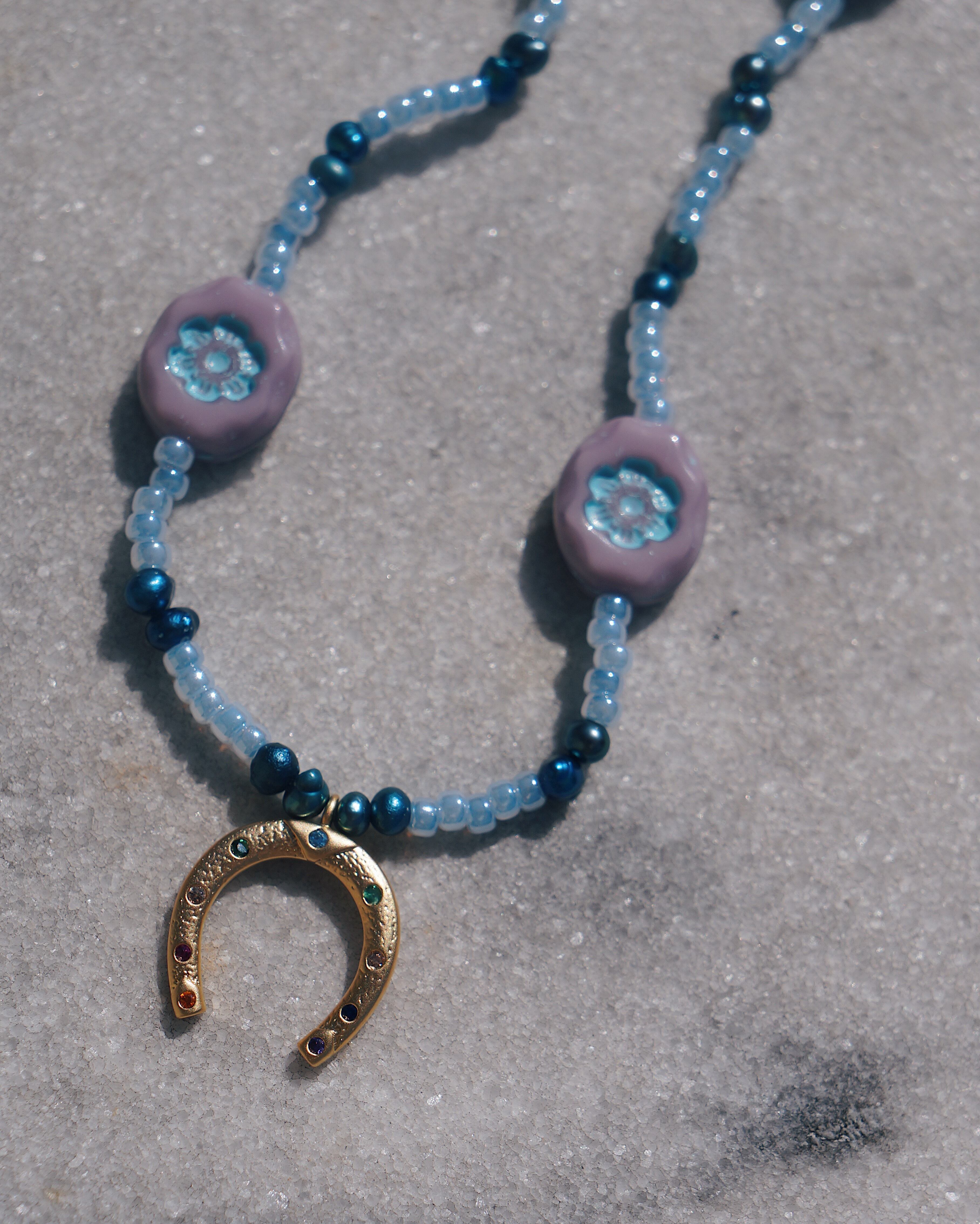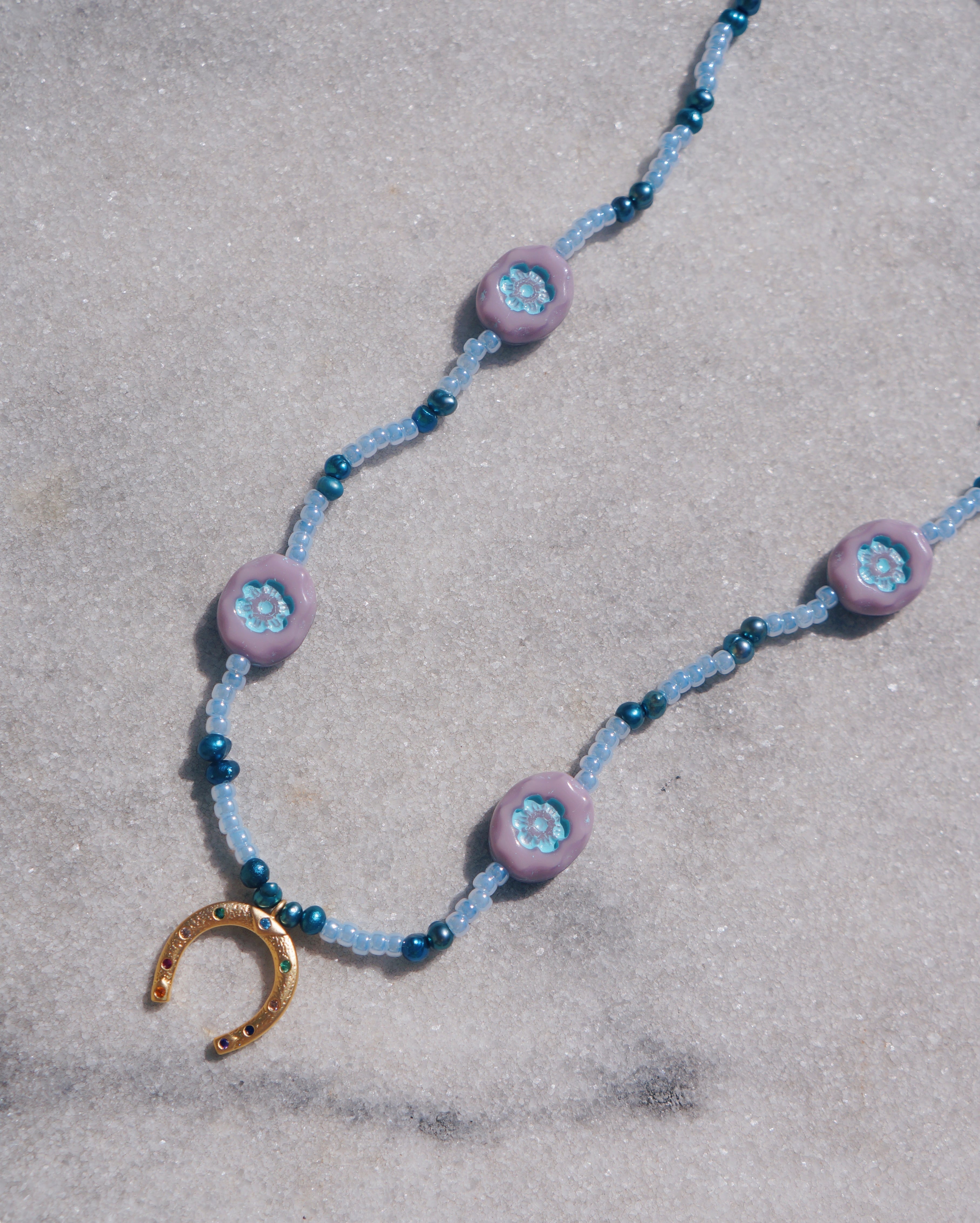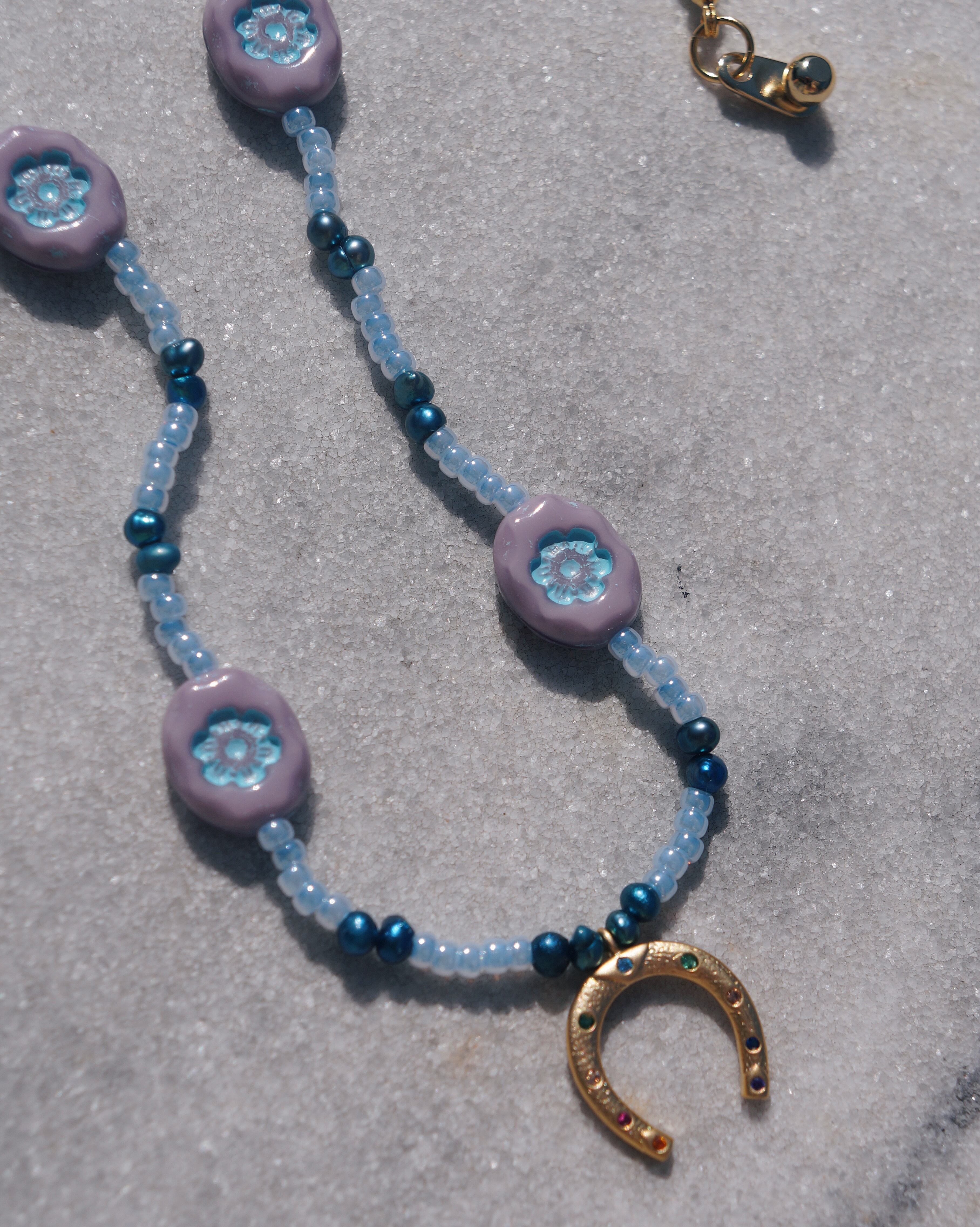 紫色と水色、淡水パールの鮮やかな青色のカラーコンビネーションと、お花が描かれたチェコビーズと馬蹄のチャームがキュートなネックレスです。