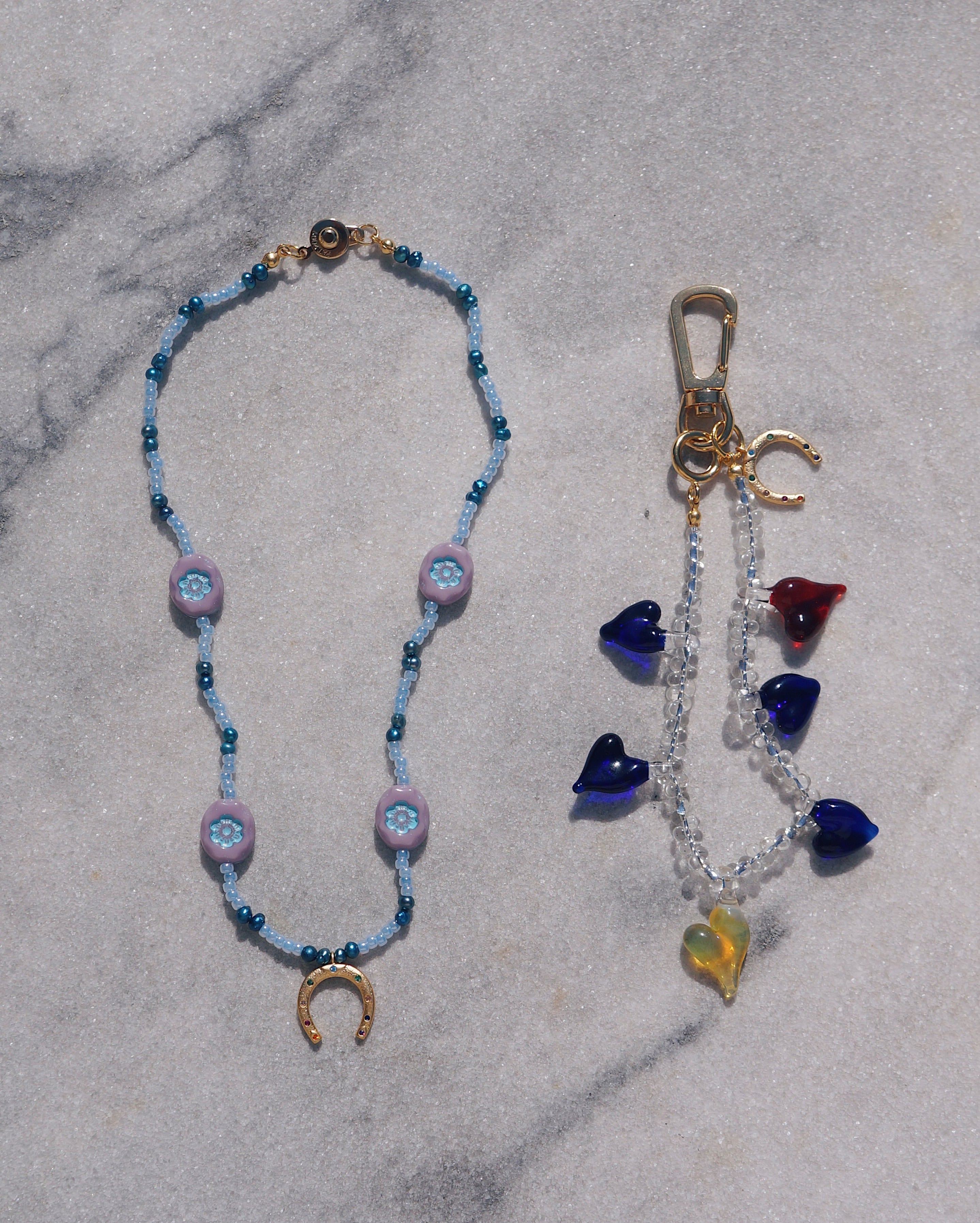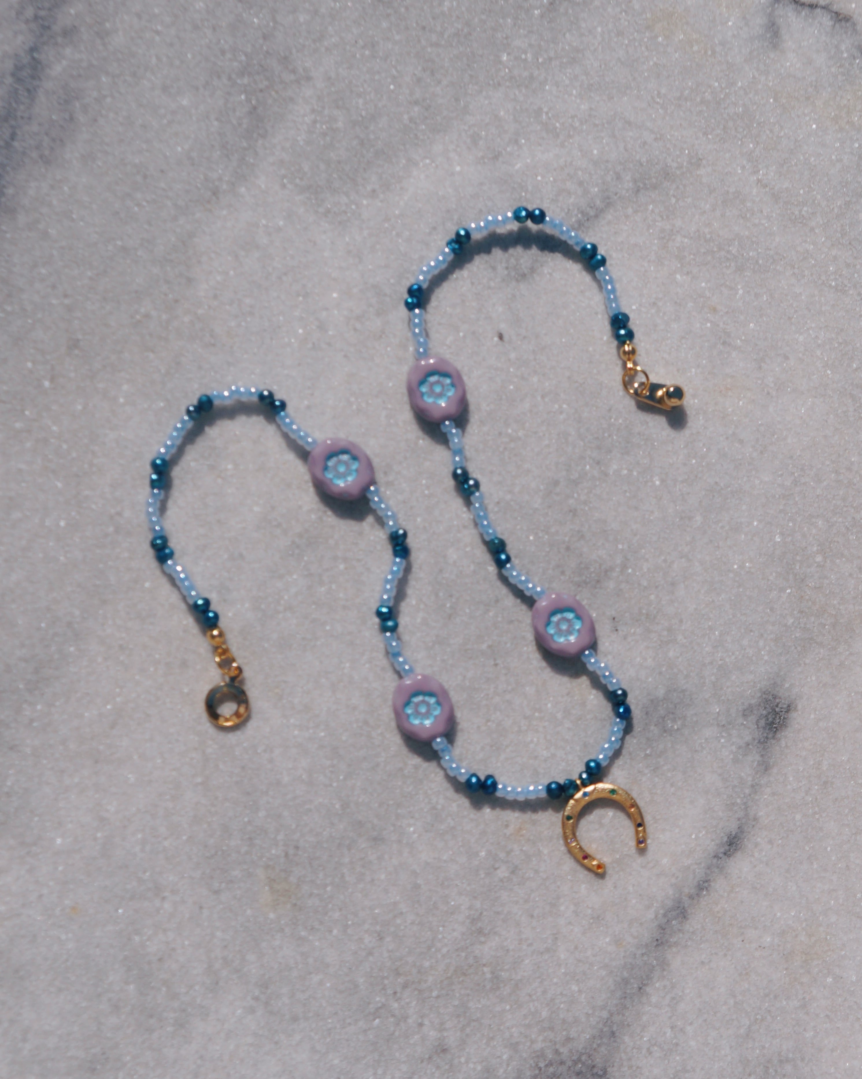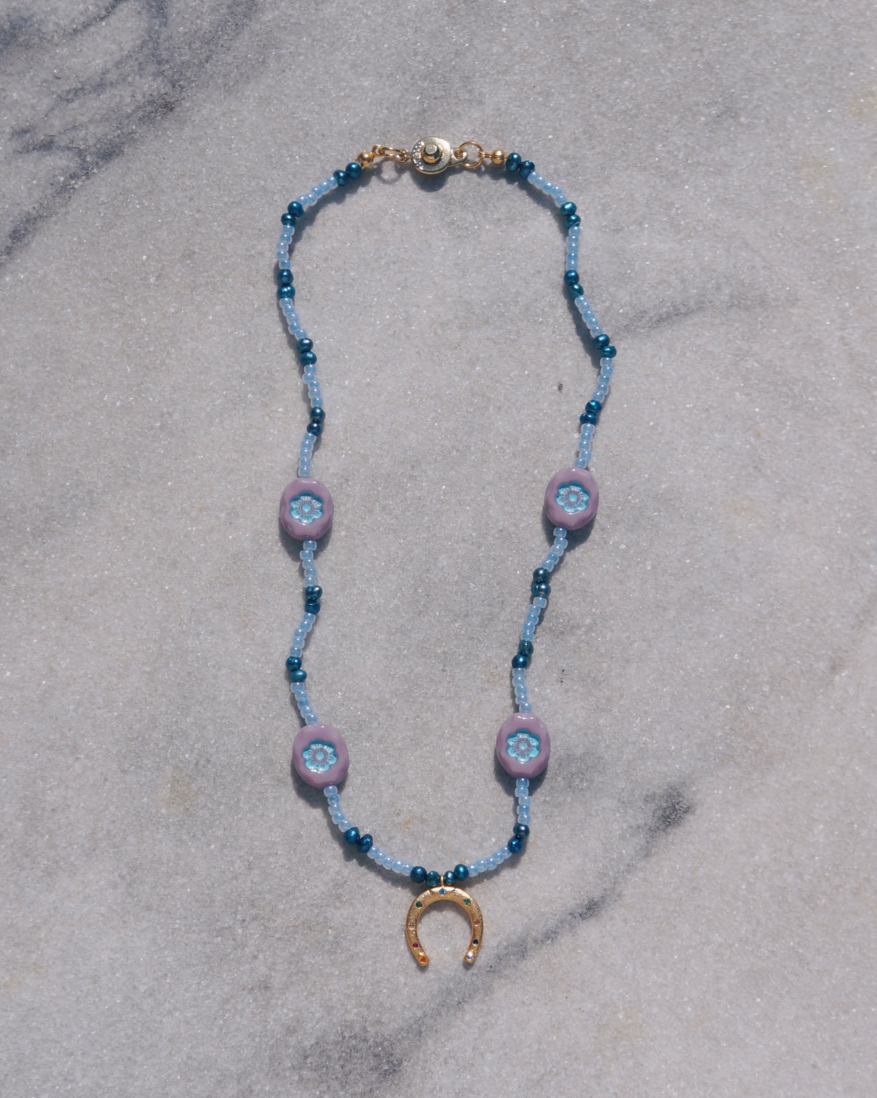 紫色と水色、淡水パールの鮮やかな青色のカラーコンビネーションと、お花が描かれたチェコビーズと馬蹄のチャームがキュートなネックレスです。