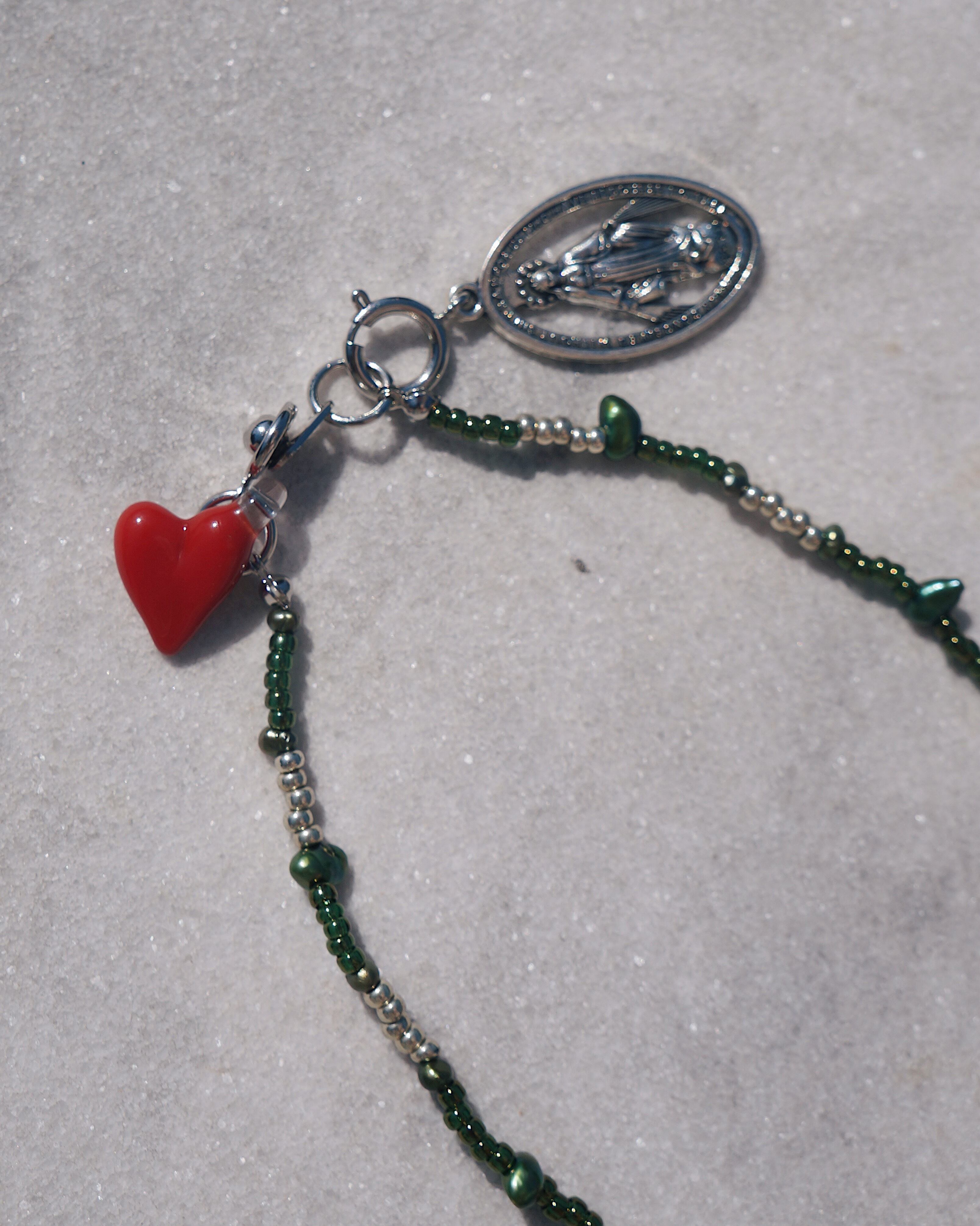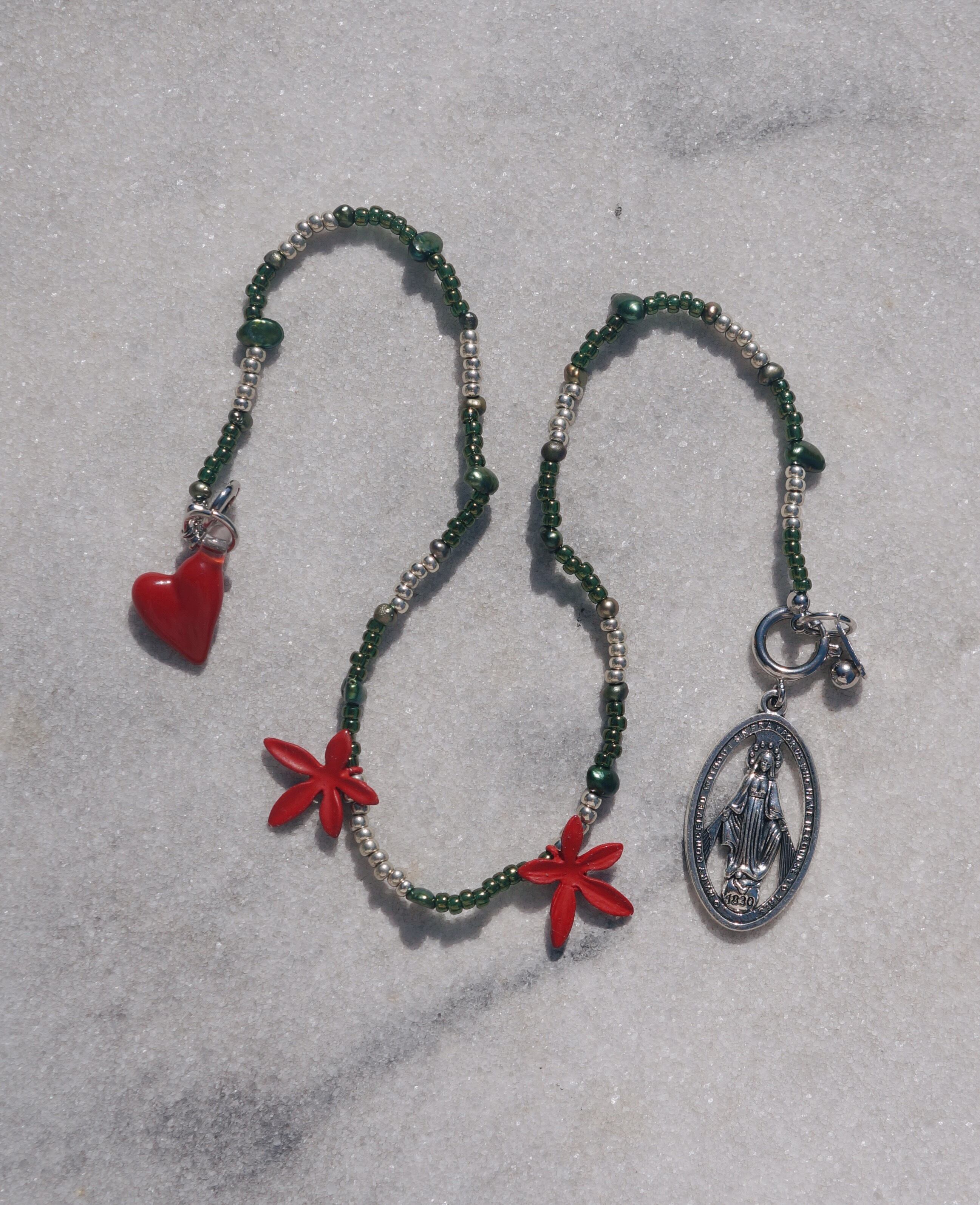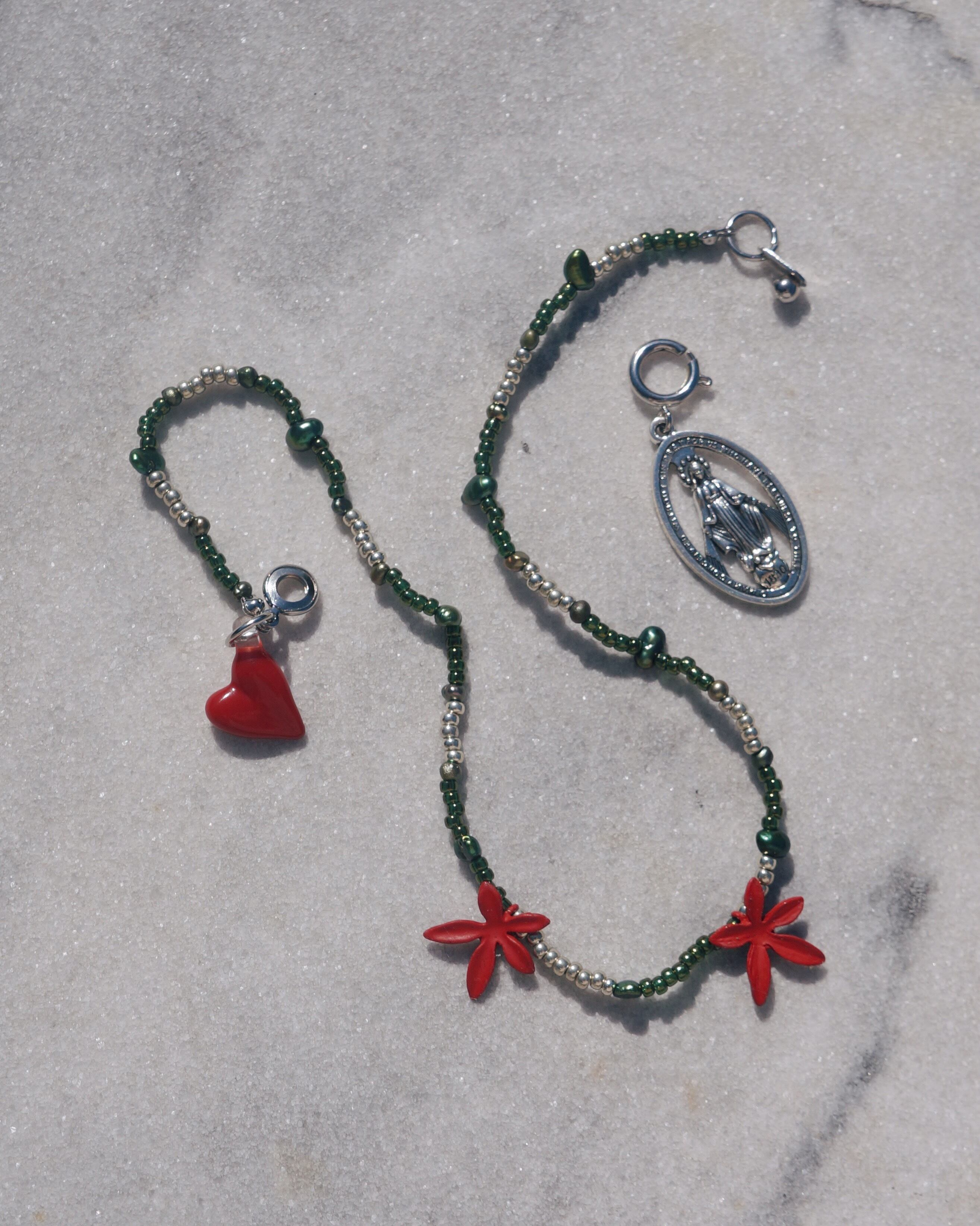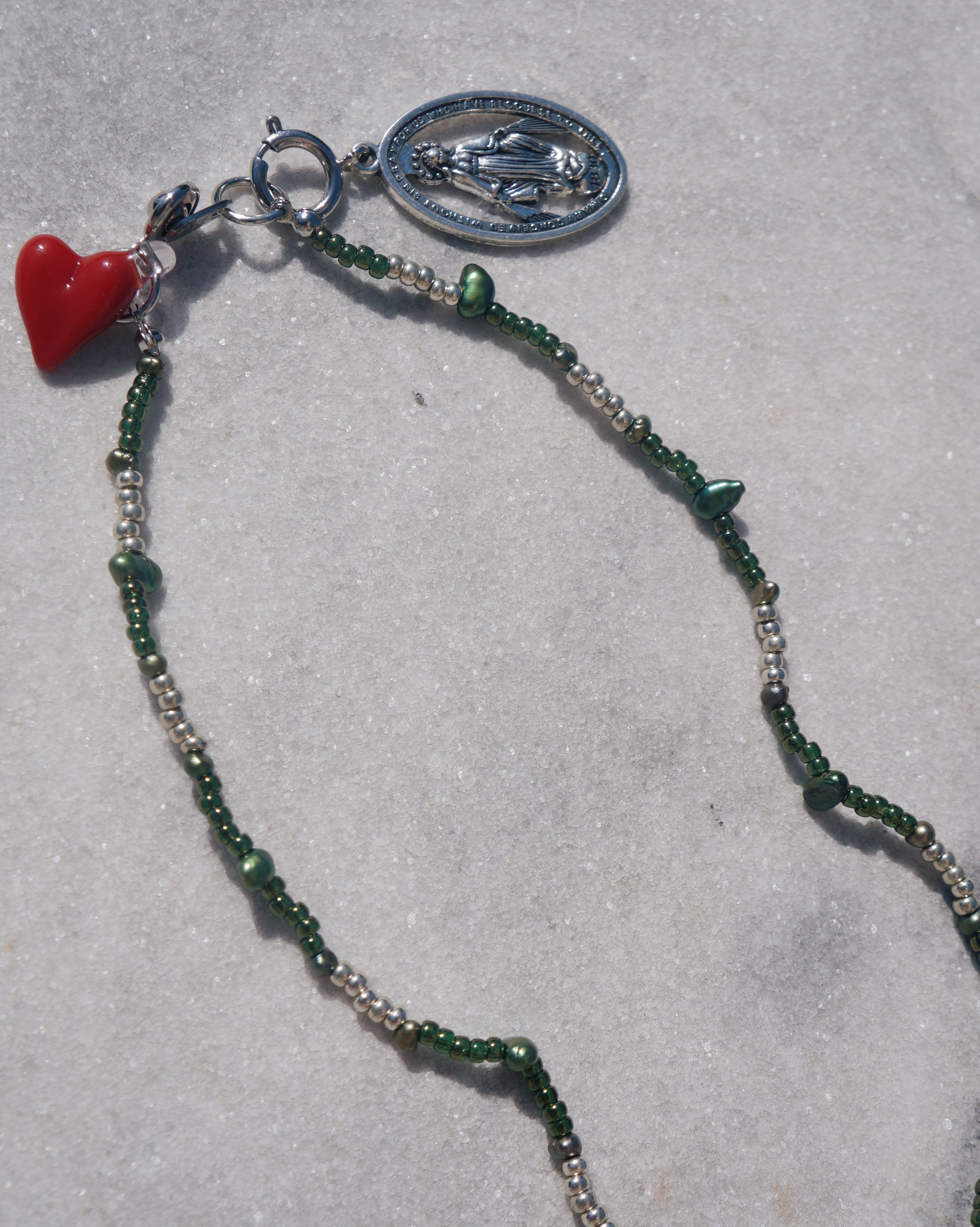 落ち着いたグリーンカラーとシルバーのビーズに葉っぱのチャームとハートのガラスチャームの赤色が差し色になって目を惹くネックレスです。後ろにハートのチャームとメダイチャームをつけ後ろ姿もキュートになるようにデザインしました。メダイのチャームは取り外しが可能です。
