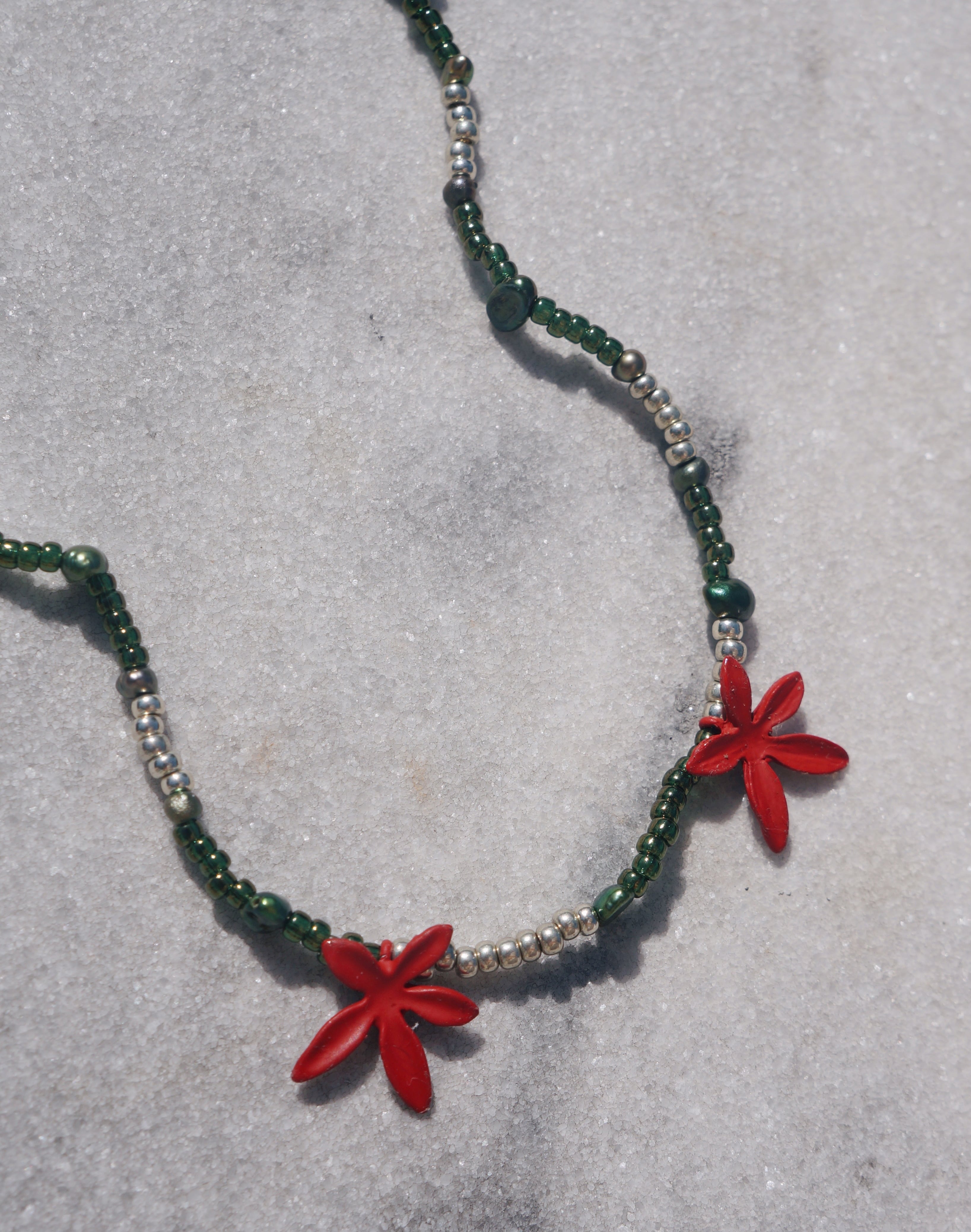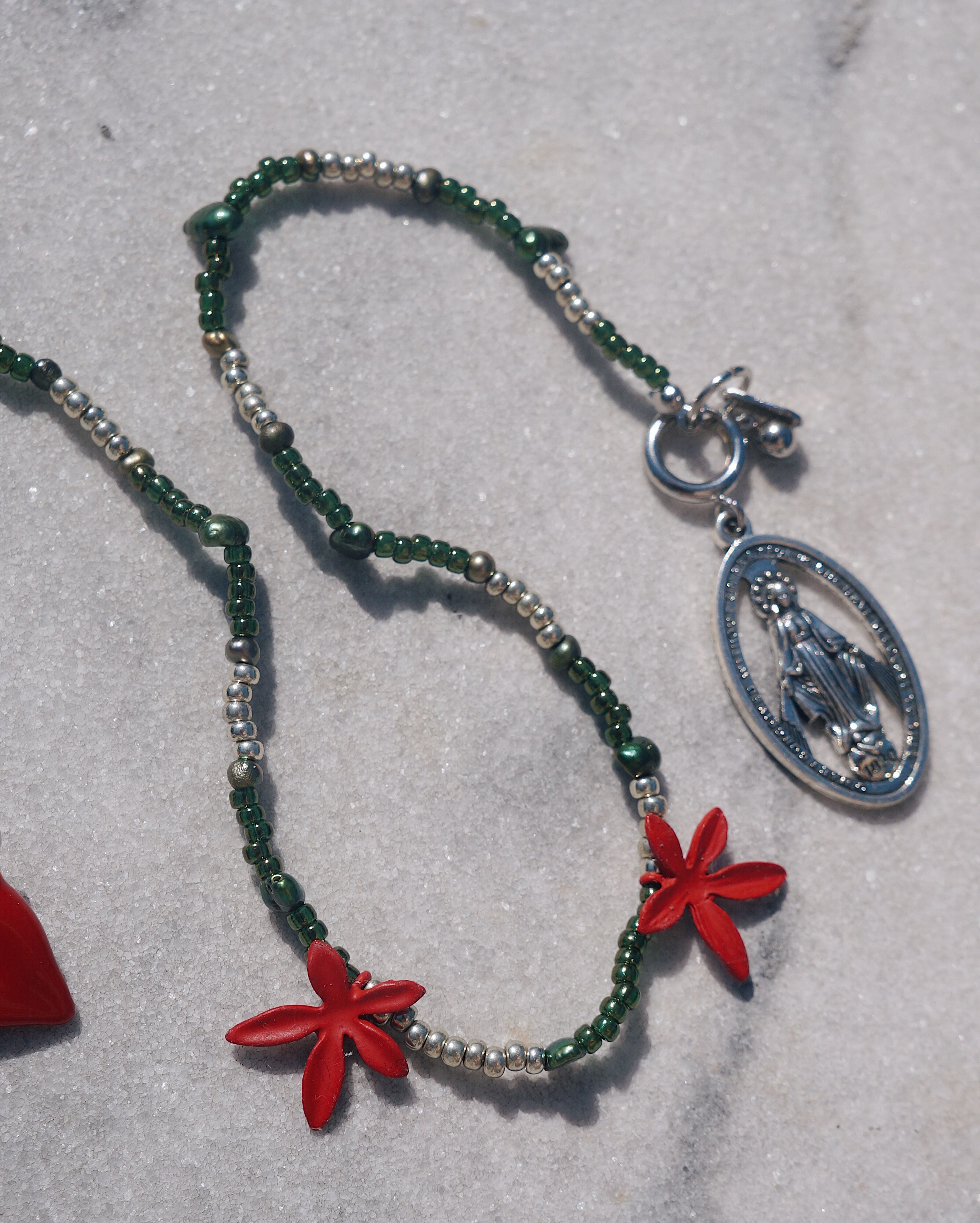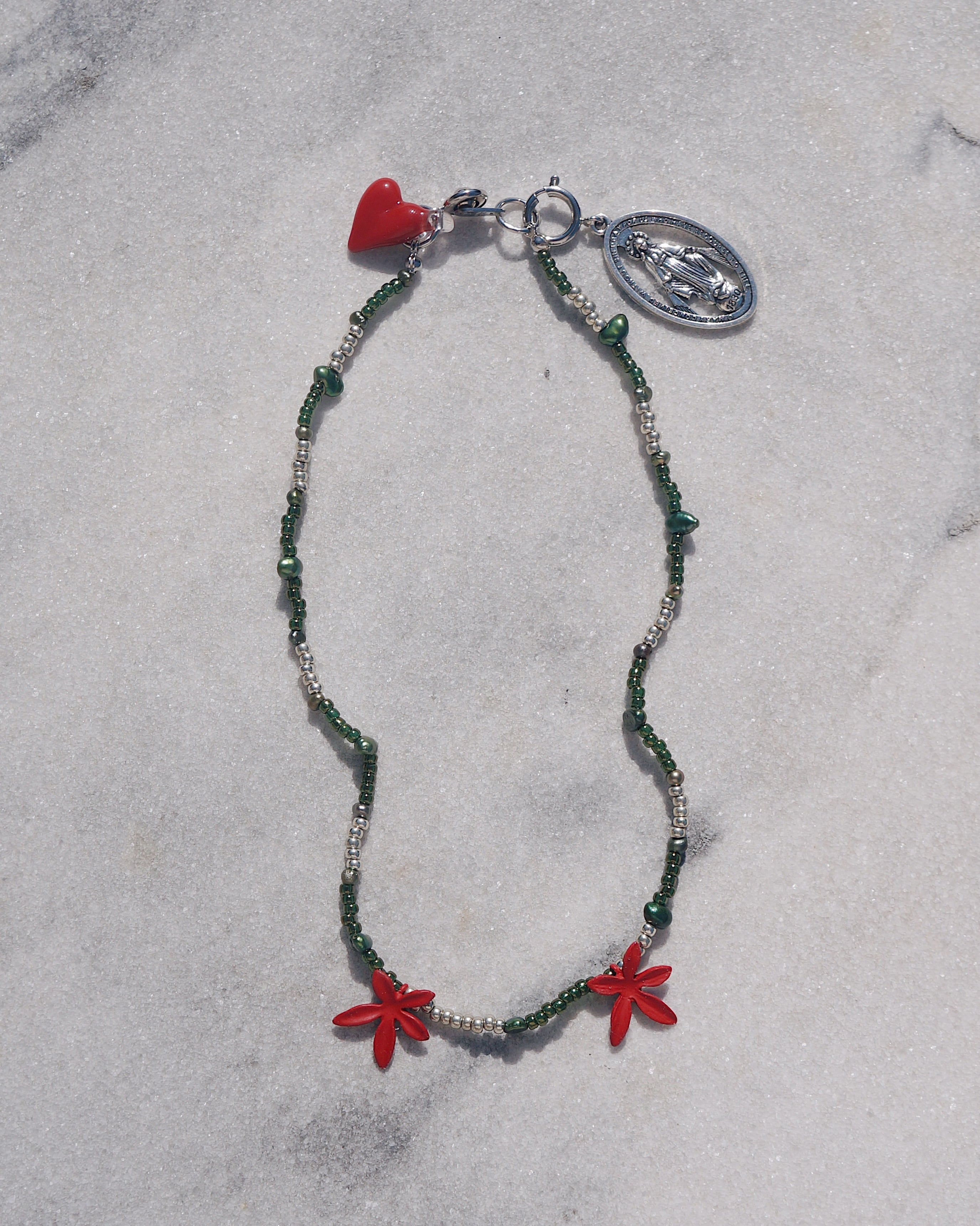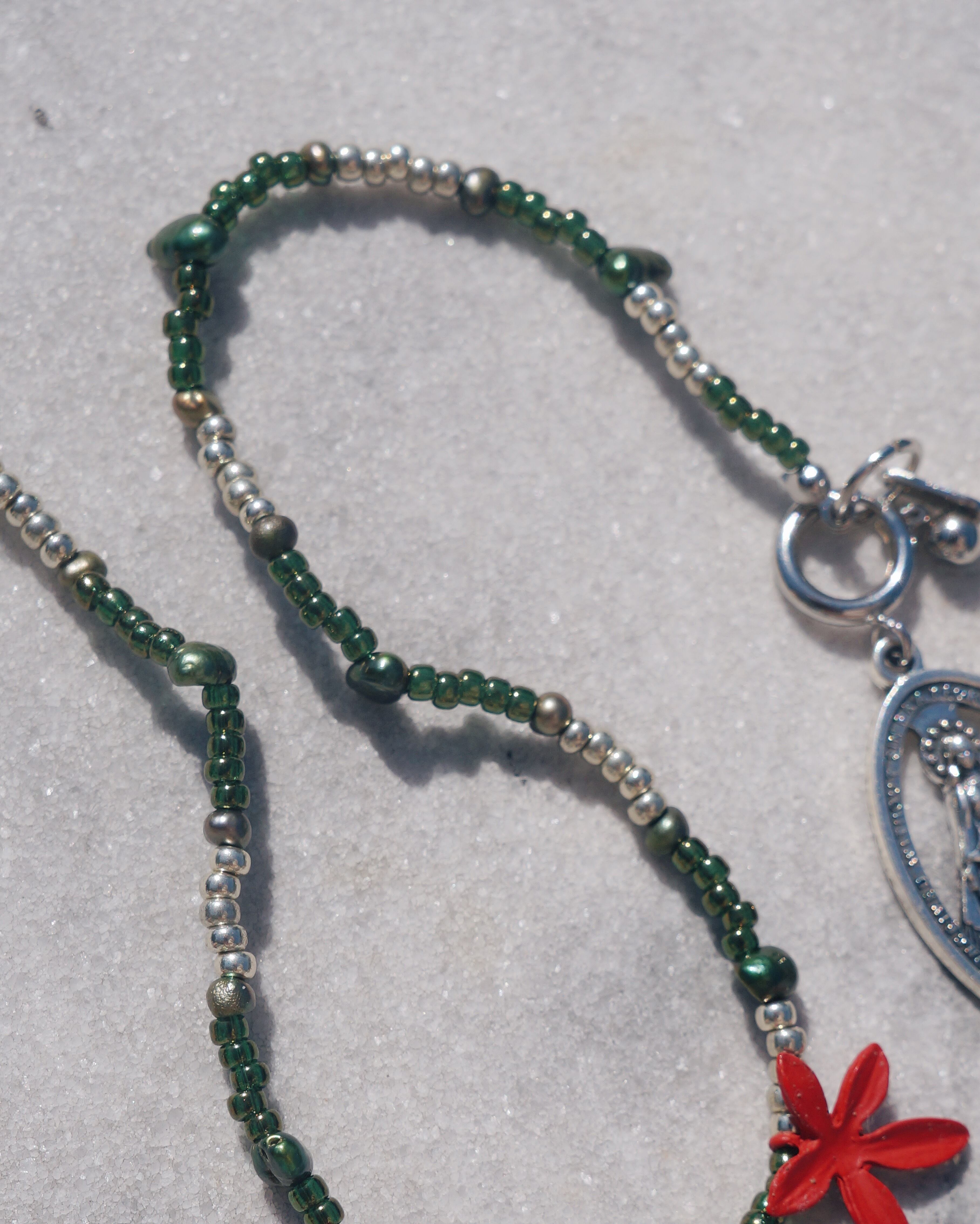 落ち着いたグリーンカラーとシルバーのビーズに葉っぱのチャームとハートのガラスチャームの赤色が差し色になって目を惹くネックレスです。後ろにハートのチャームとメダイチャームをつけ後ろ姿もキュートになるようにデザインしました。メダイのチャームは取り外しが可能です。