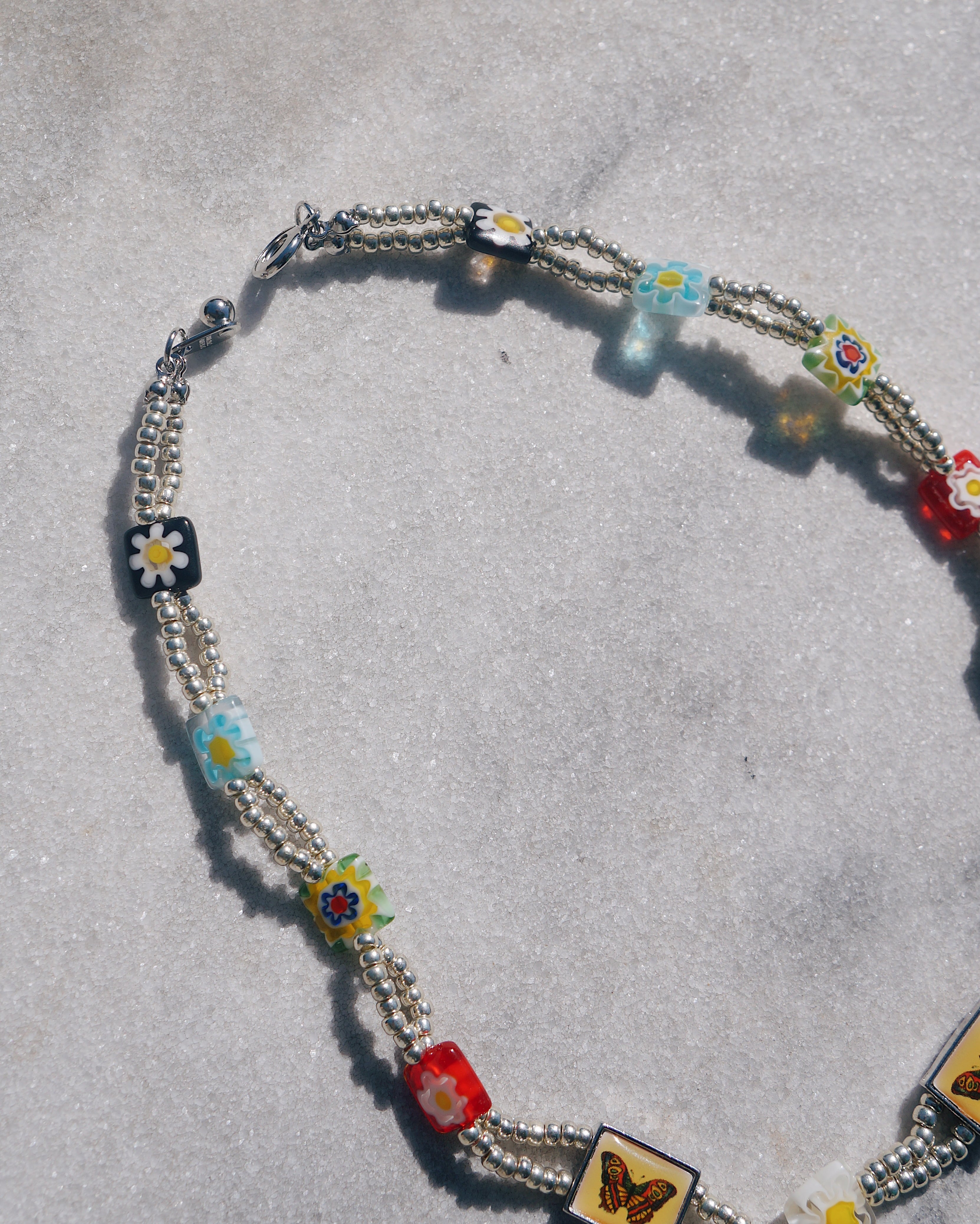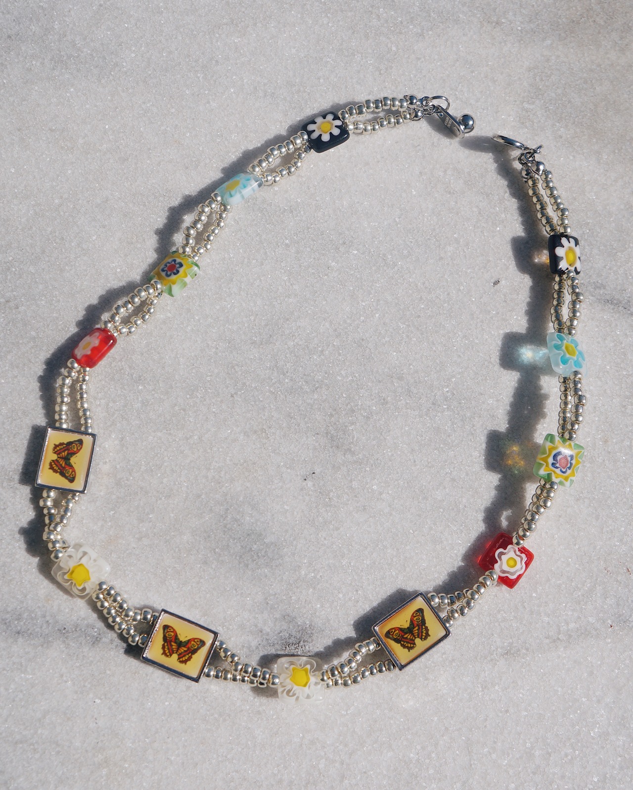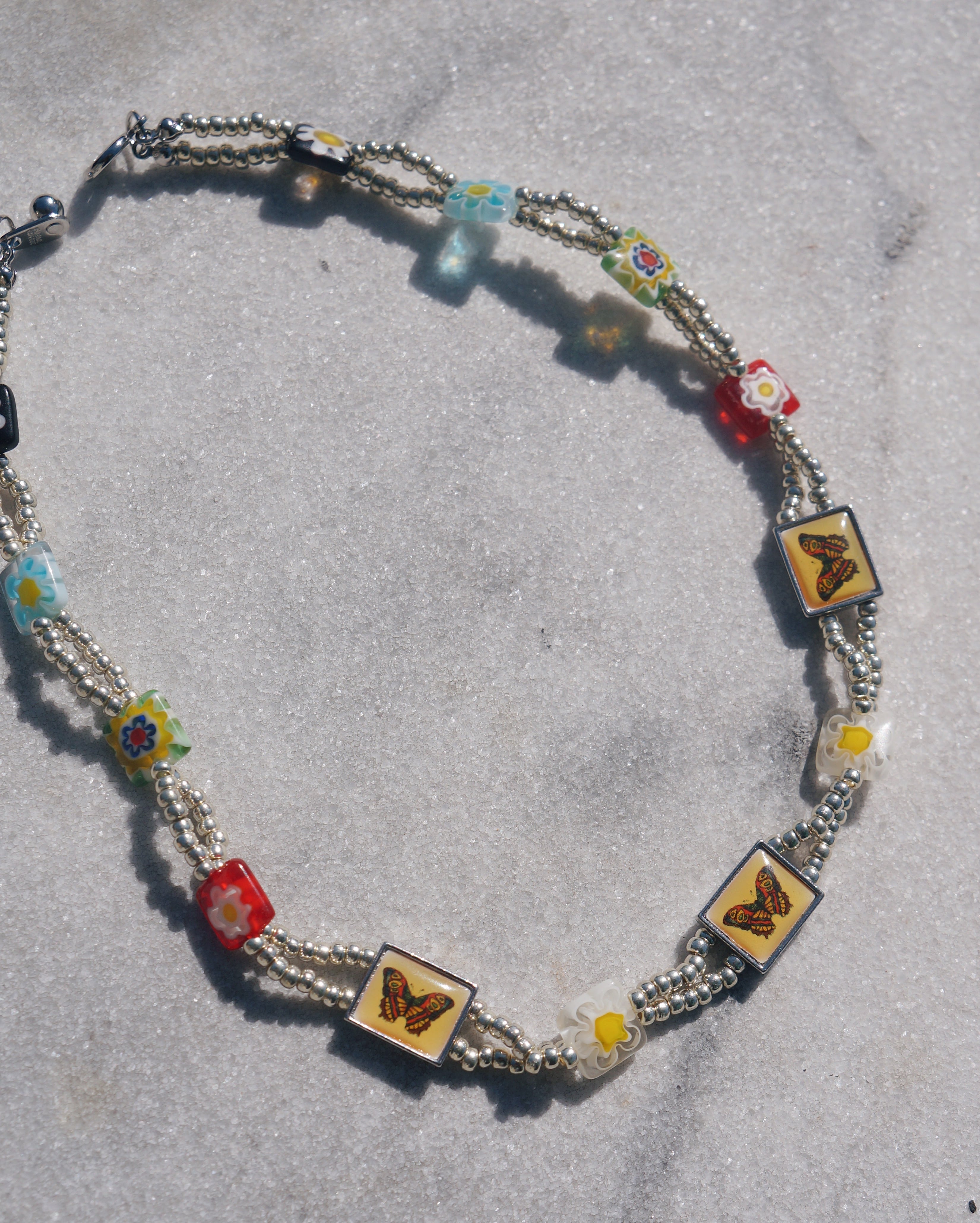 蝶が描かれたビンテージのパーツがユニークでキュートなネックレスです。さらに様々なあカラーのミルフィオリのガラスビーズが美しいです。