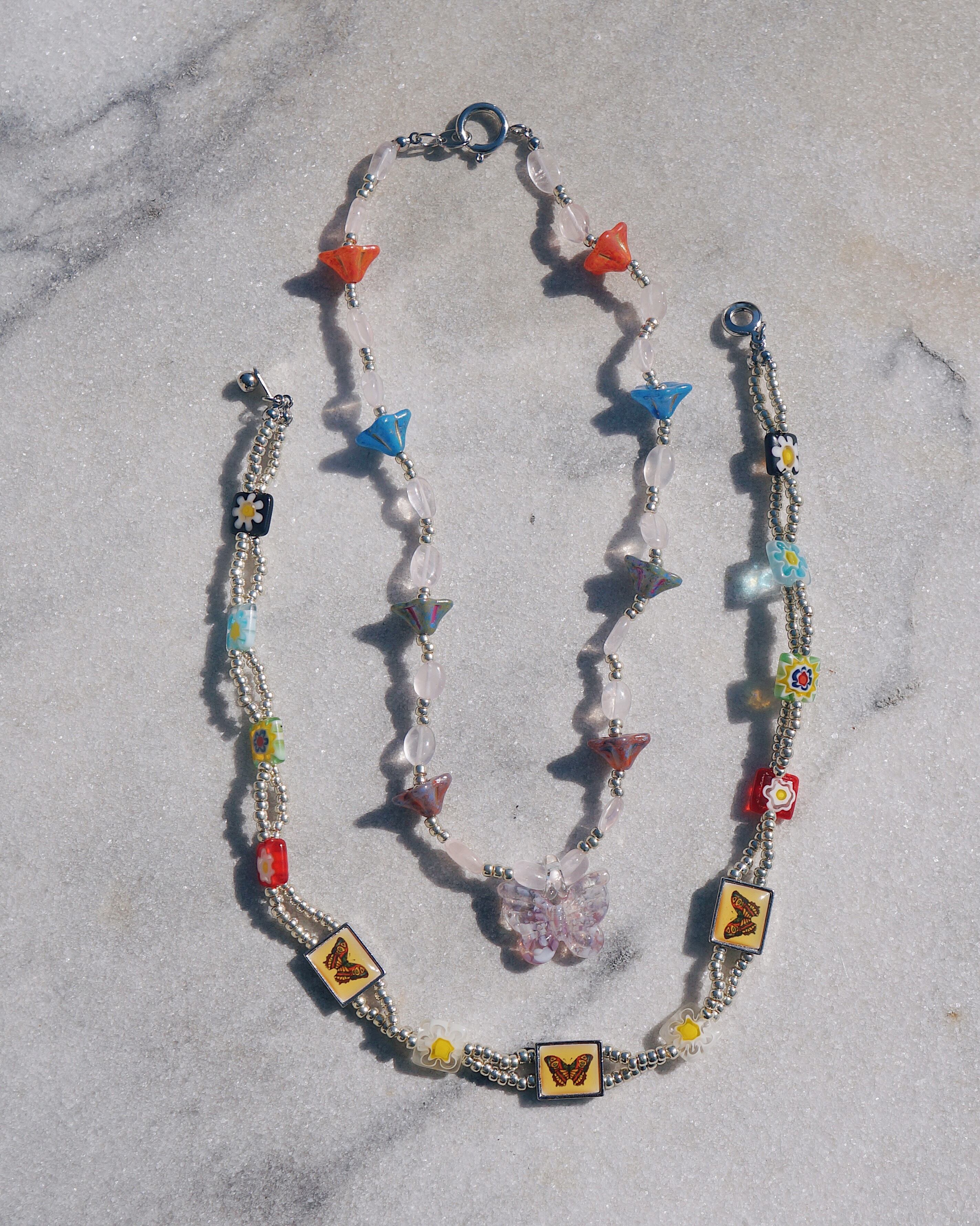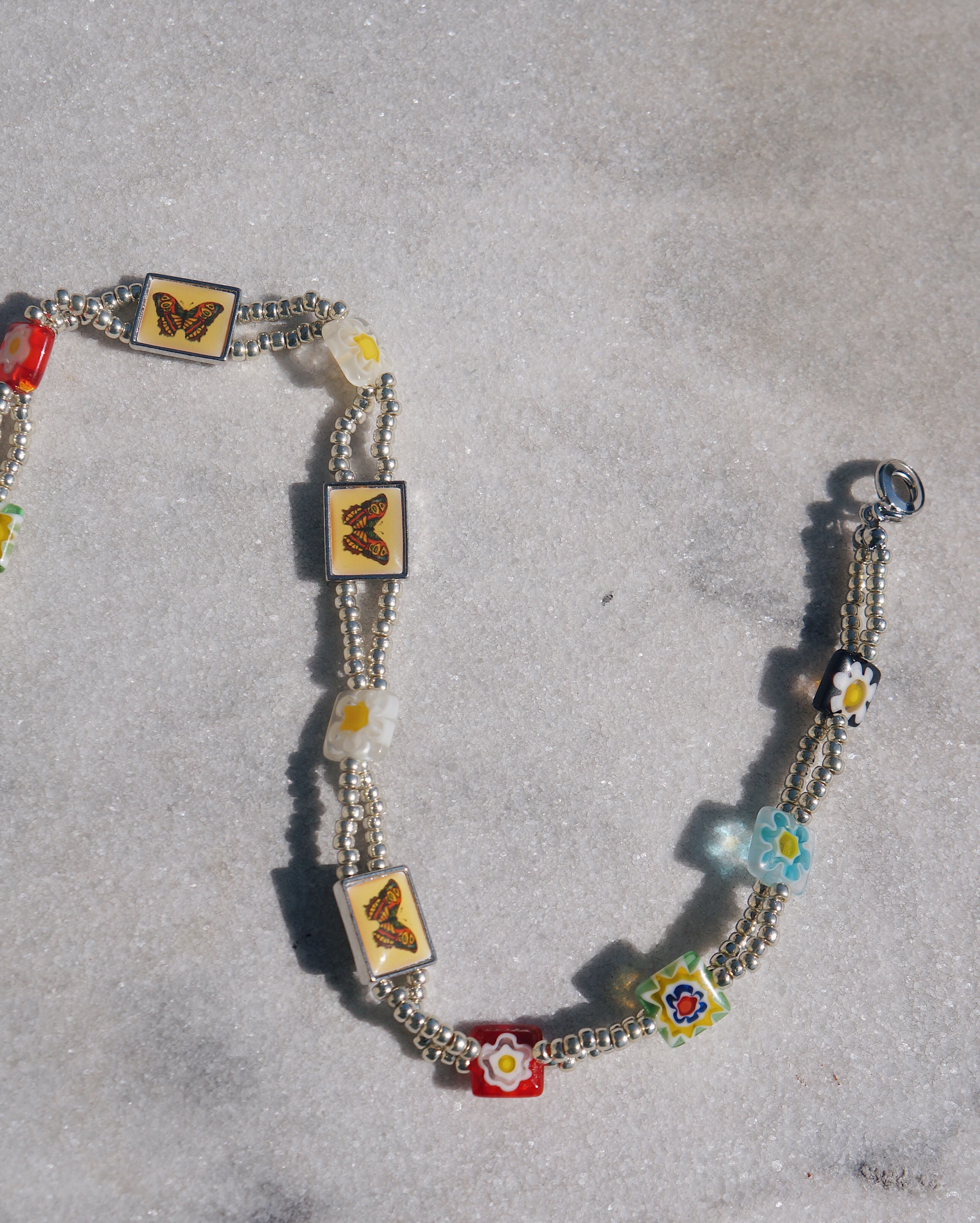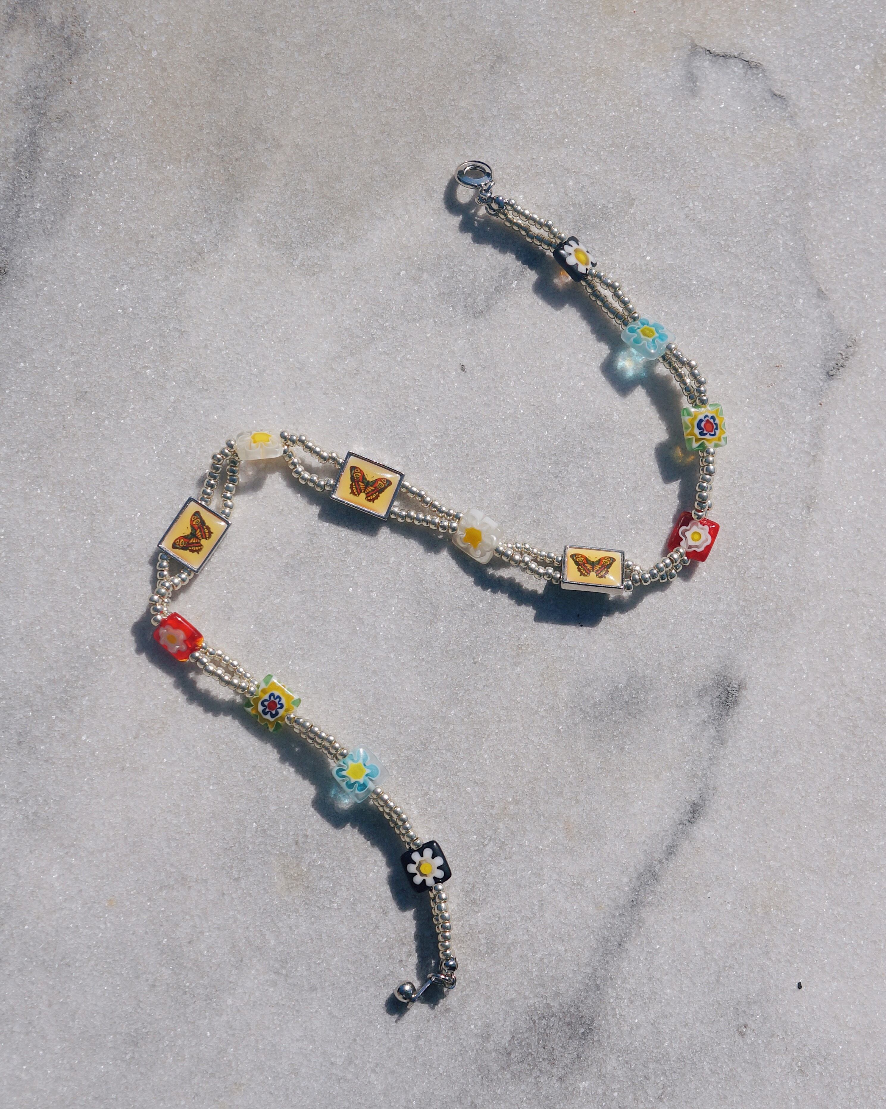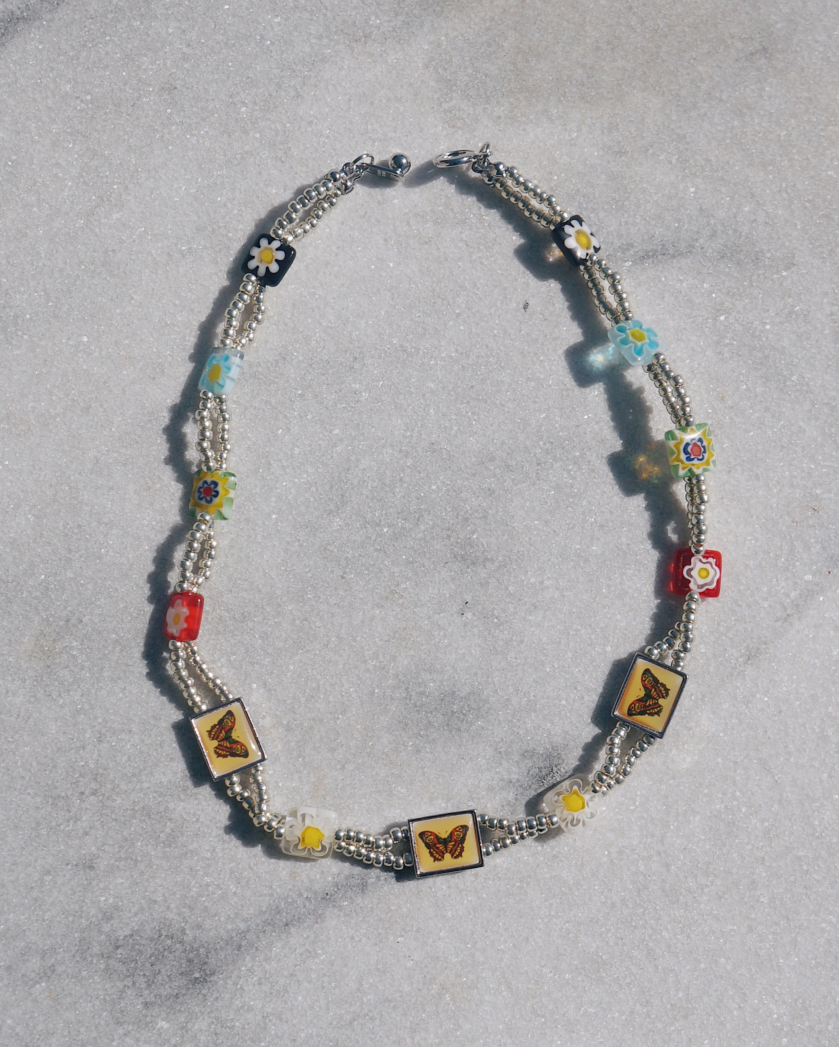 蝶が描かれたビンテージのパーツがユニークでキュートなネックレスです。さらに様々なあカラーのミルフィオリのガラスビーズが美しいです。