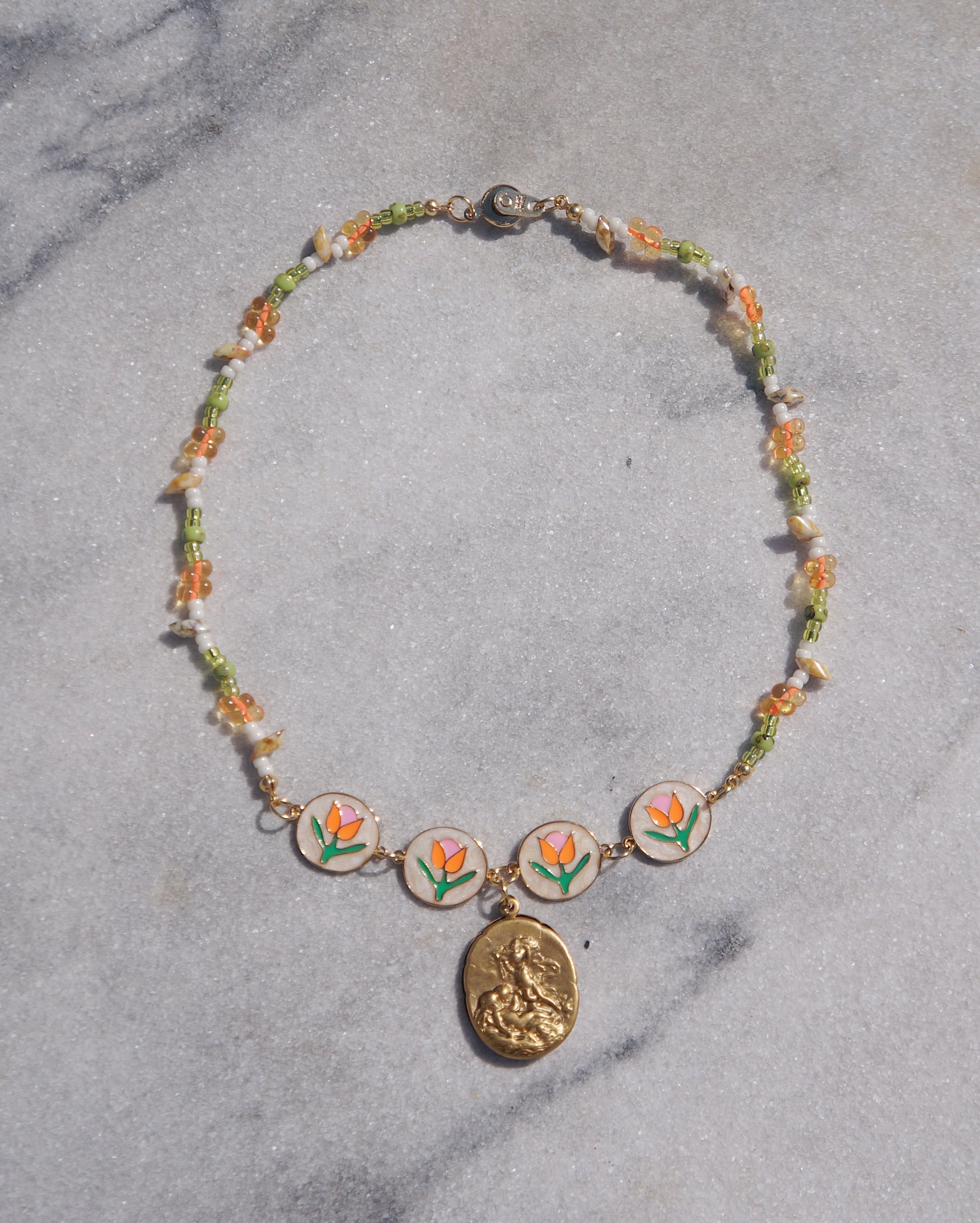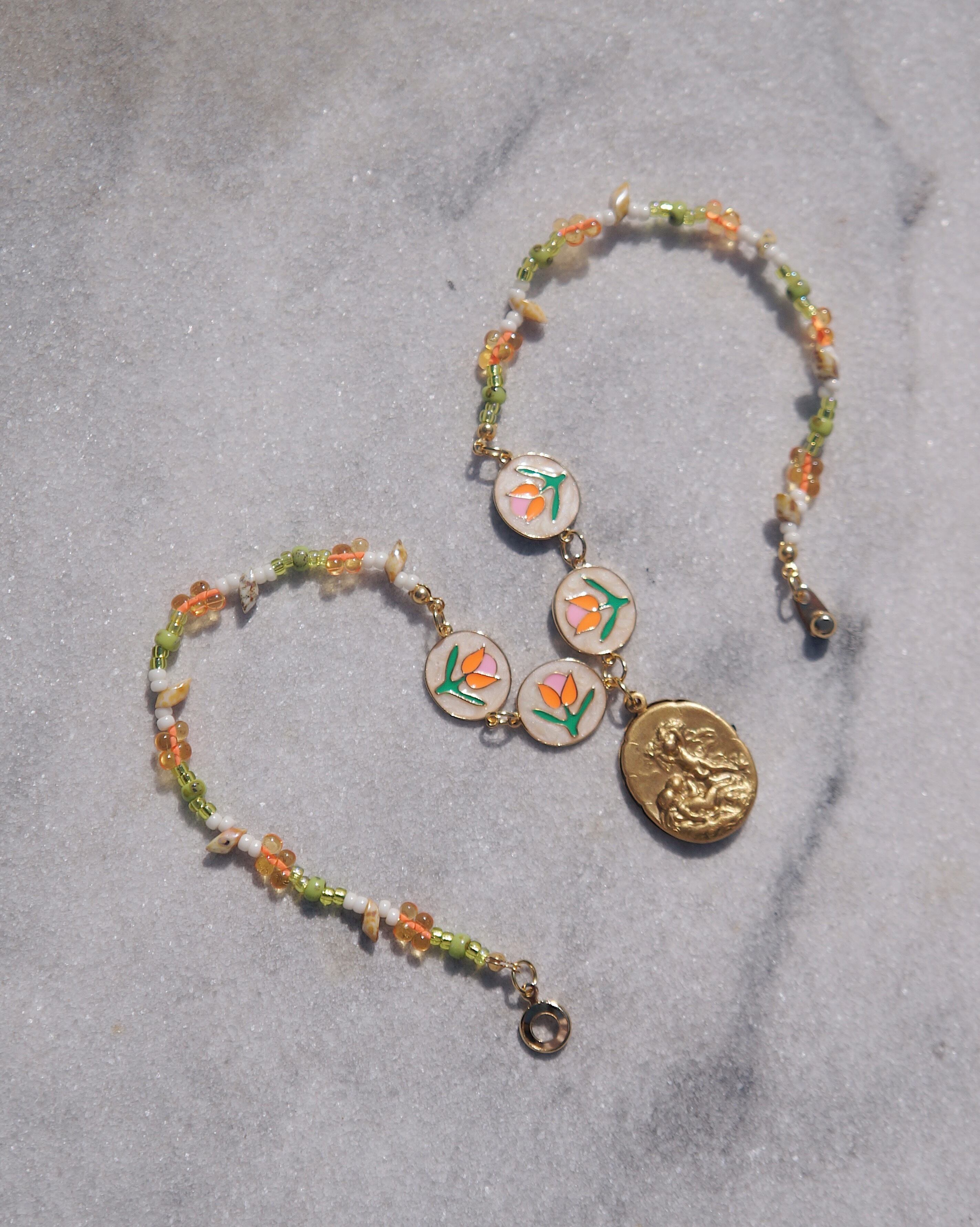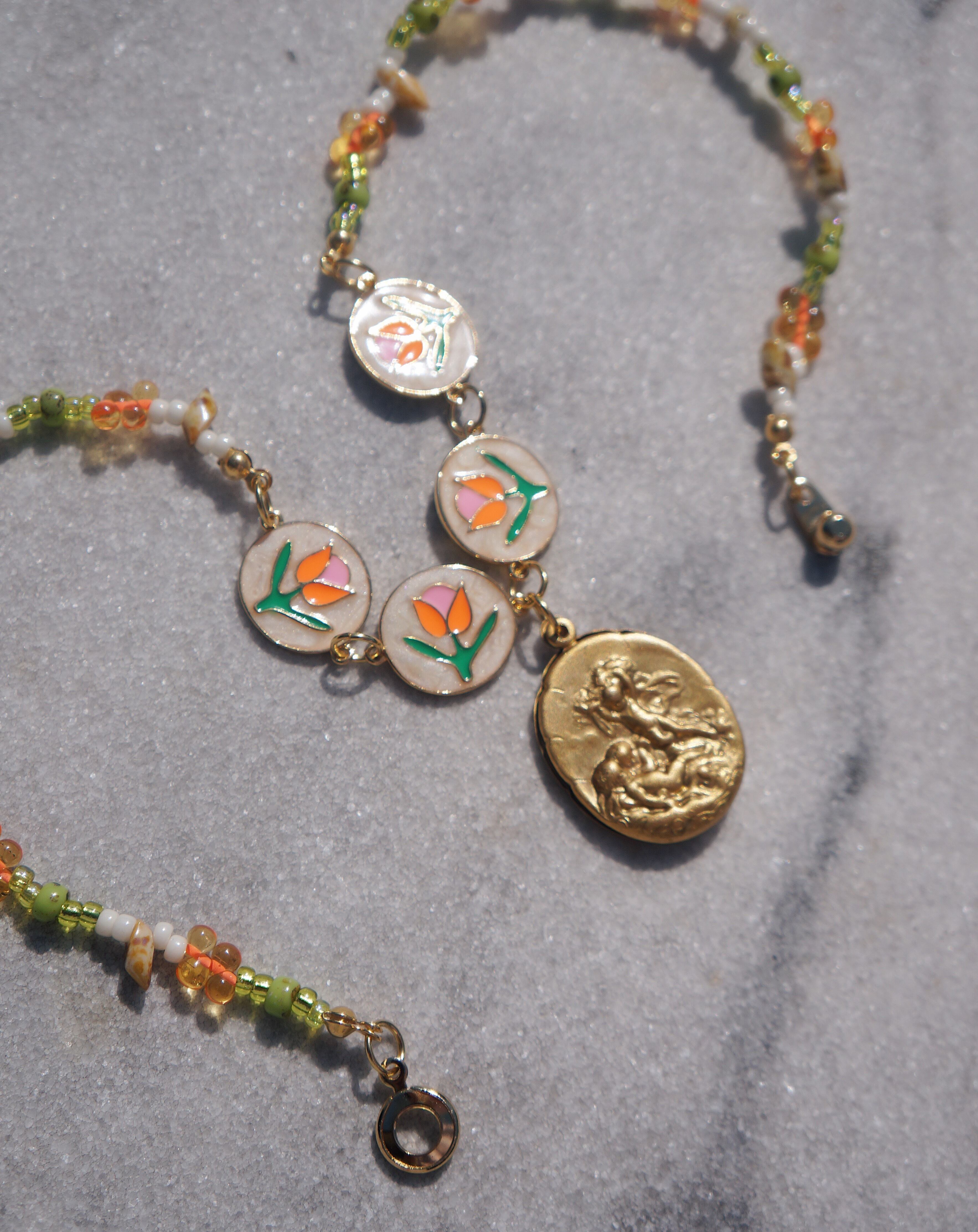 チューリップが描かれたパーツと様々なカラーのビーズのコンビネーション、そしてビンテージぽさがある真鍮製の天使が描かれたチャームがどれもとってもキュートなネックレスです。ポカポカ陽気な春が感じられるような一点です。