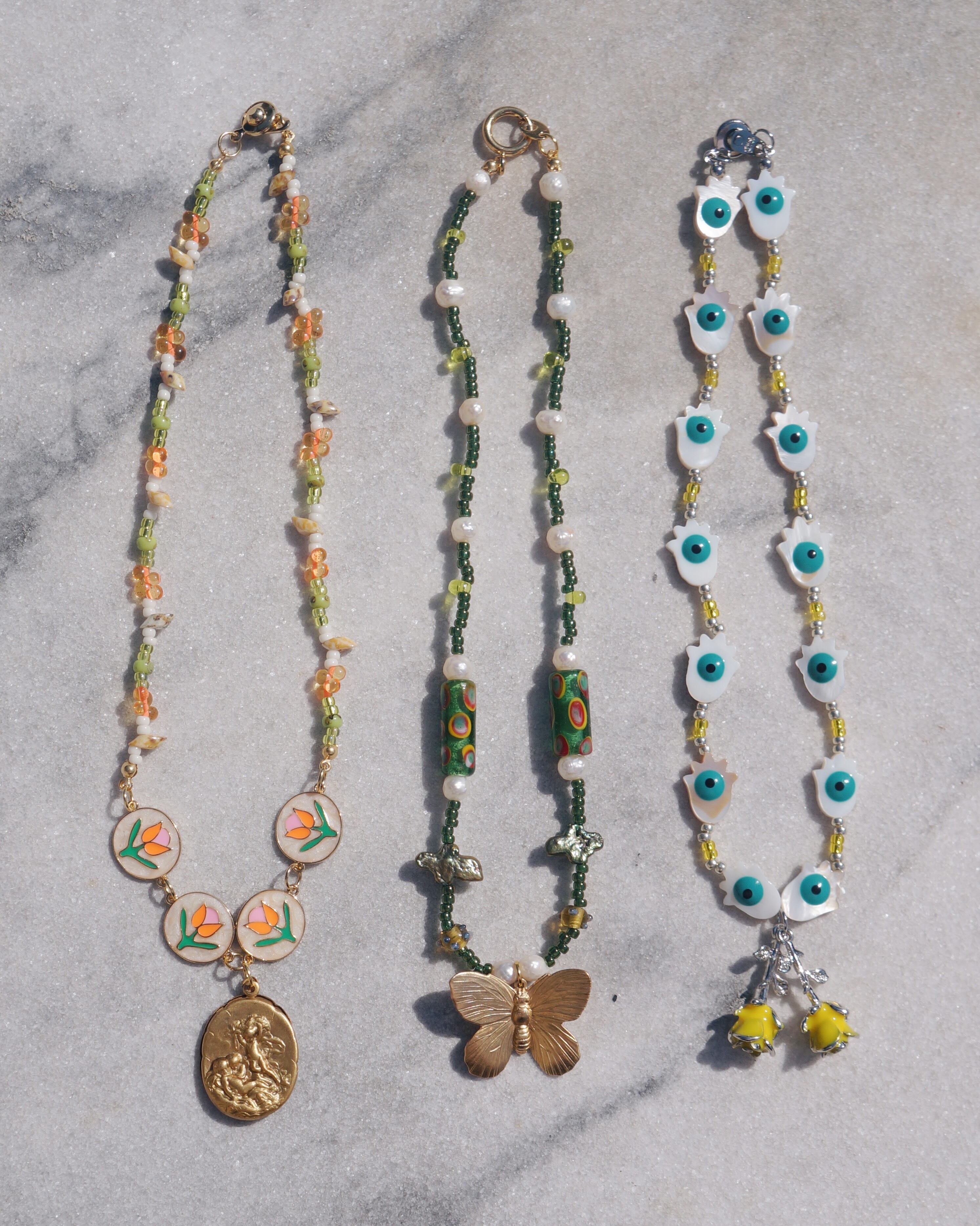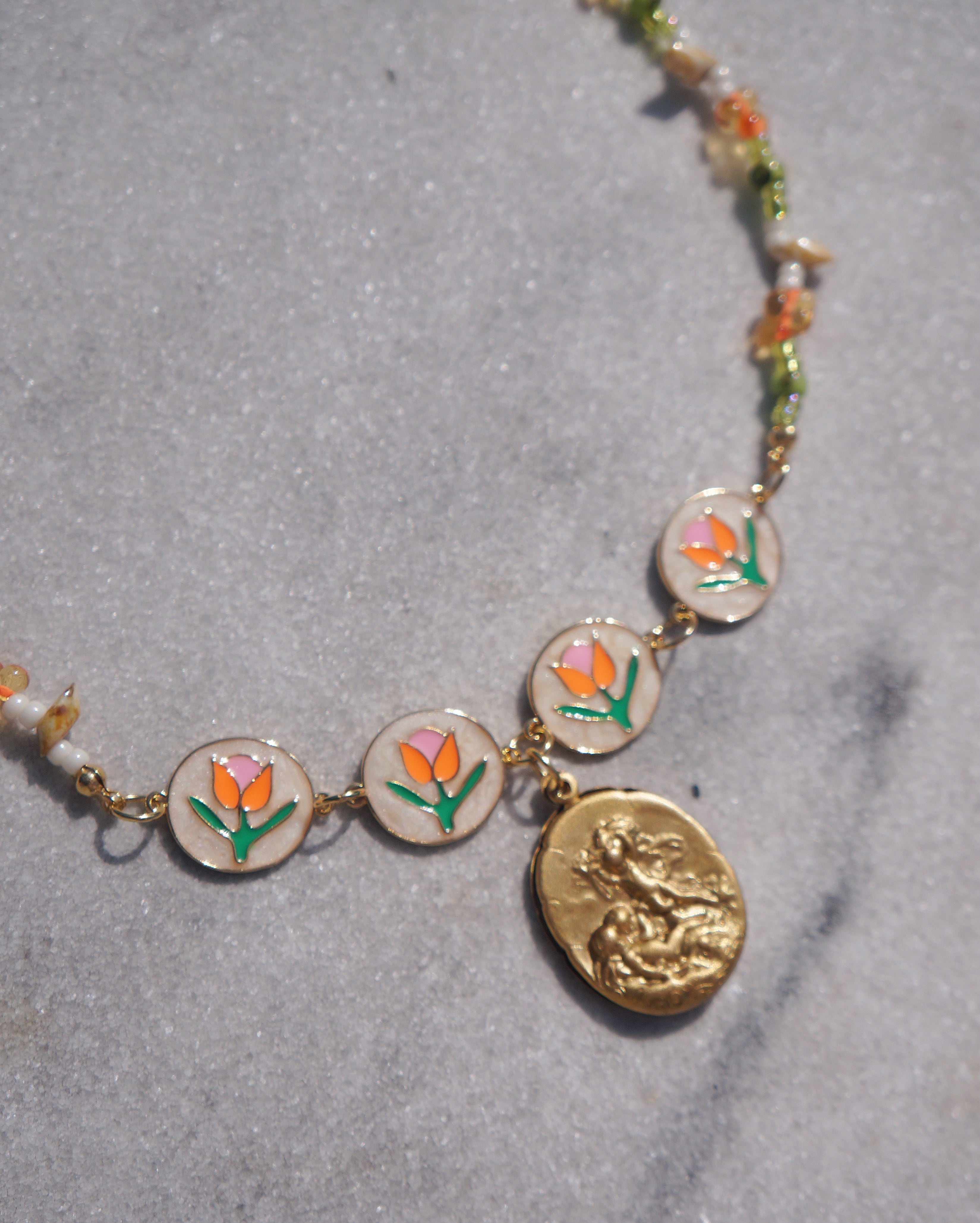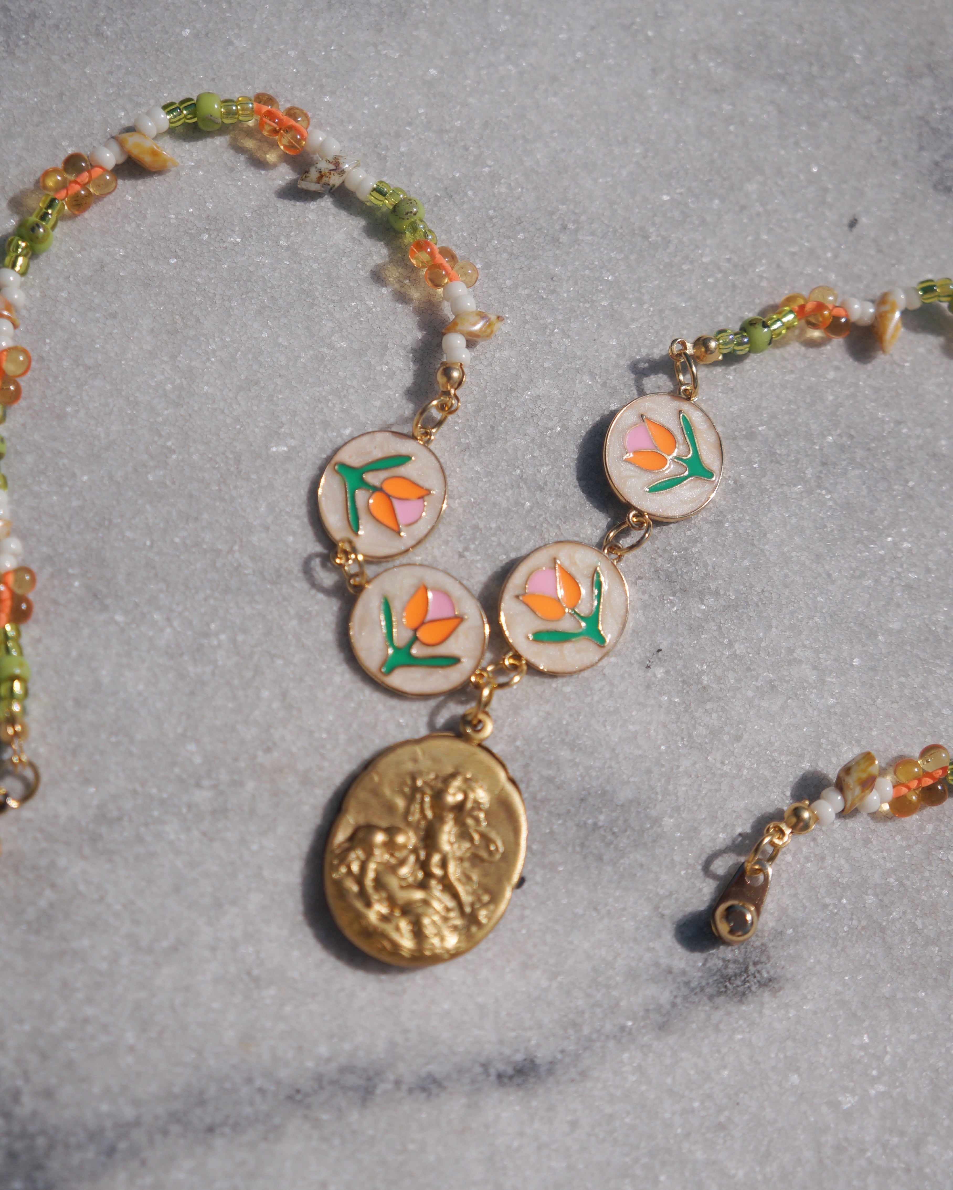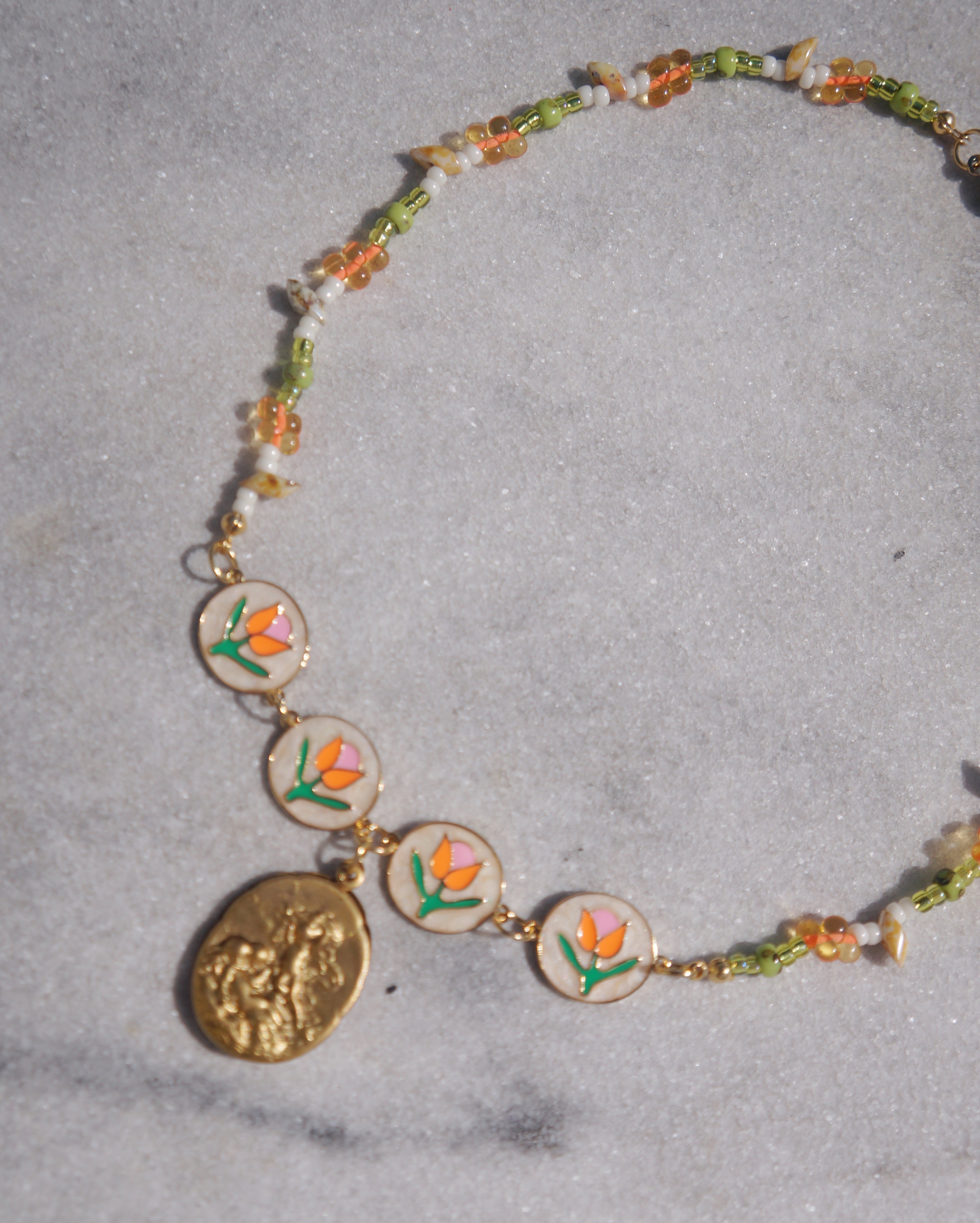 チューリップが描かれたパーツと様々なカラーのビーズのコンビネーション、そしてビンテージぽさがある真鍮製の天使が描かれたチャームがどれもとってもキュートなネックレスです。ポカポカ陽気な春が感じられるような一点です。
