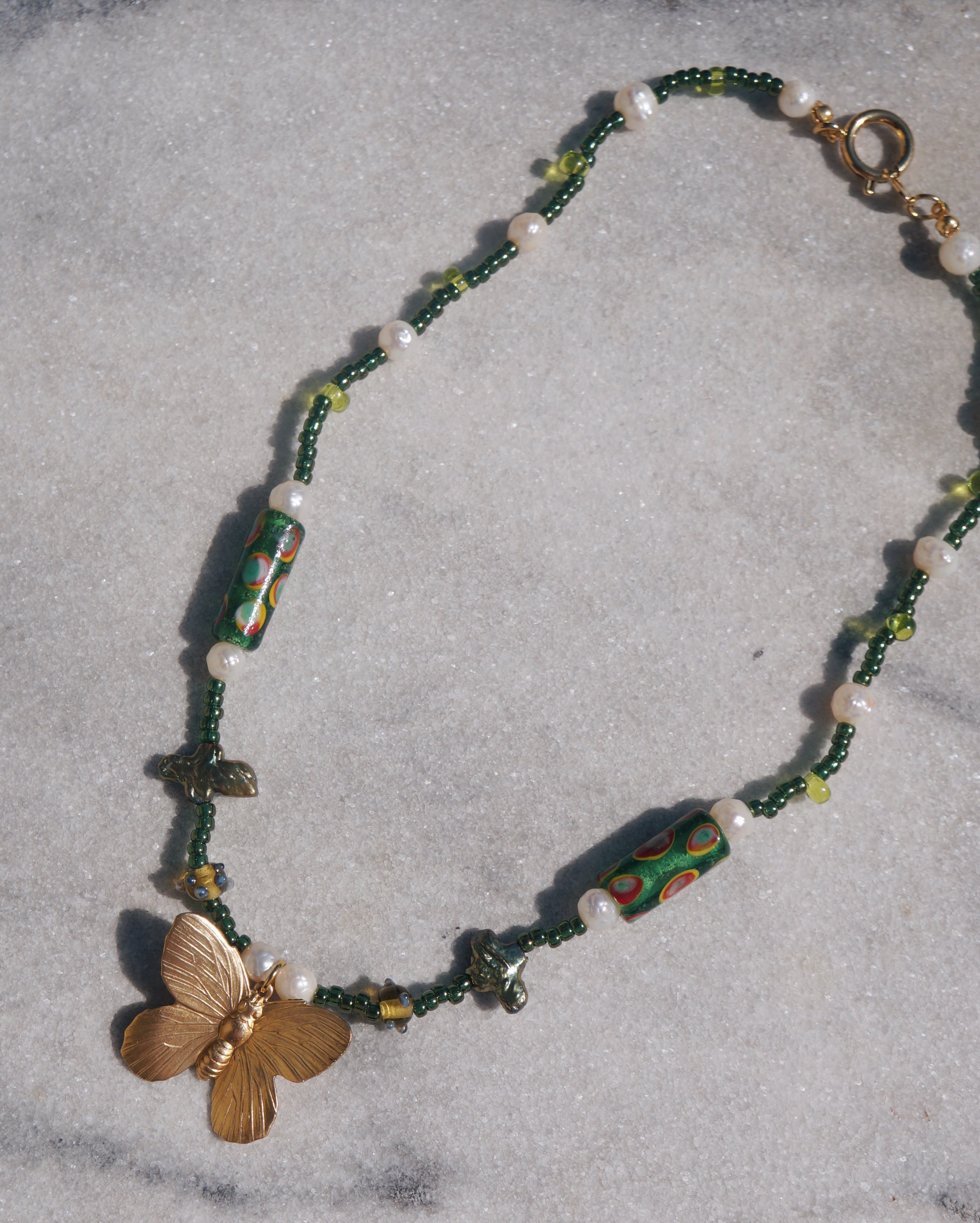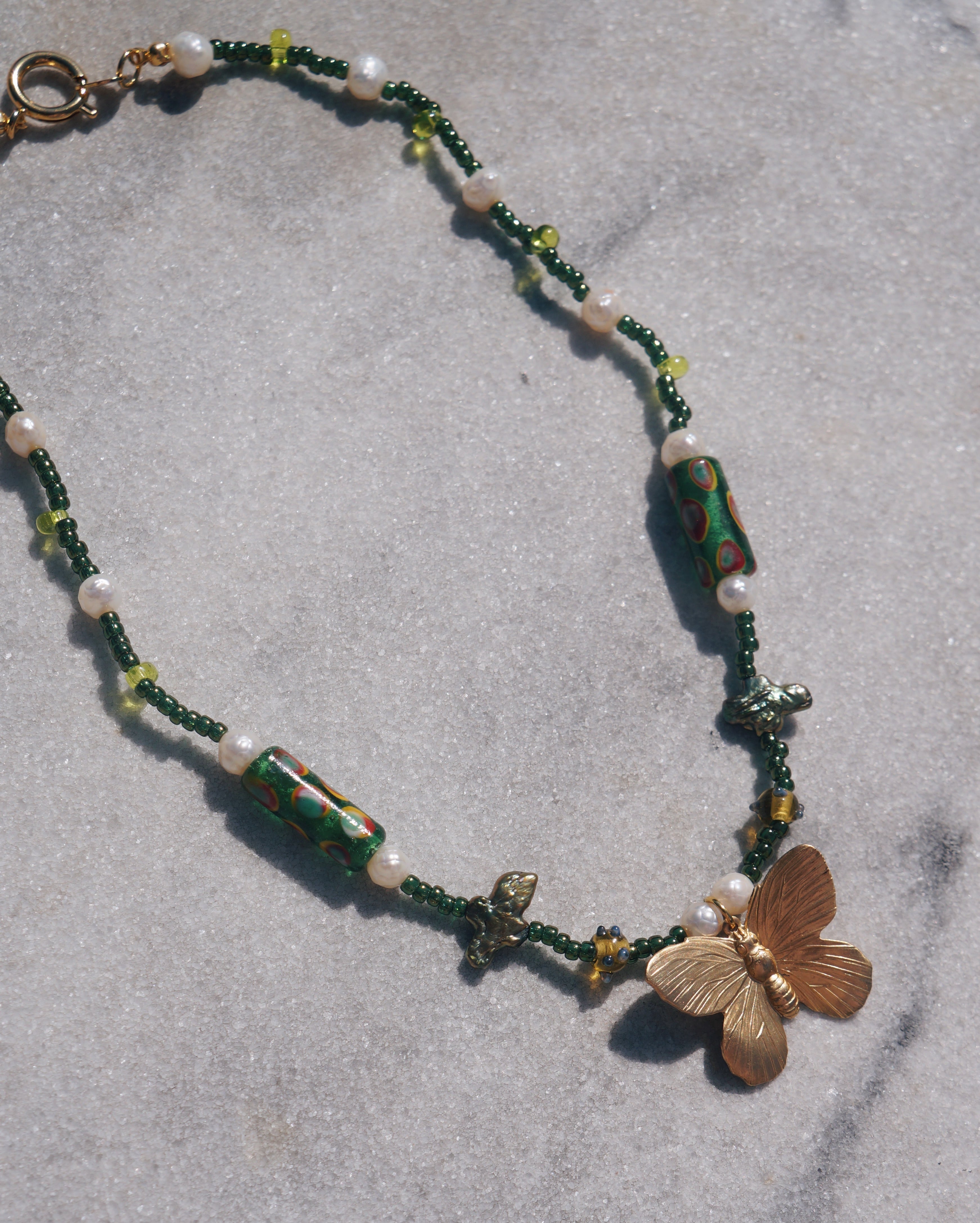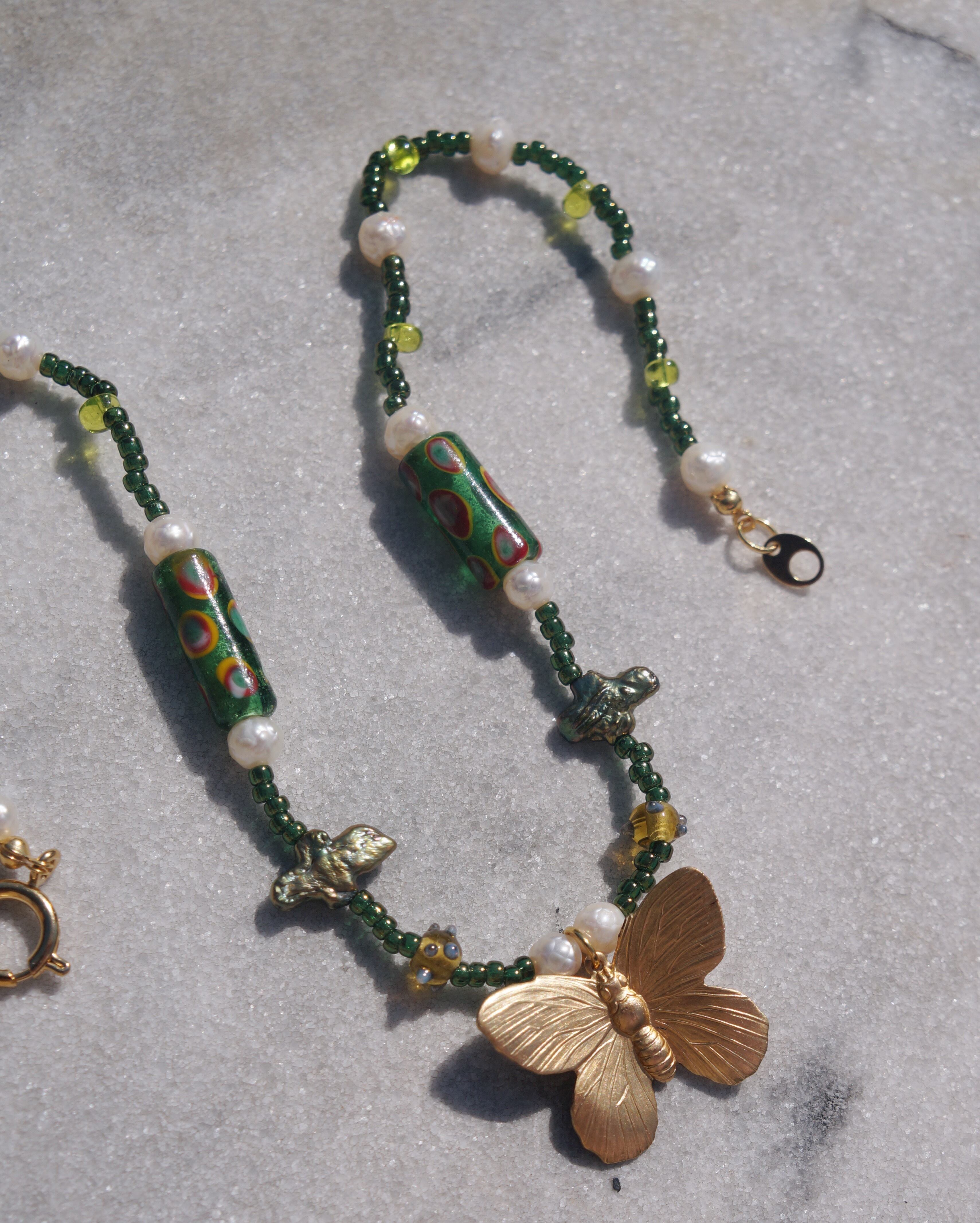 渋いグリーンのカラーと、ユニークなガラスビーズや、淡水パール、そしてビンテージぽさがある真鍮製の蝶のチャームがどれもとってもキュートなネックレスです。ユニークなデザインでありながらどのようなお洋服にも割と合わせやすい一点です。
