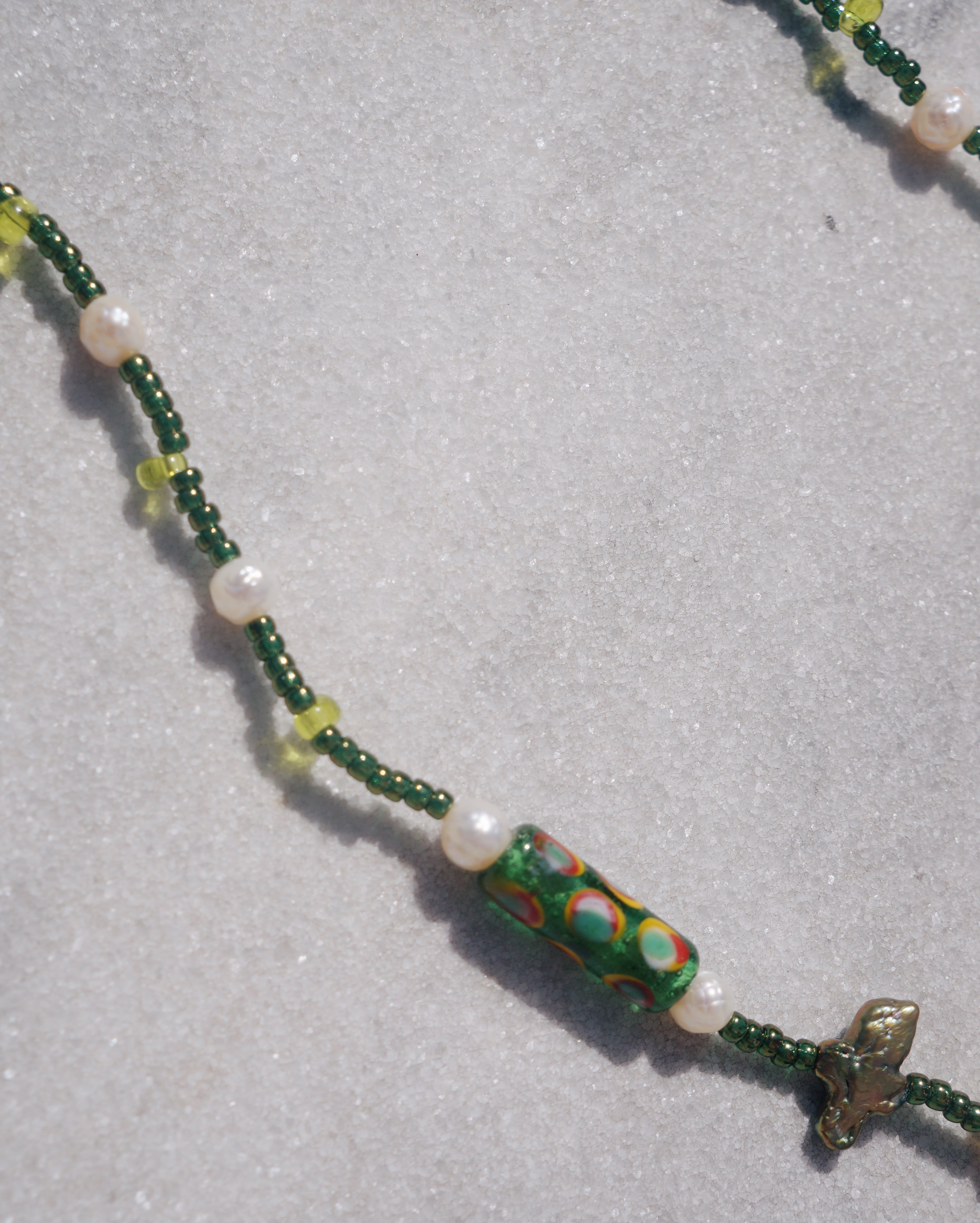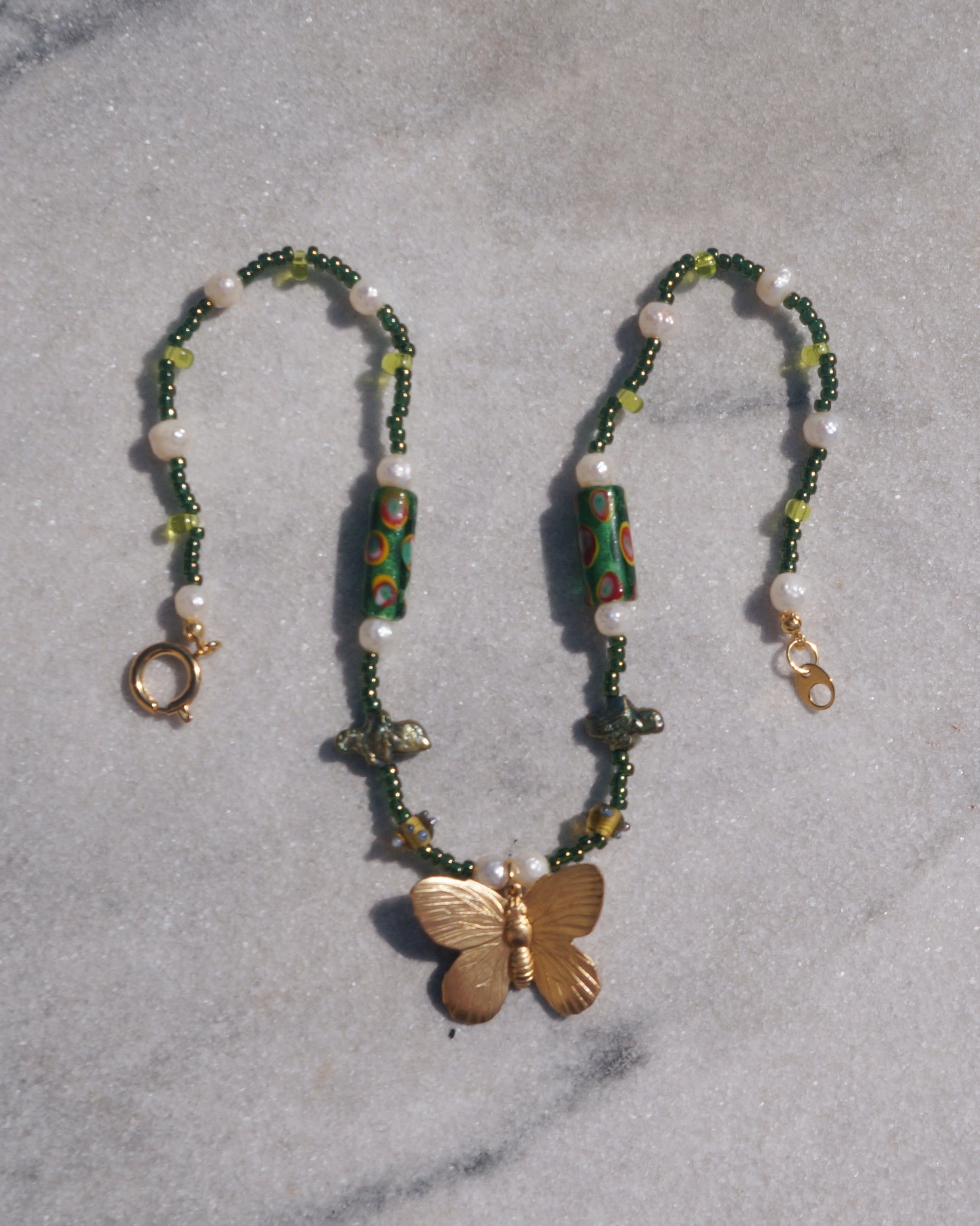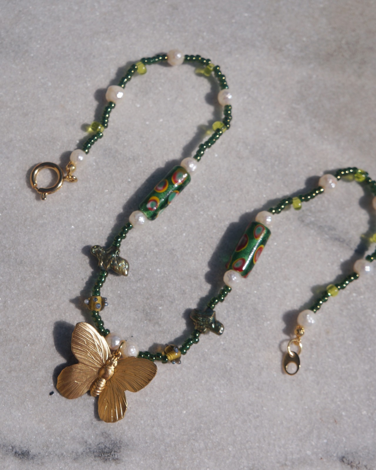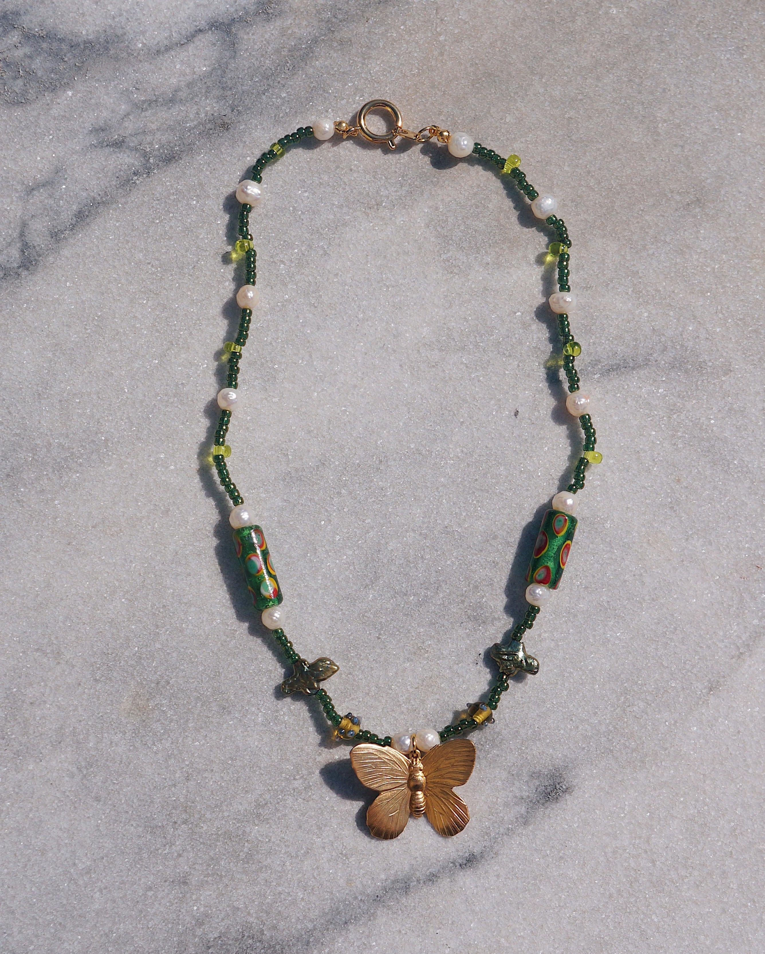渋いグリーンのカラーと、ユニークなガラスビーズや、淡水パール、そしてビンテージぽさがある真鍮製の蝶のチャームがどれもとってもキュートなネックレスです。ユニークなデザインでありながらどのようなお洋服にも割と合わせやすい一点です。