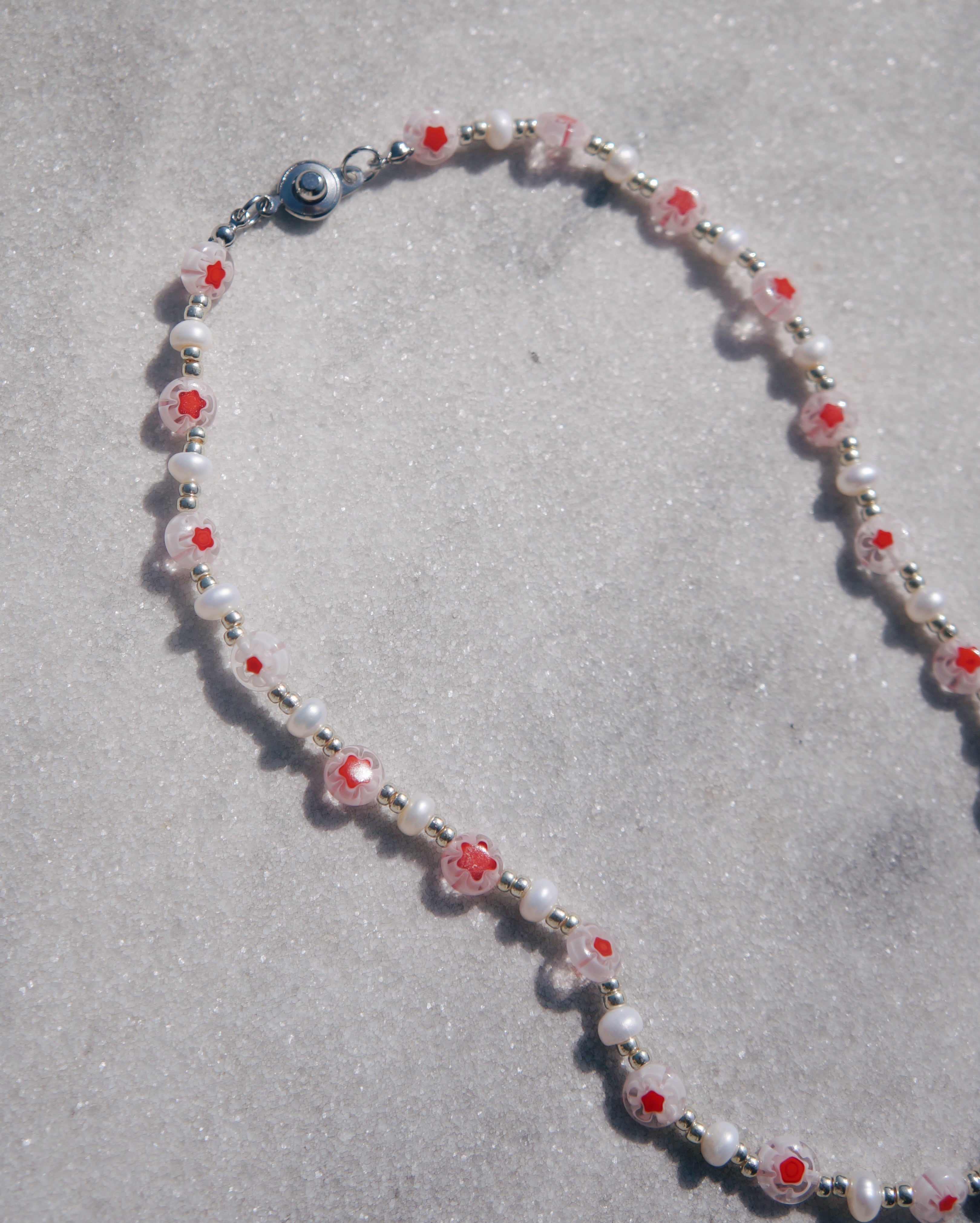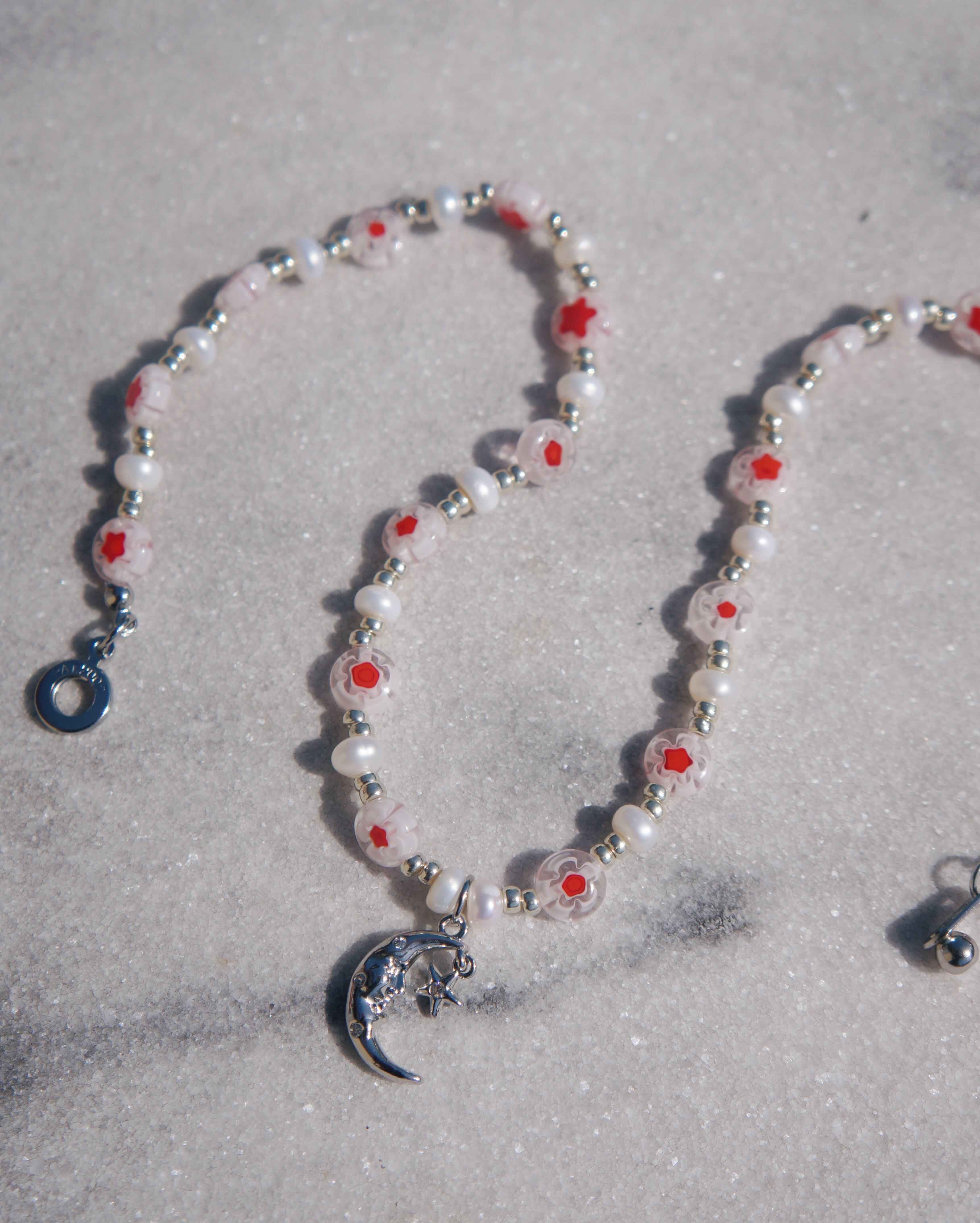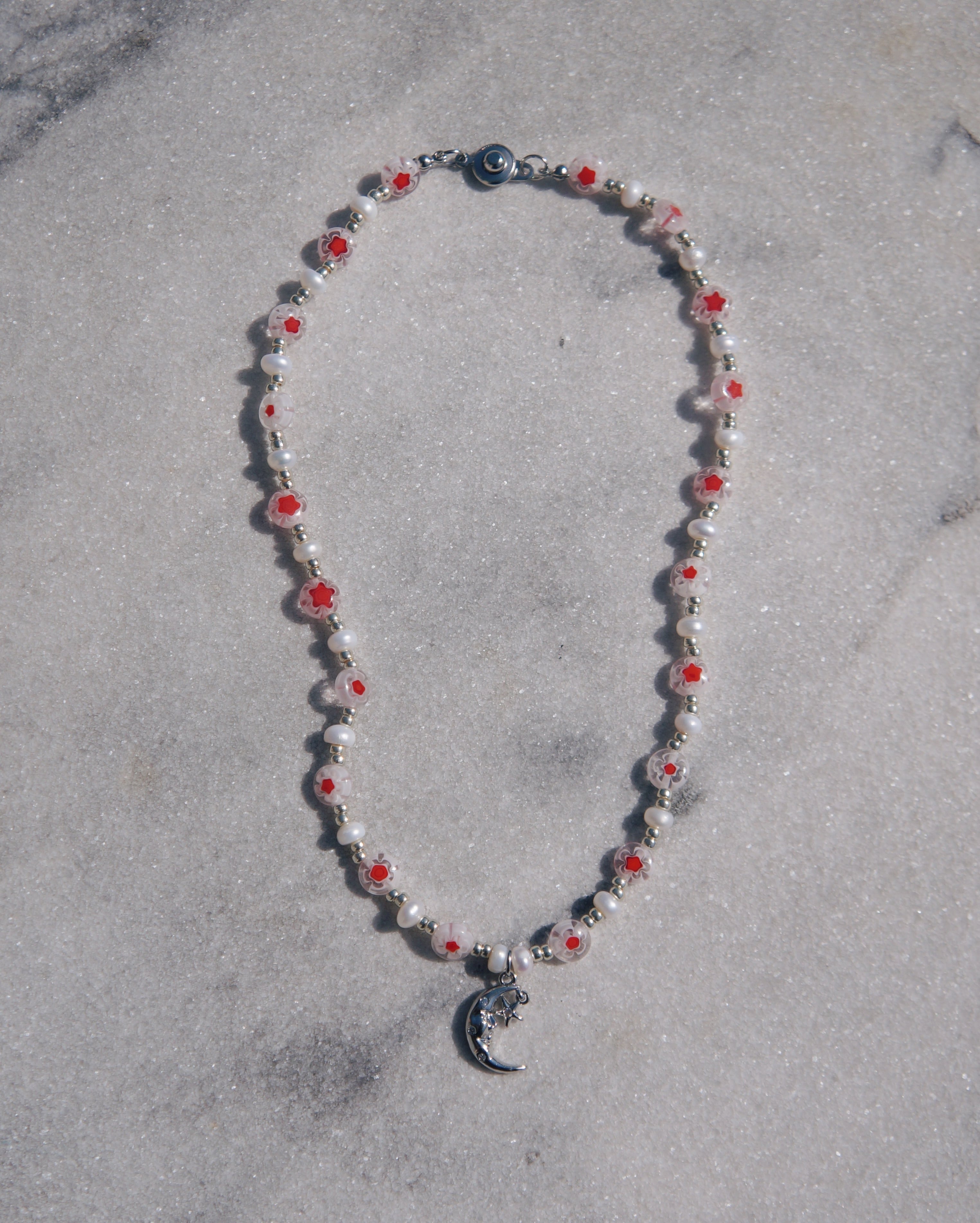 淡水パールとミルフィオリのガラスビーズ、三日月のチャームが美しいネックレスです。どんなスタイリングにも合わせやすいデザインでありながら、ユニークさもある一点です。