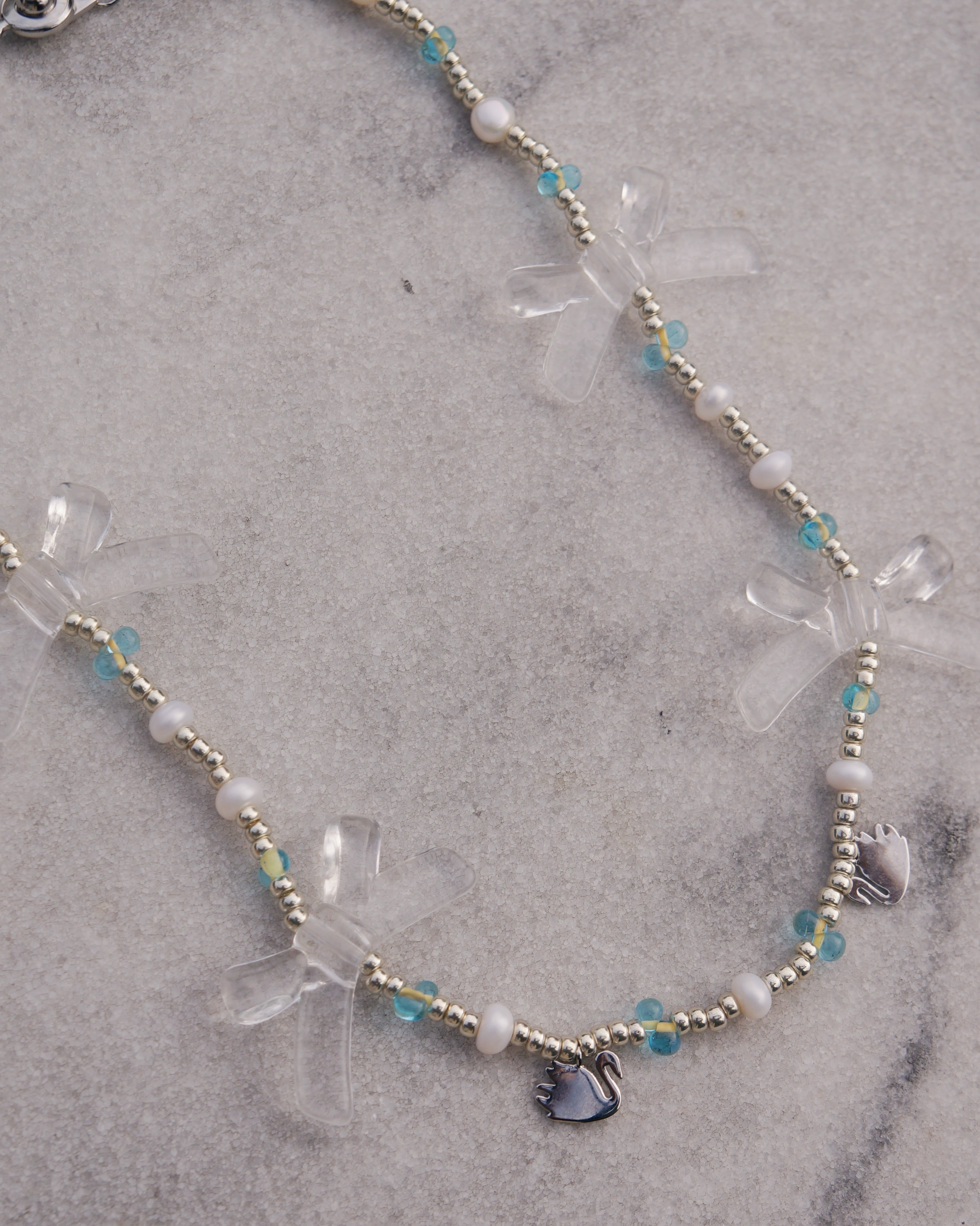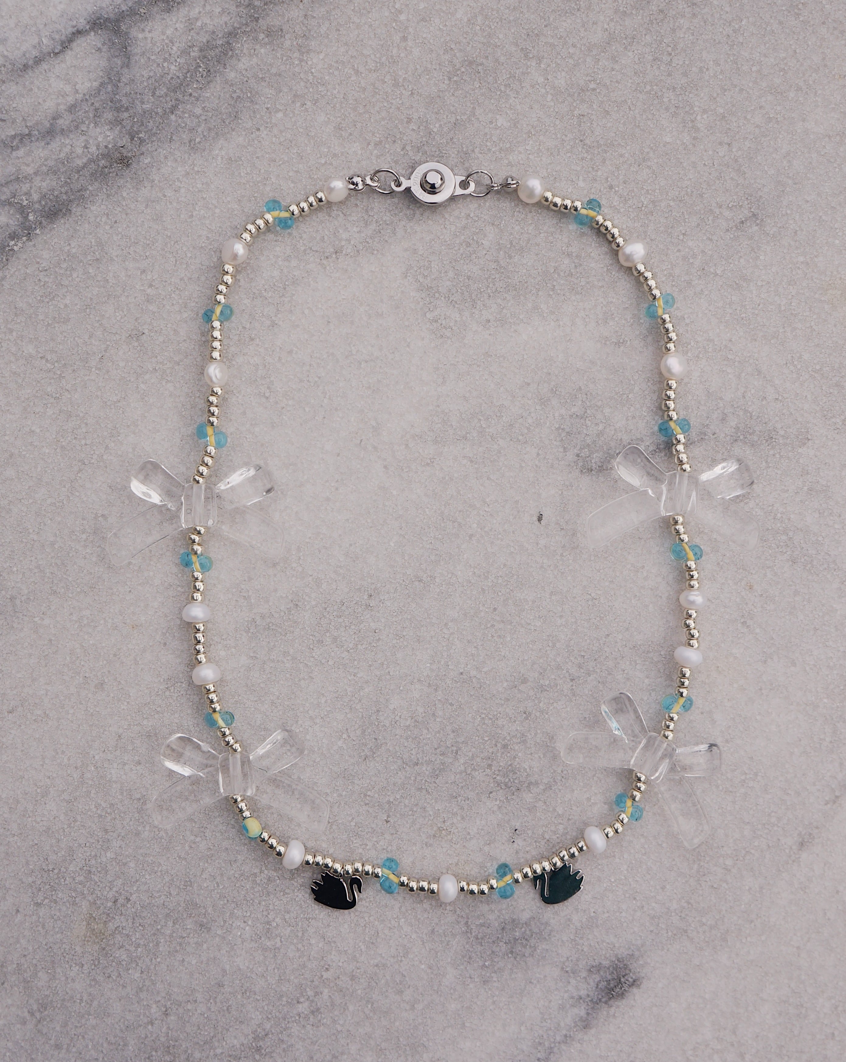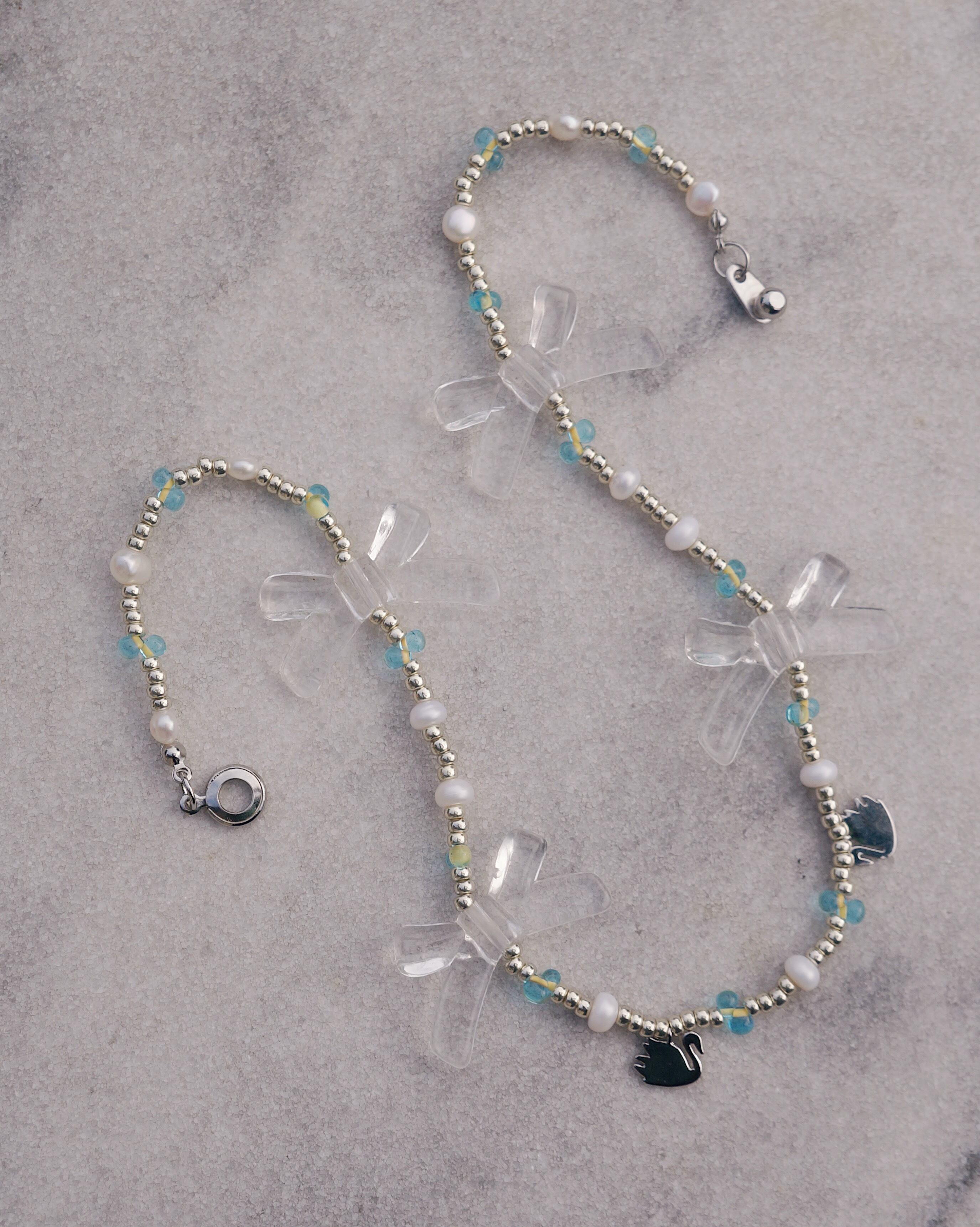 大きめのクリアカラーのリボンとさりげない2つの白鳥のチャームが見ているだけでキュンとするような可愛らしいネックレスです。シルバーと差し色で水色、そして淡水パールのビーズで甘すぎないカラーでまとめまたことで、クールなコーディネートにもフィットするようなデザインにしました。