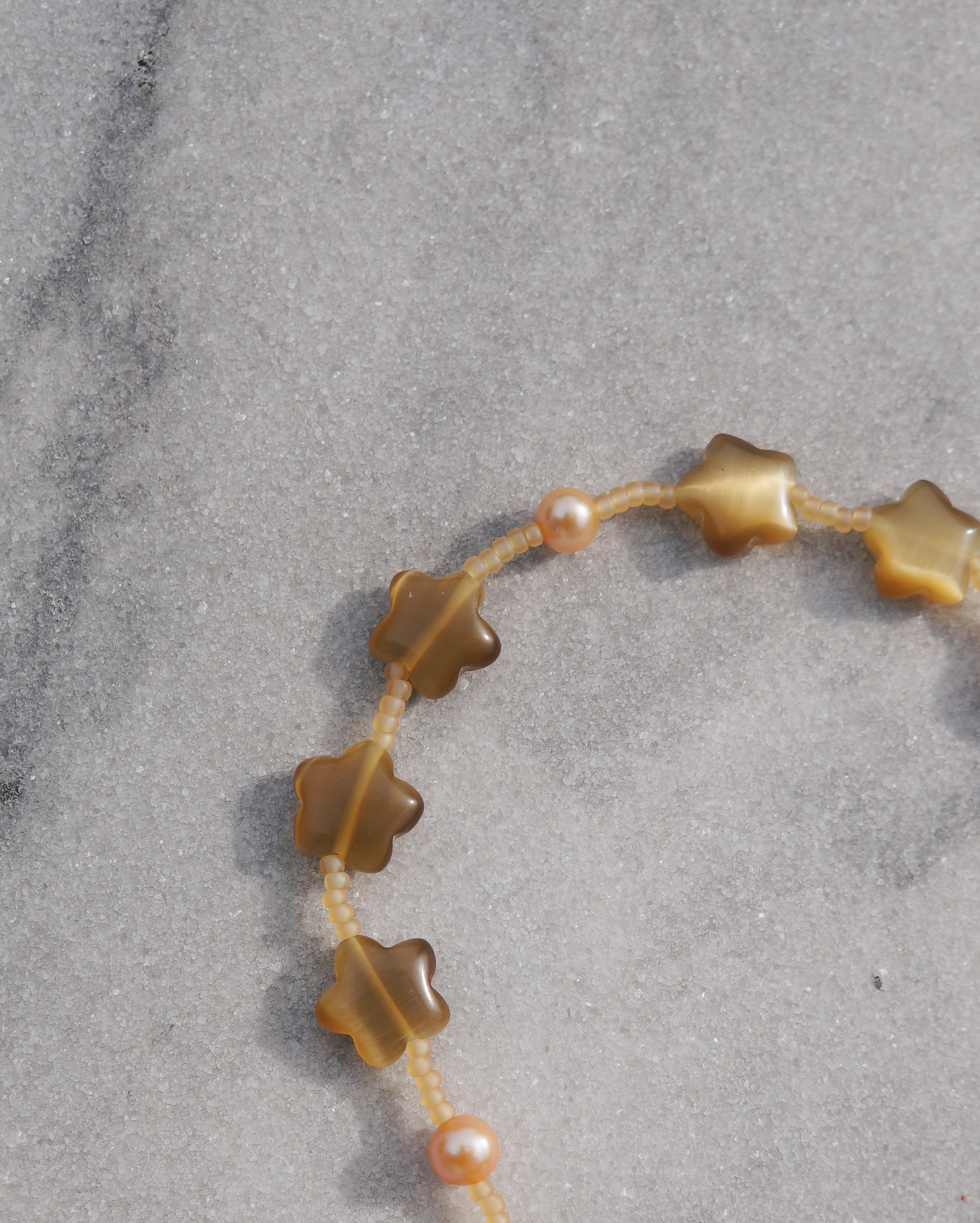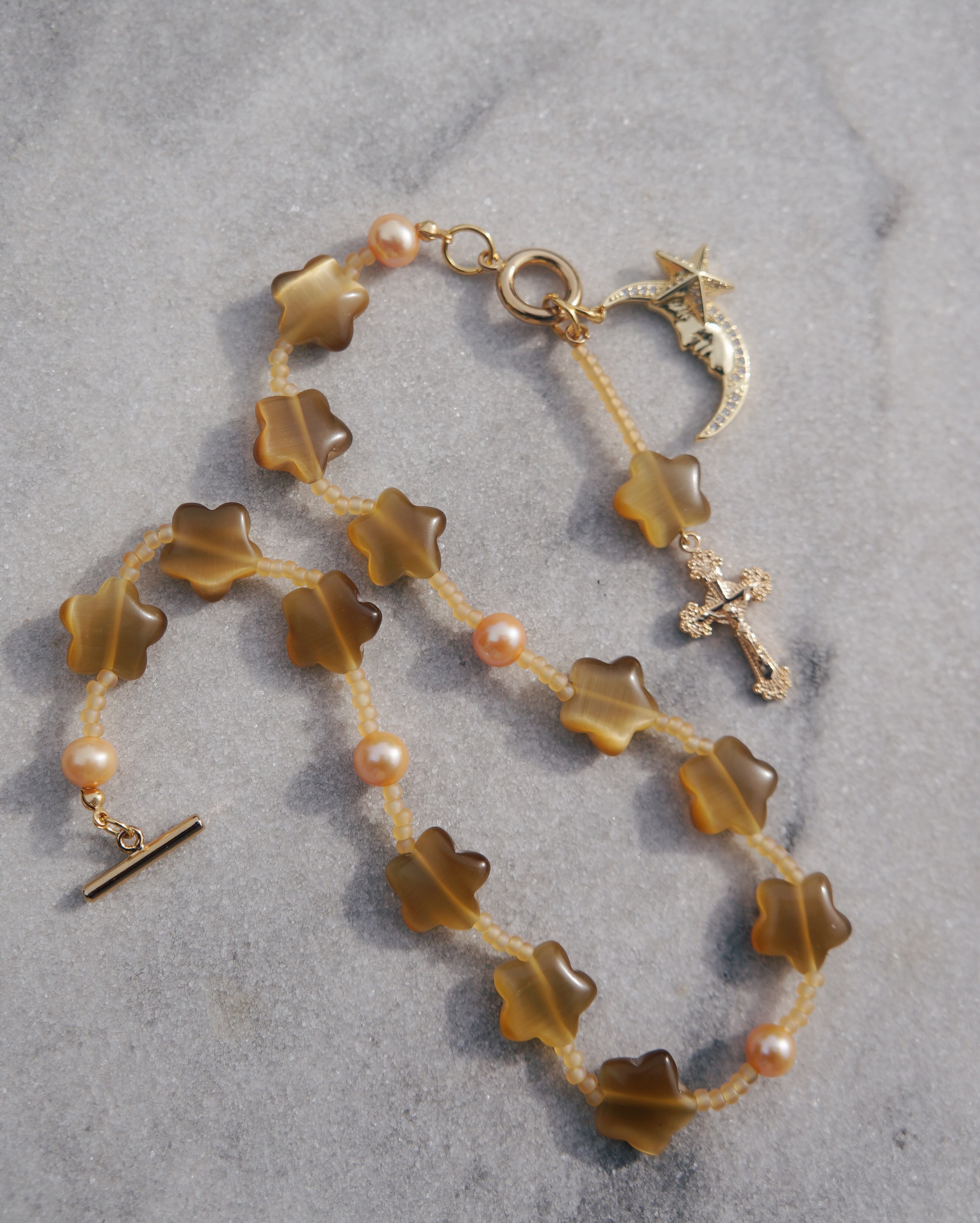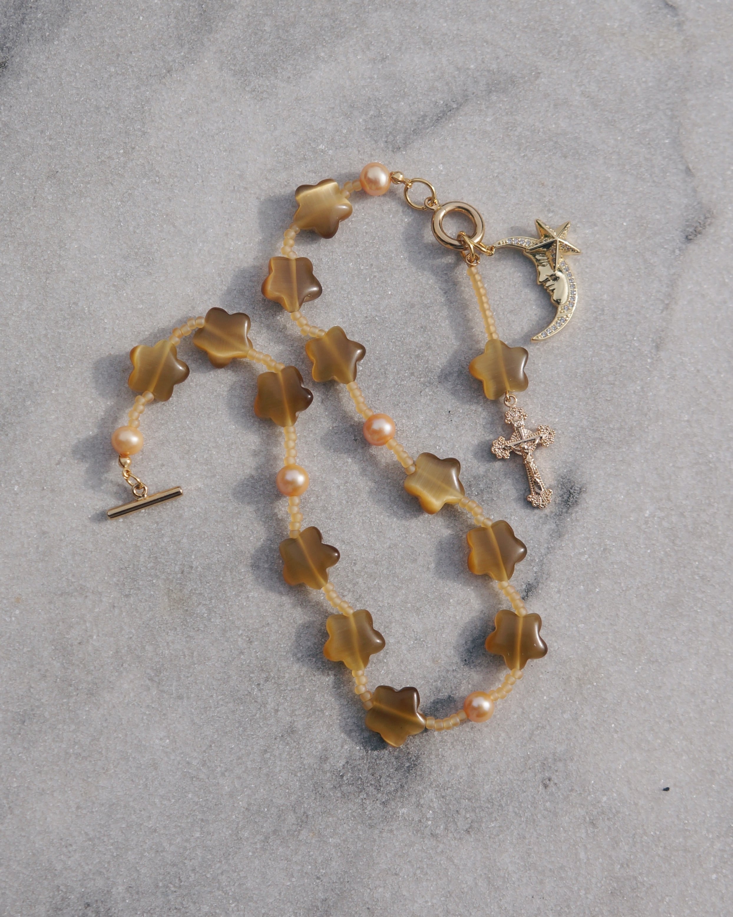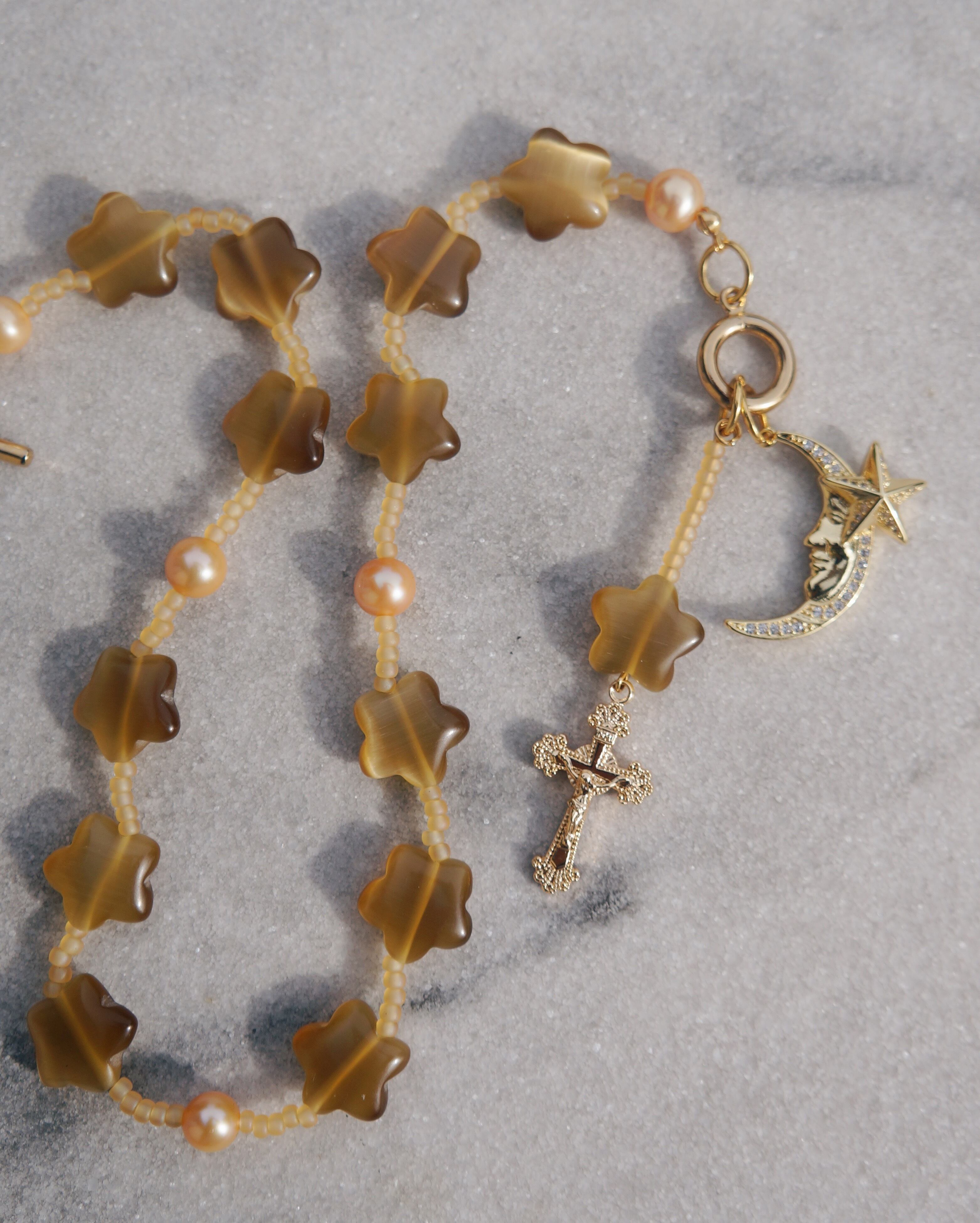 マンテルを前にもってきても、後ろにもってきても使える2WAYで楽しんでもらえるデザインです。キャッツアイの星のシェイプのビーズがポイントのネックレスです。十字架と月のチャームが華やかさと神秘的な雰囲気を出します。存在感はありますがカラーが落ち着いているため、どんなスタイリングにも合わせやすい一点です。