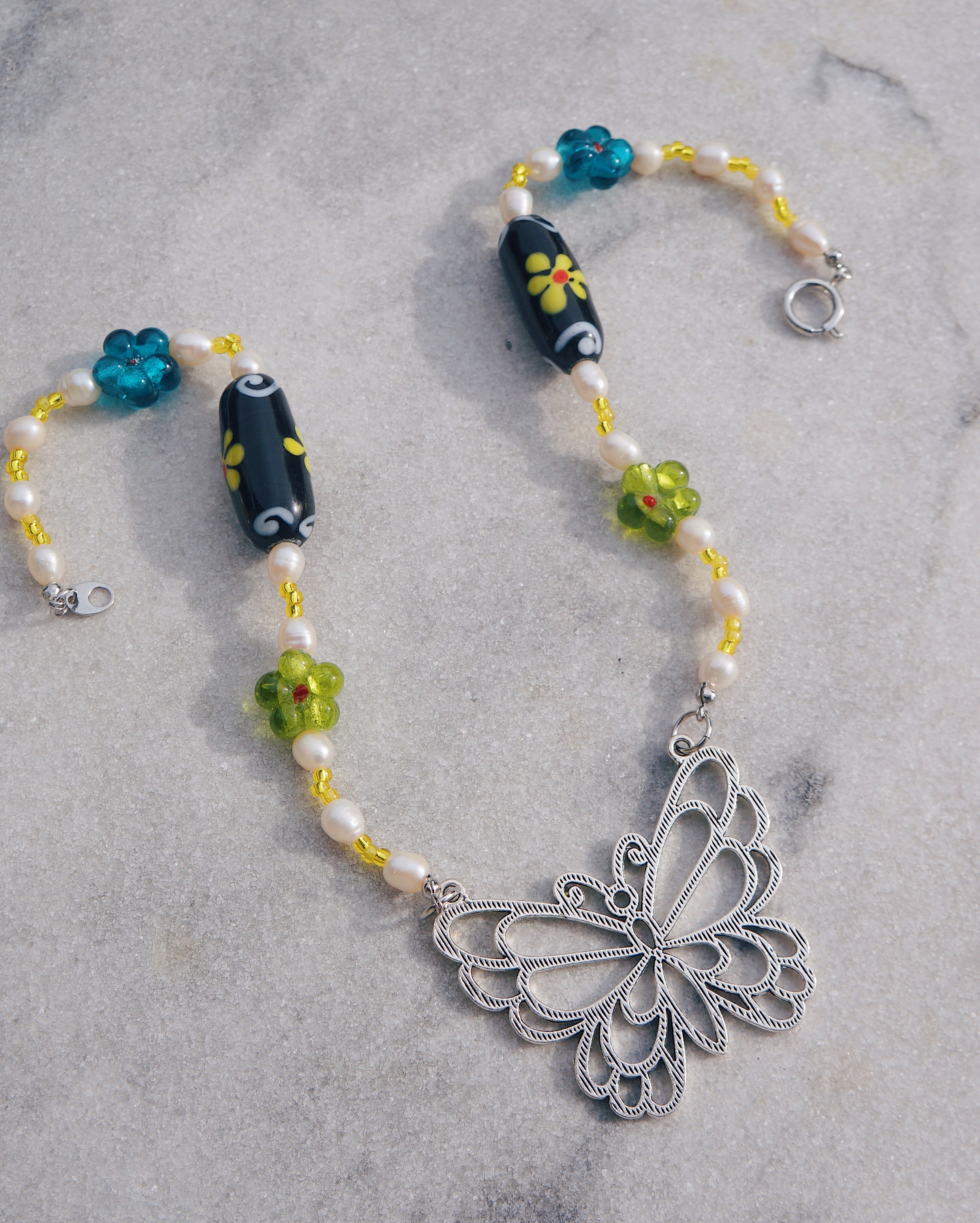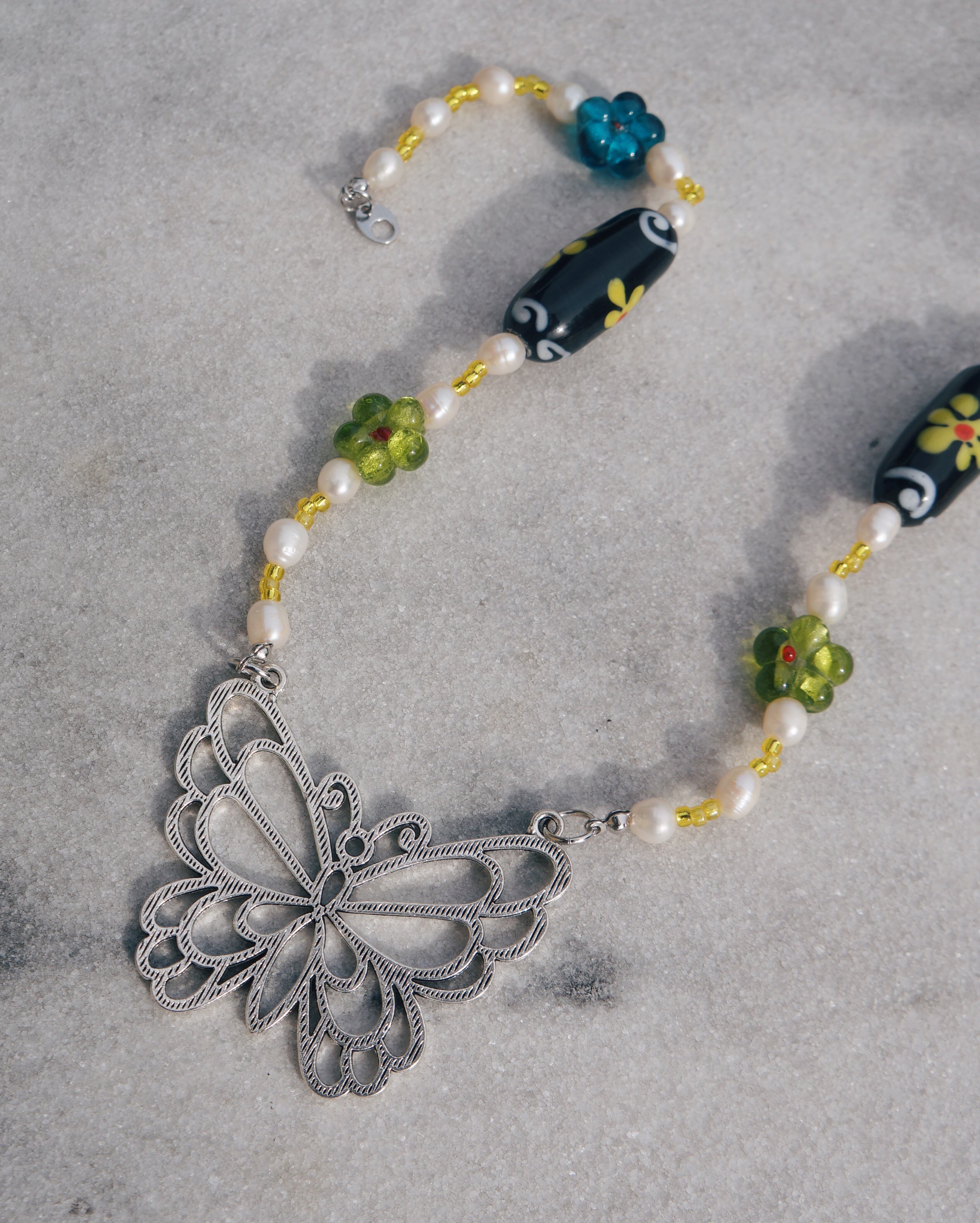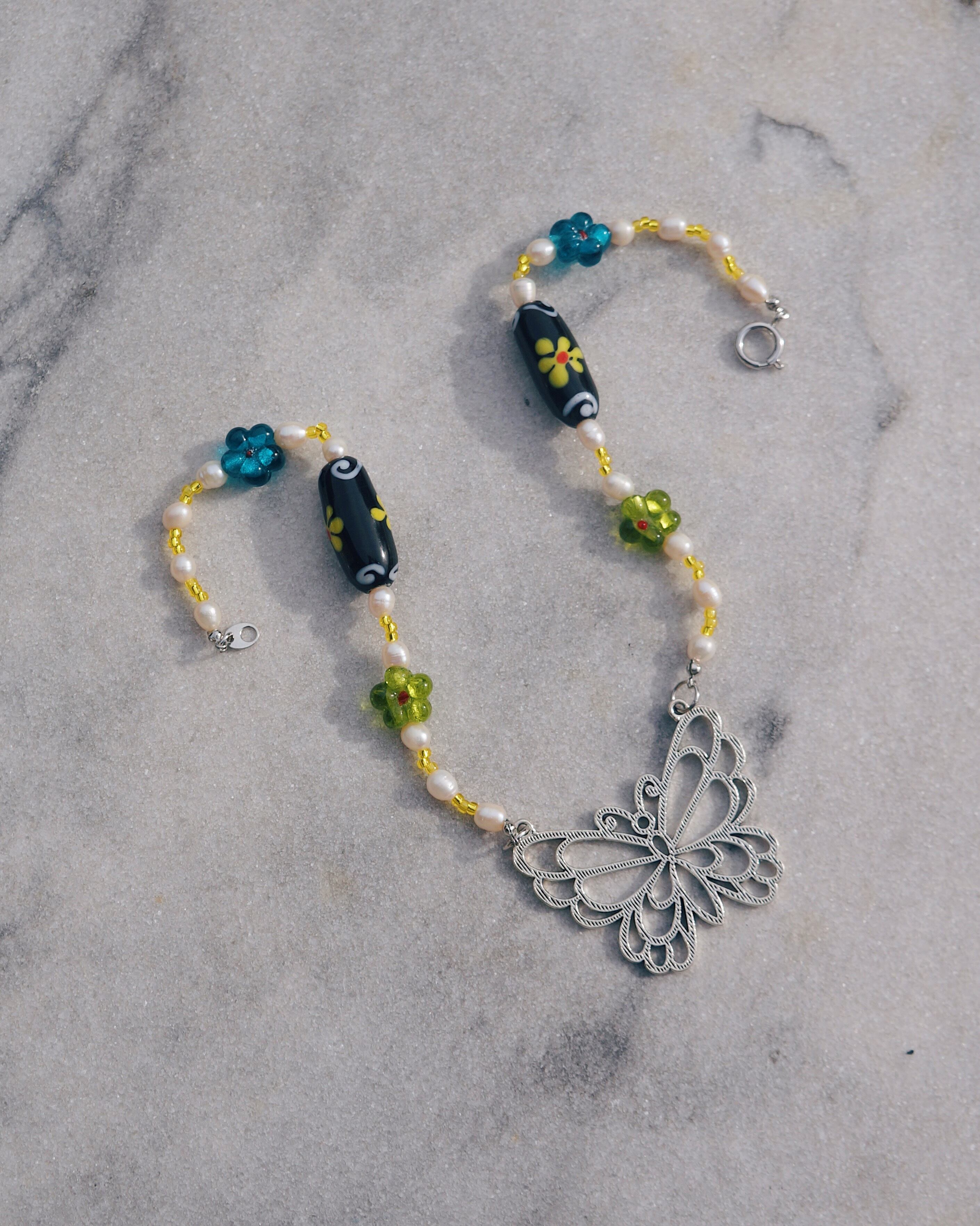 大ぶりの蝶のチャームがポイントのネックレスです。淡水パールやお花が描かれた大きいガラスのビーズ、緑や青のキュートなガラスのビーズを使い妖艶で美しいネックレスをデザインしました。