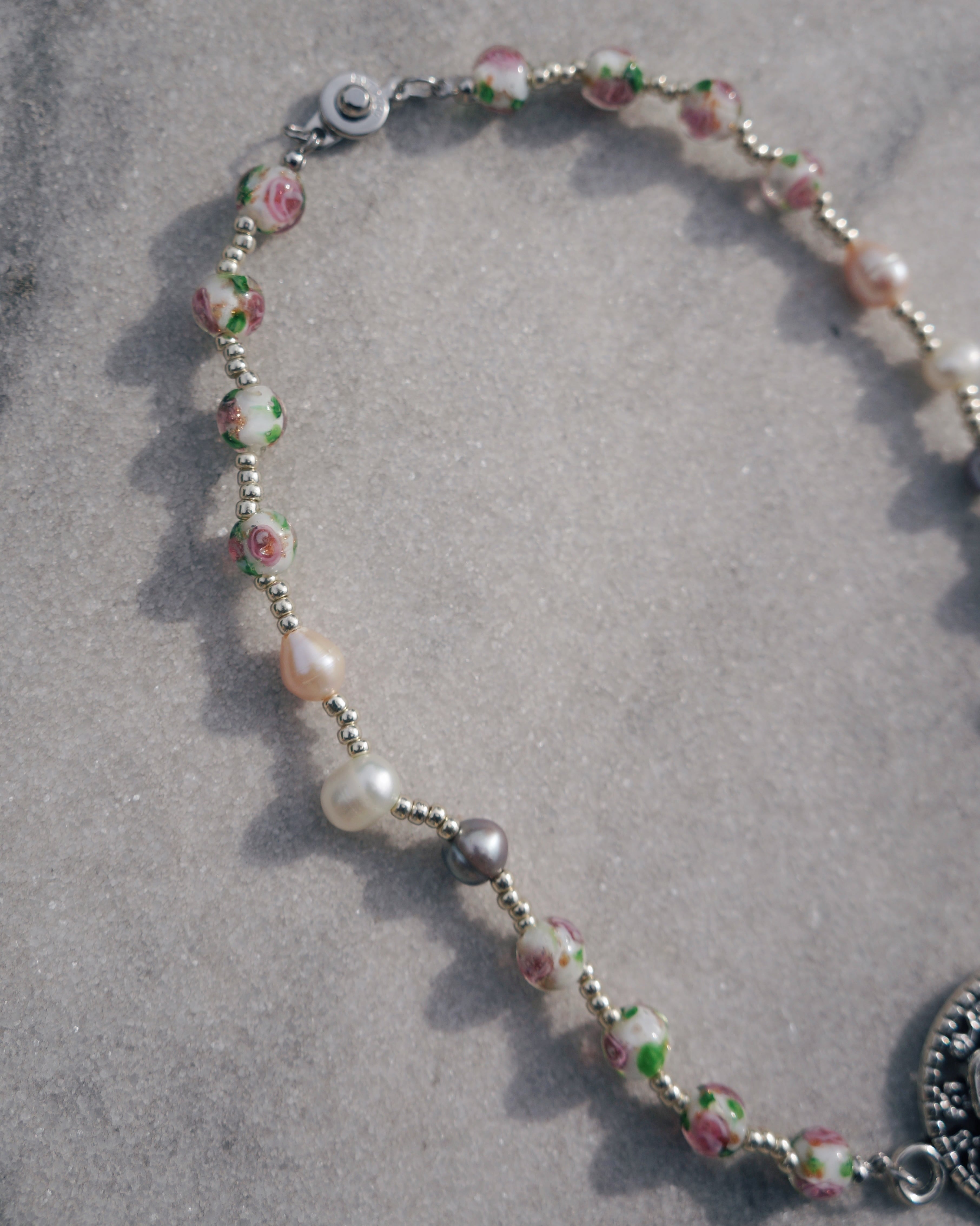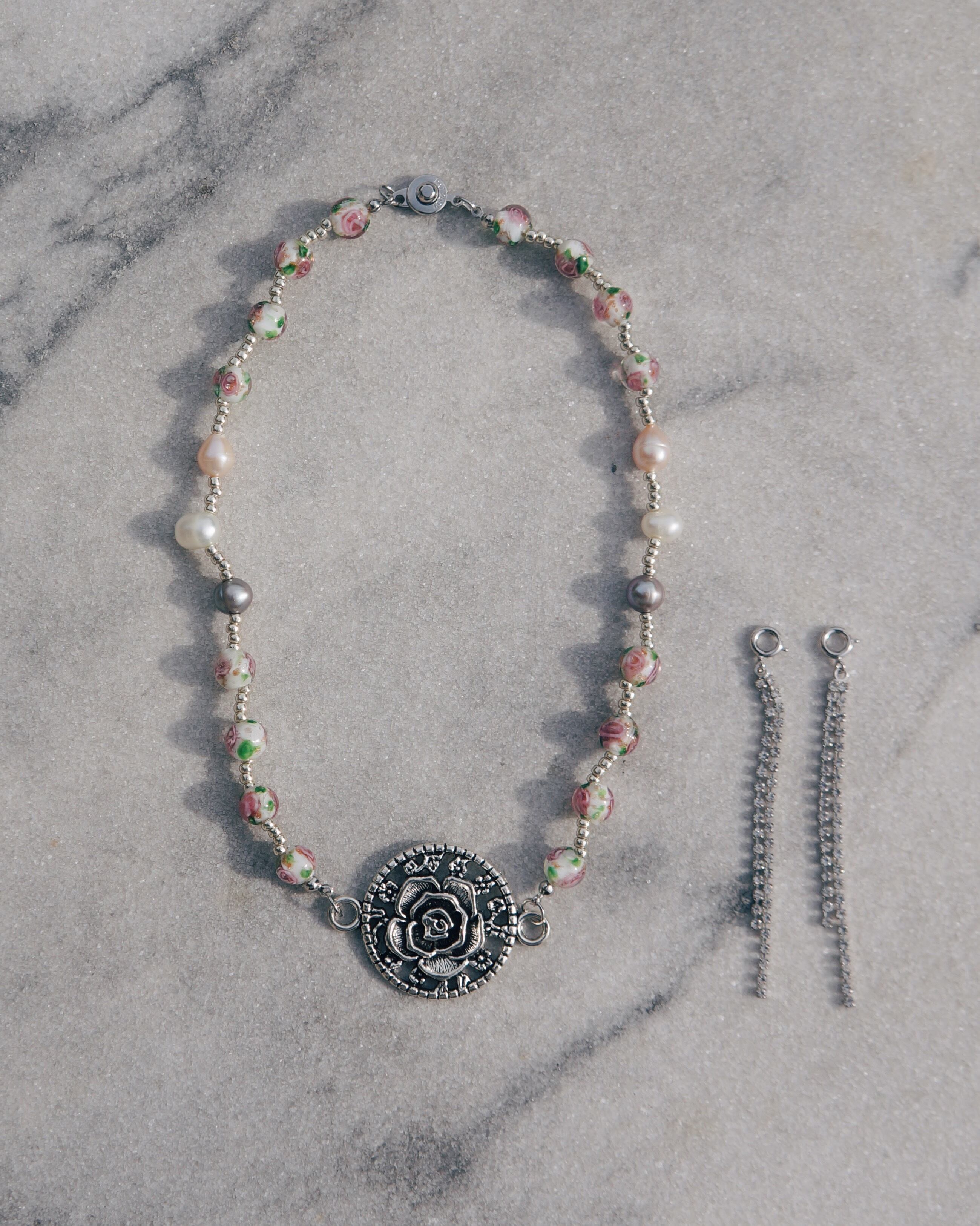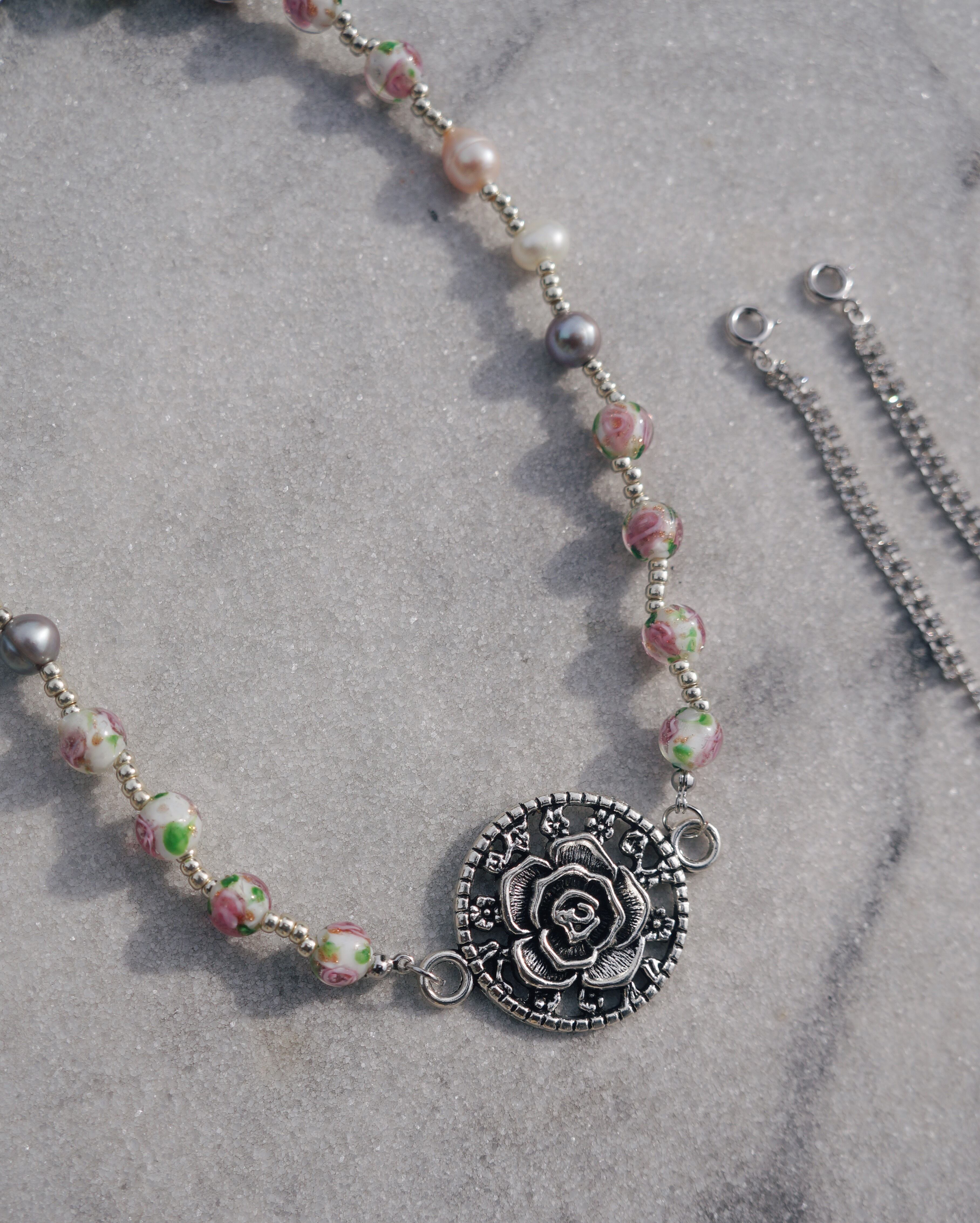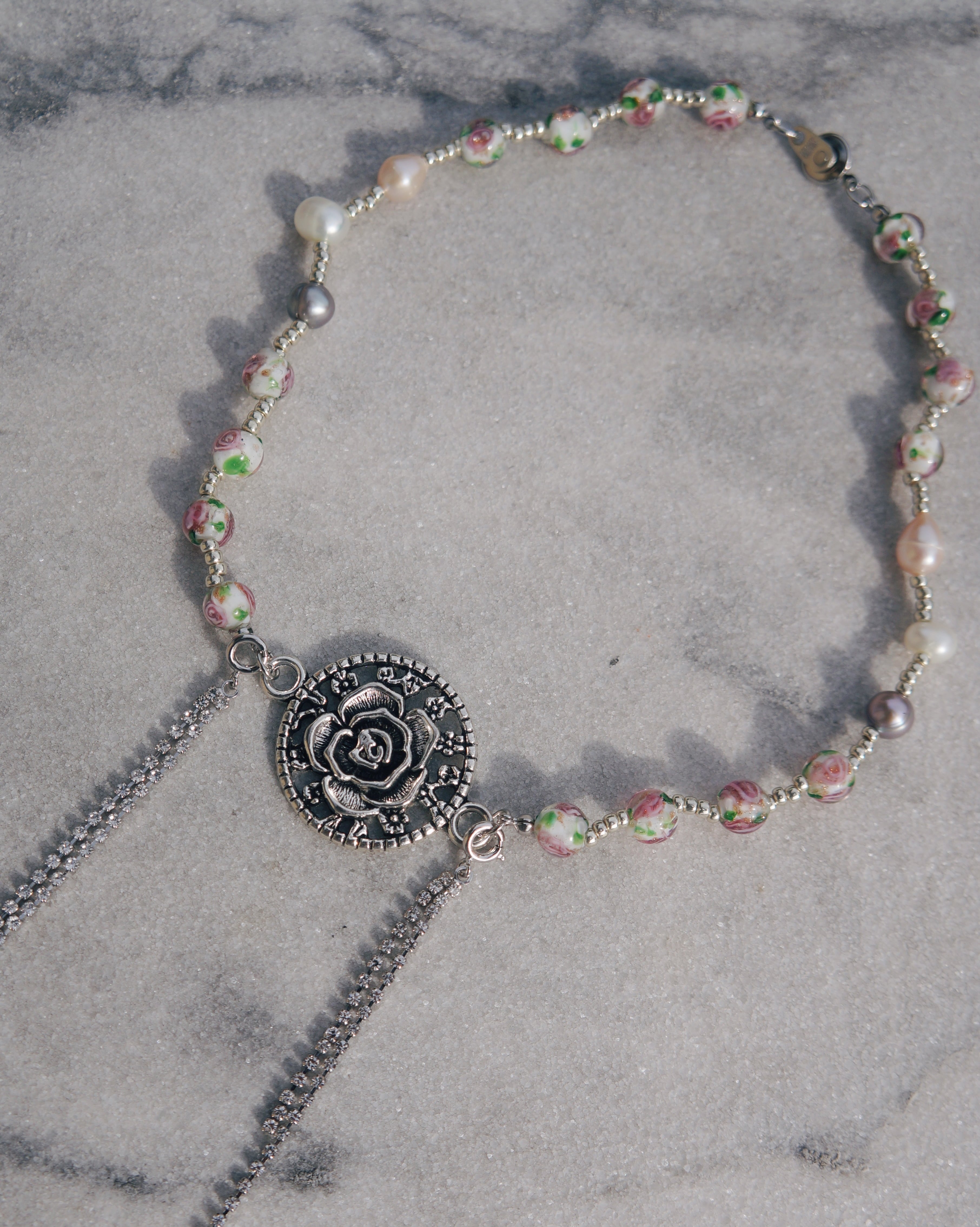 大ぶりのバラのチャームをデザインのメインにしたネックレスです。バラが描かれたランプワークビーズと淡水パールも美しいです。ダイヤチェーンは取り外しが可能なためその日の気分で楽しんでもらえます。