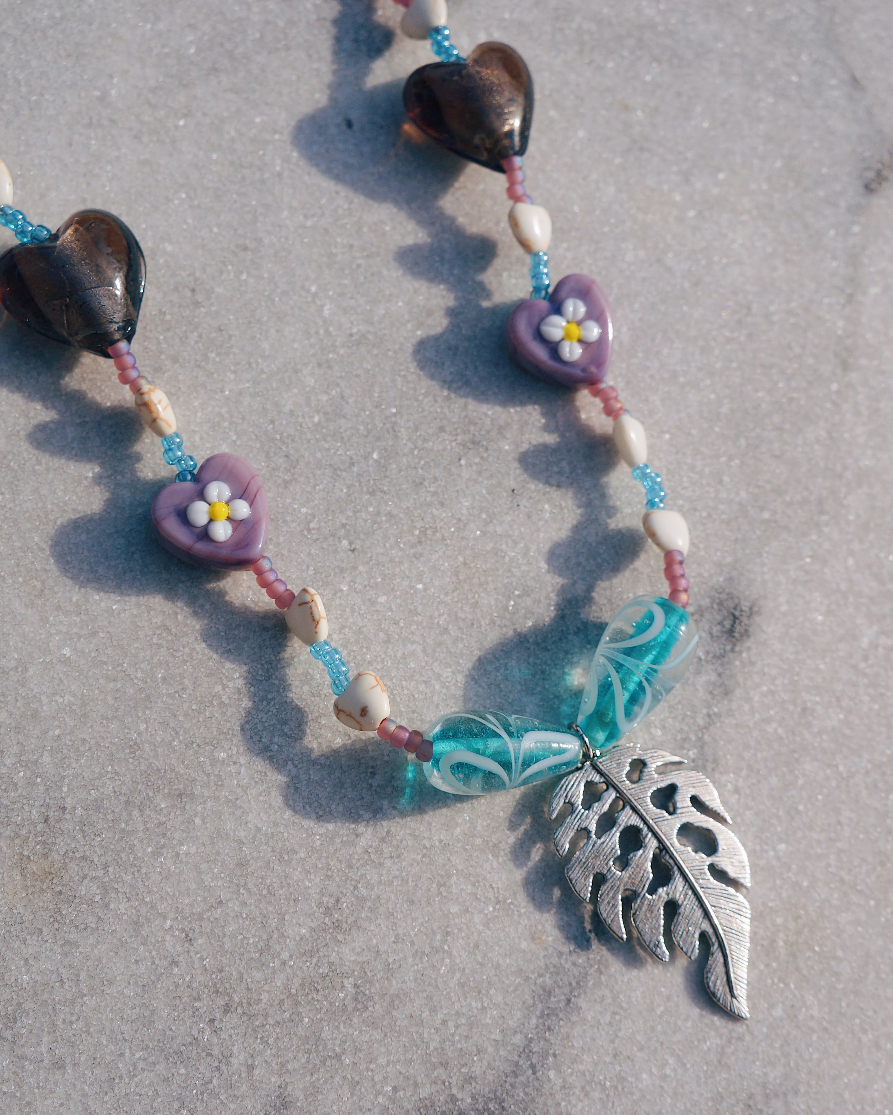 合成ハウライトのハートビーズとお花が描かれたランプワークビーズや大ぶりのガラスビーズ、そして葉っぱのチャームと全てのパーツに拘りとってもキュートなネックレスに仕上げました。