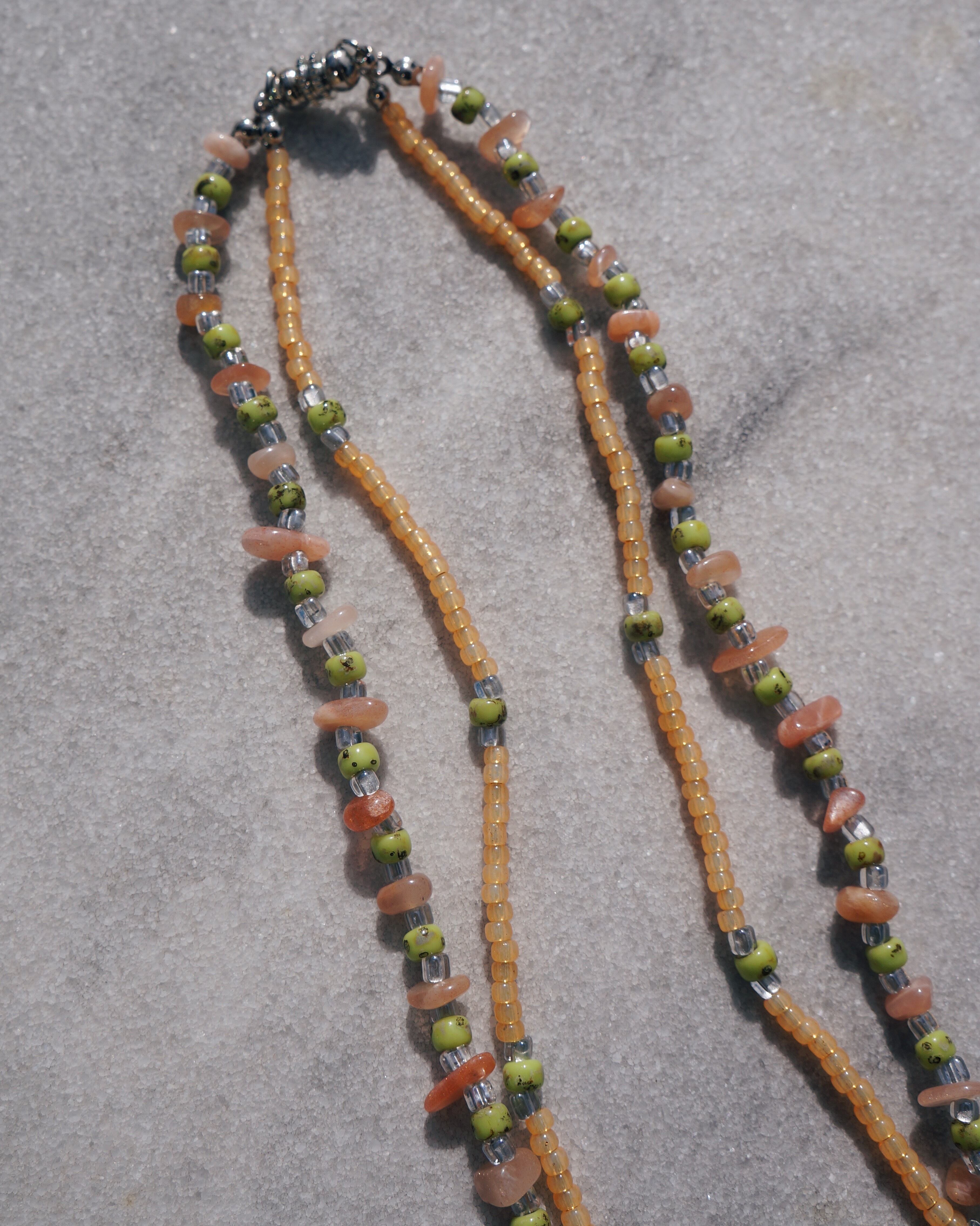 ビンテージライクな花のパーツとオレンジムーンストーンや様々なビーズの色合いが素敵なネックレスです。存在感がありながら、色合いはどのようなお洋服にも合わせやすいので、自分のスタイリングに合わせて楽しんで見て下さい。