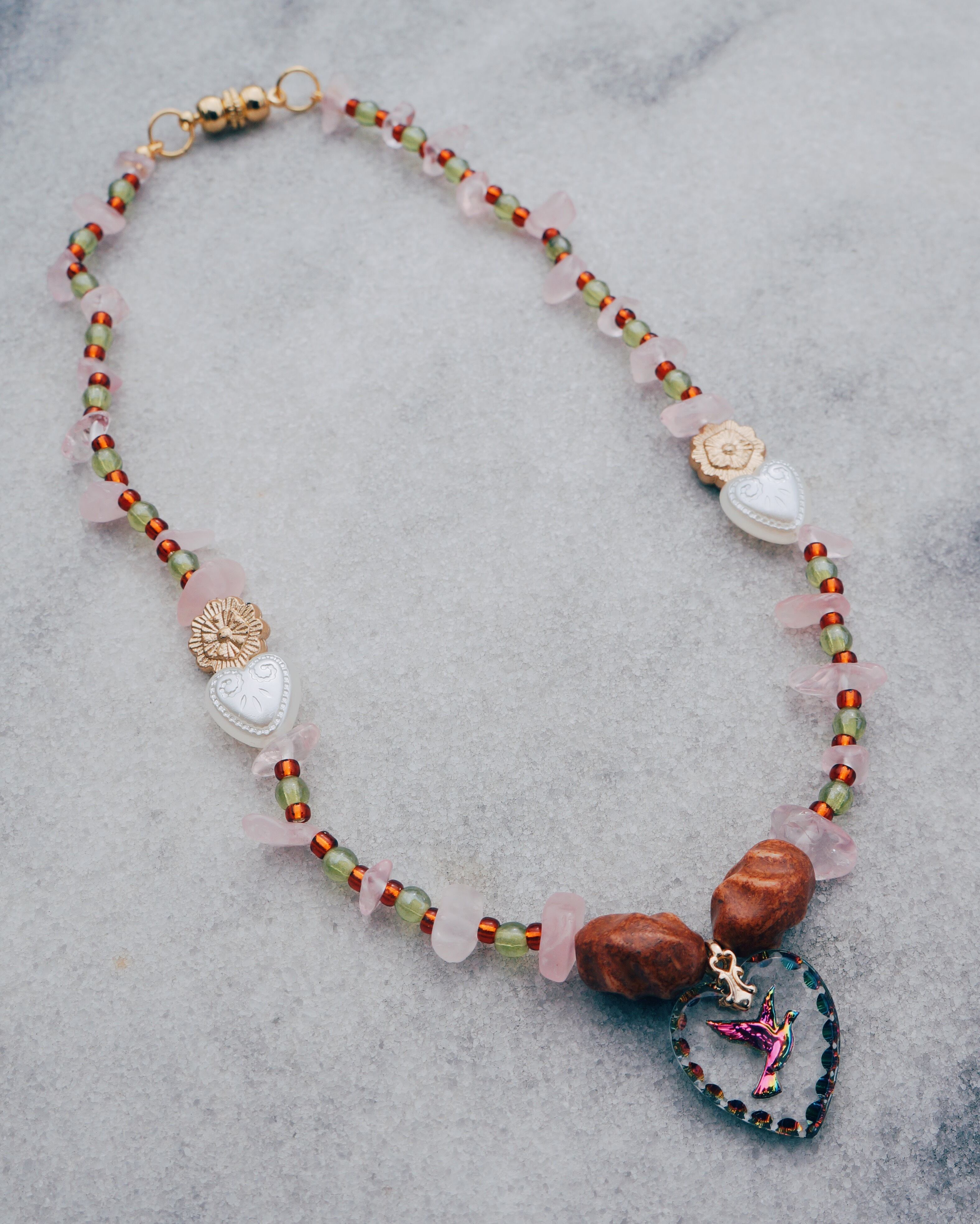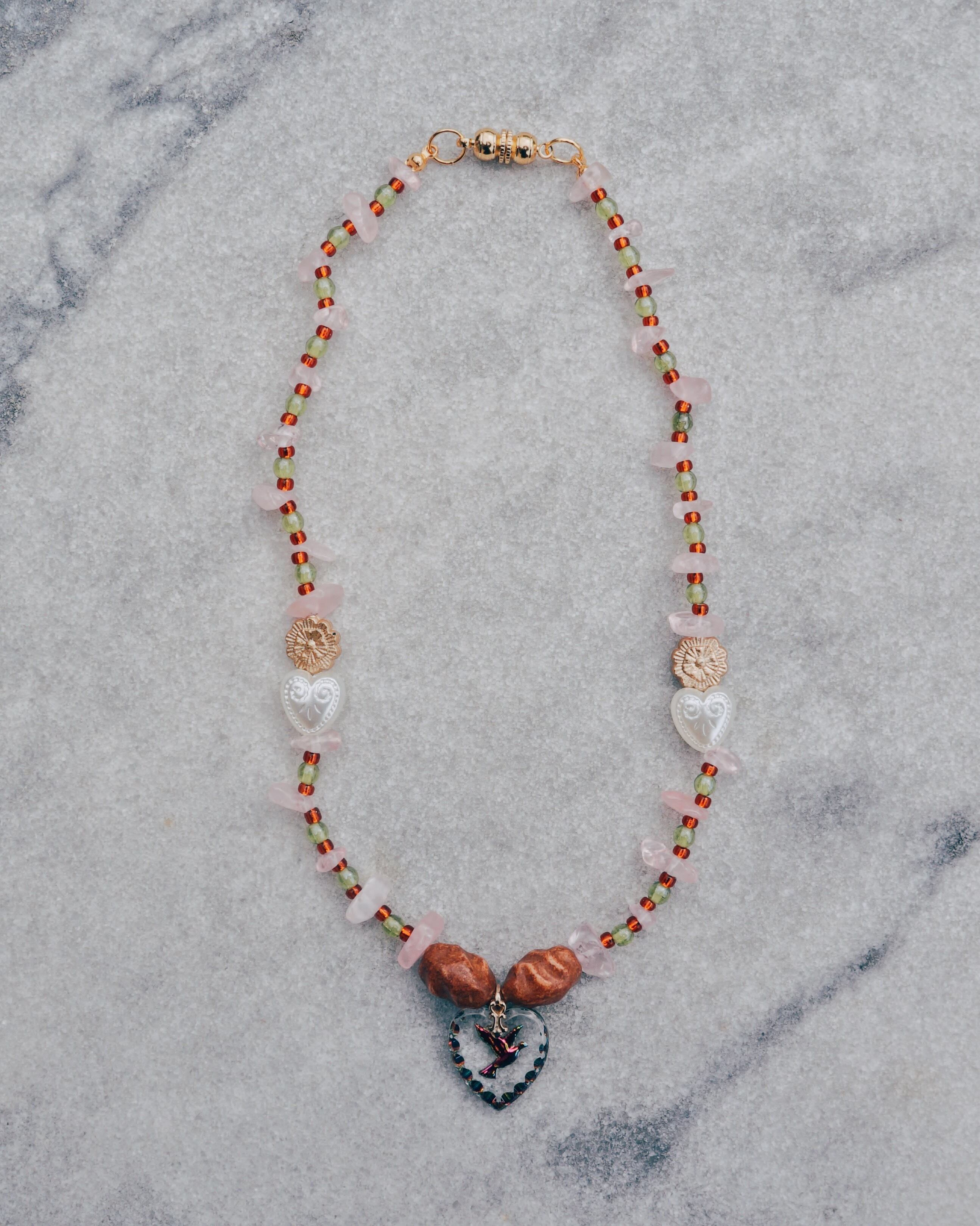 ドイツ製のレアなビンテージのインタリオのチャームを用いたネックレスです。インタリオにはツバメが彫られており、ツバメは幸せを運ぶ鳥として幸福の象徴とされています。そのツバメに合わせカラーとデザインは心穏やかになるようなものになりました。このネックレスがあなたにとってちょっとした幸福のお守りのようなものになりますように。