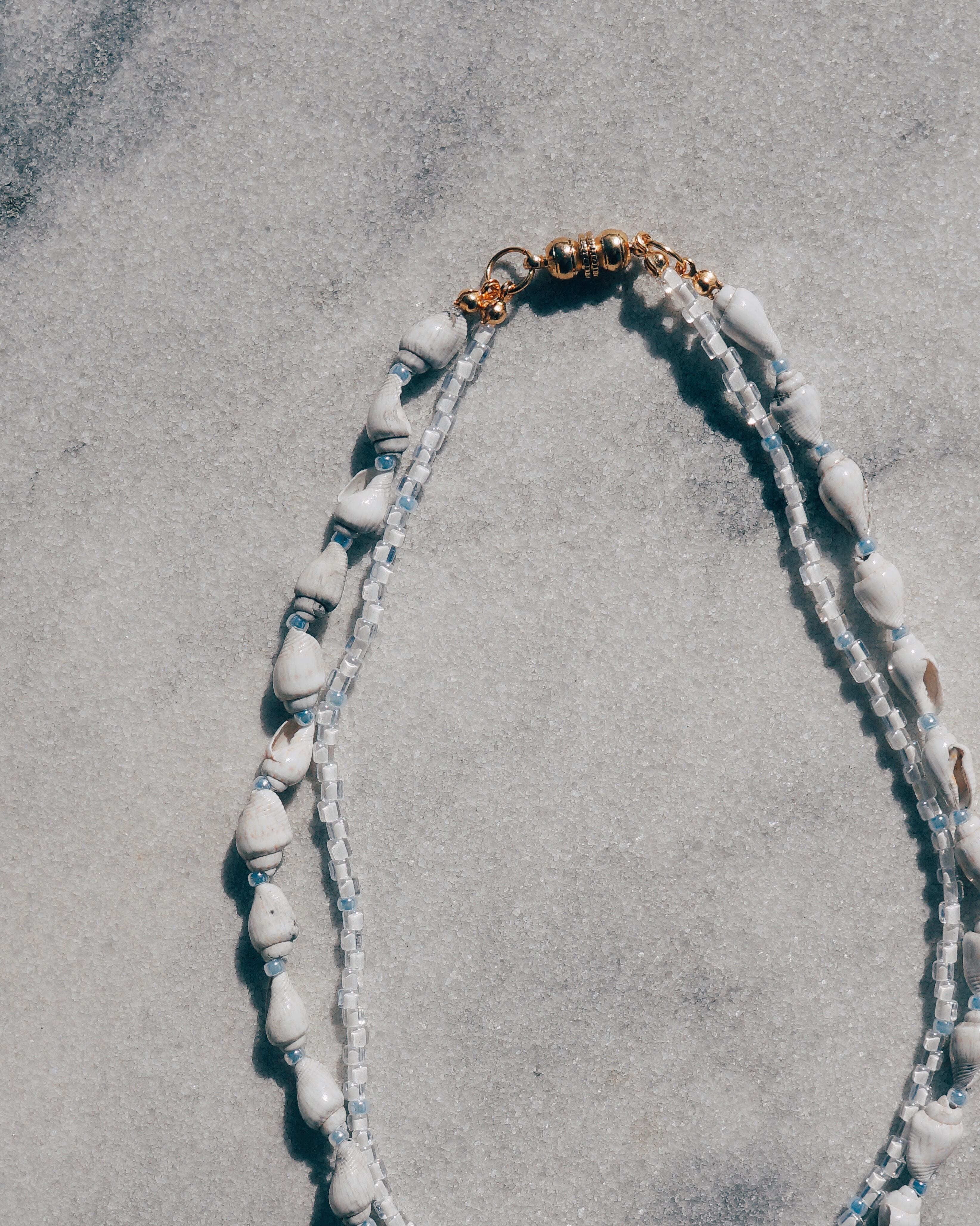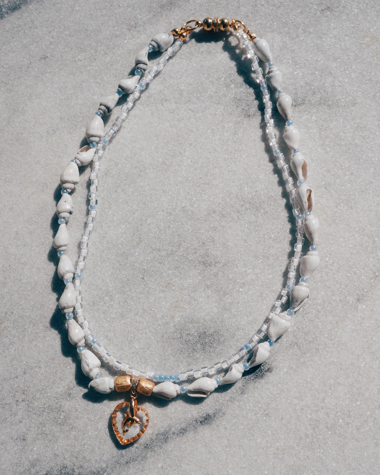 ドイツ製のレアなビンテージのインタリオのチャームを用いたネックレスです。インタリオにはイルカが彫られており、綺麗な砂浜のビーチをイメージしてデザインしたネックレスです。巻き貝のビーズがキュートであり、ビーチで貝を拾うような癒しの時間が少しでもこれを身につけた時に感じてもらえますように。