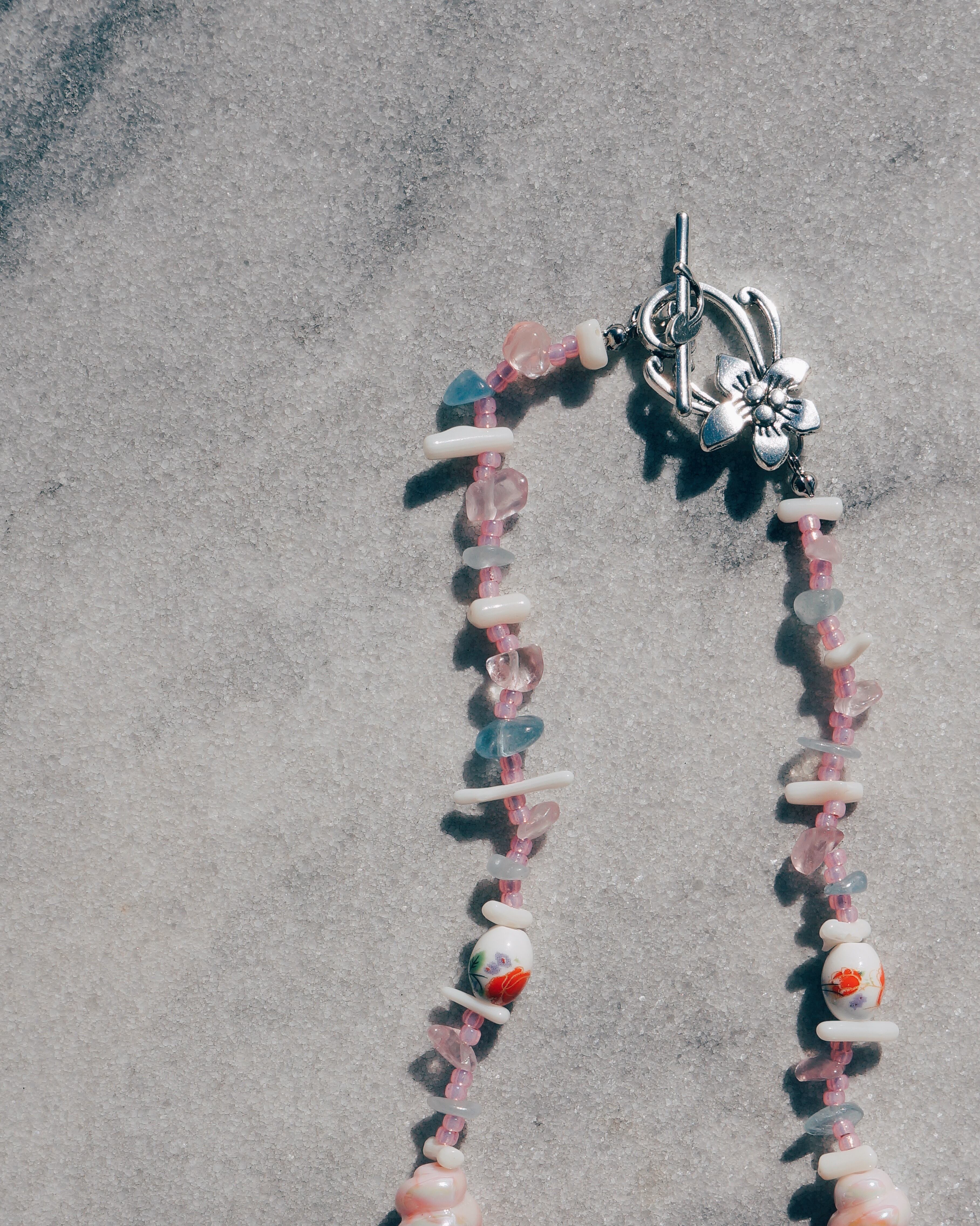 様々なビーズや天然石、珊瑚など沢山詰め込んで薄ピンクの雲が浮かんでいるような楽園をイメージしてデザインした一点です。パーツ一つ一つがキュンとするような可愛さでこれを身につけた時にはいつもより更に笑顔になれますように。