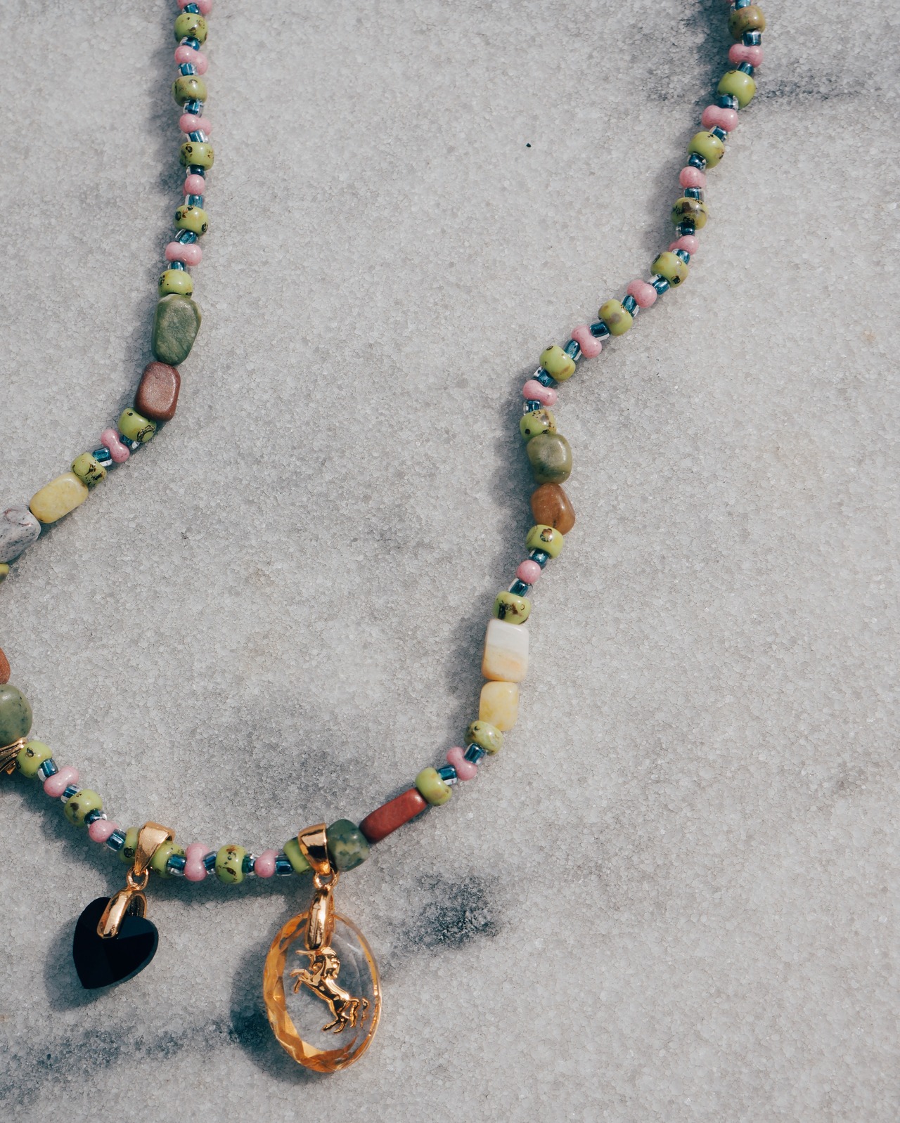 ビーズのカラーコンビネーションと3つのチャームが素敵なネックレスです。ユニコーンのインタリオに合わせてキュートなイメージでありながら、優しい色味でまとめ何か身につけていると穏やかな気持ちになってもらえればいいなと思いデザインしました。